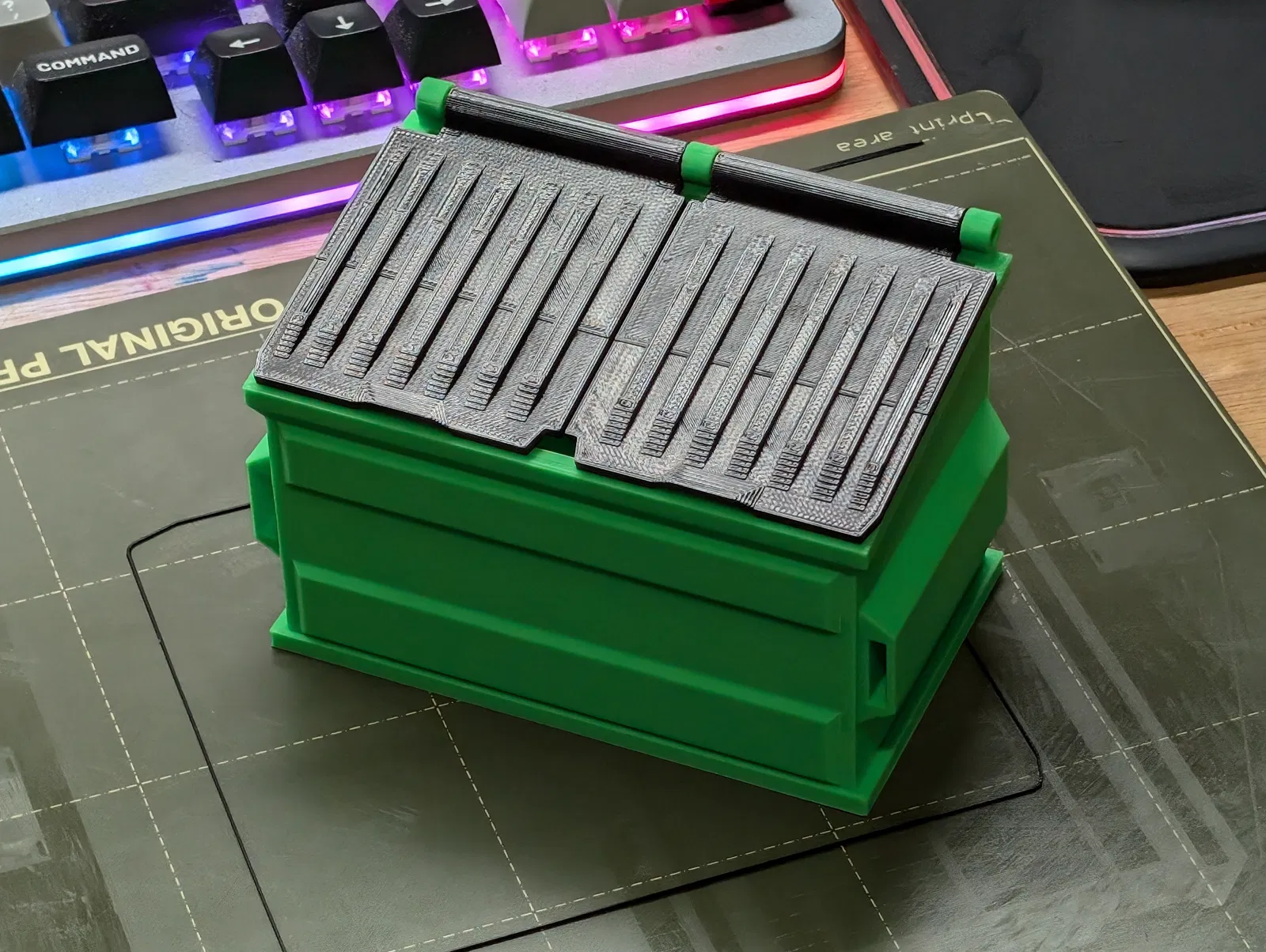 Nắp gài thay thế cho thùng rác mini để bàn, có thể gắn trực tiếp vào thùng. Cập nhật mới nhất hướng dẫn cách tránh làm gãy bản lề khi sử dụng. Hỗ trợ in bằng PLA và PETG, có thể cần supports tùy thuộc vào cài đặt.
