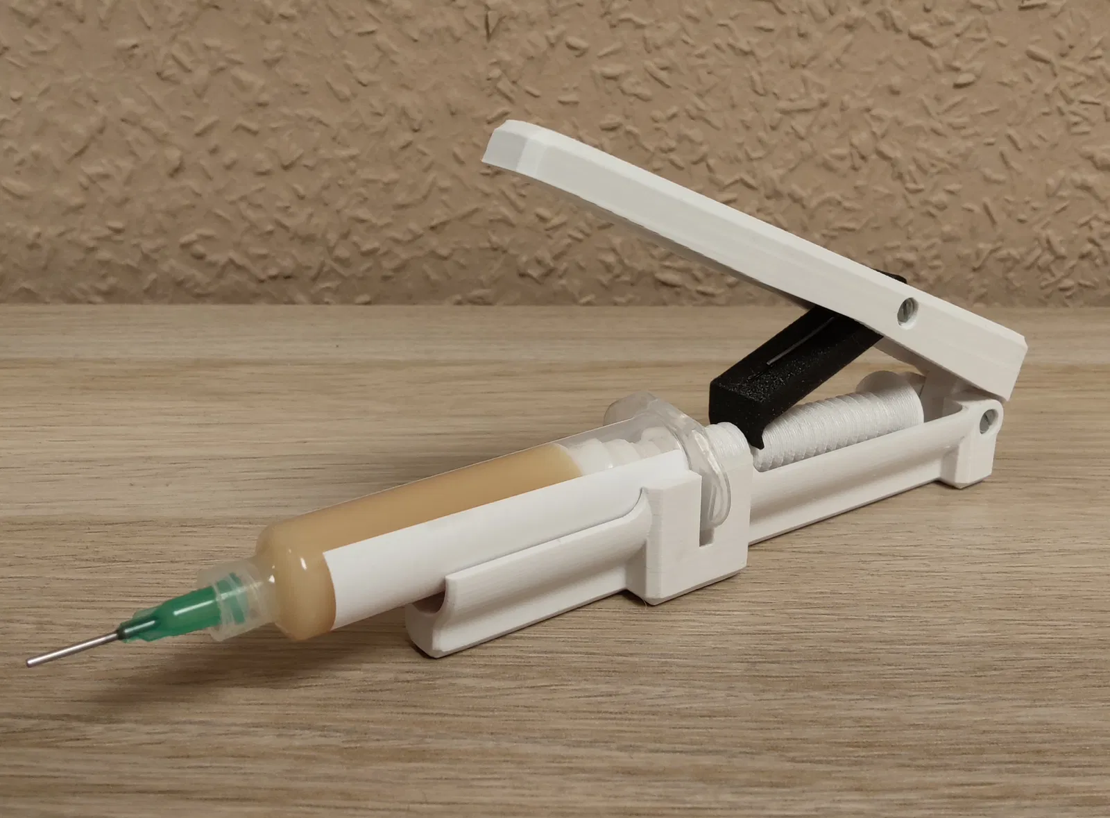 Đây là bản remix của bản remix (từ Elektroarzt) của dự án Thingiverse hay ho (từ mordaha) cho một bộ phận phân phối Flux/Paste đẹp mắt mà tôi đã tối ưu hóa hơn nữa. Việc bổ sung một điểm dừng giới hạn góc mở của tay cầm, kết hợp với thiết kế lò xo tốt hơn và cơ chế bánh cóc cho pít-tông cho phép sử dụng rảnh tay, dễ dàng chỉ bằng một tay.