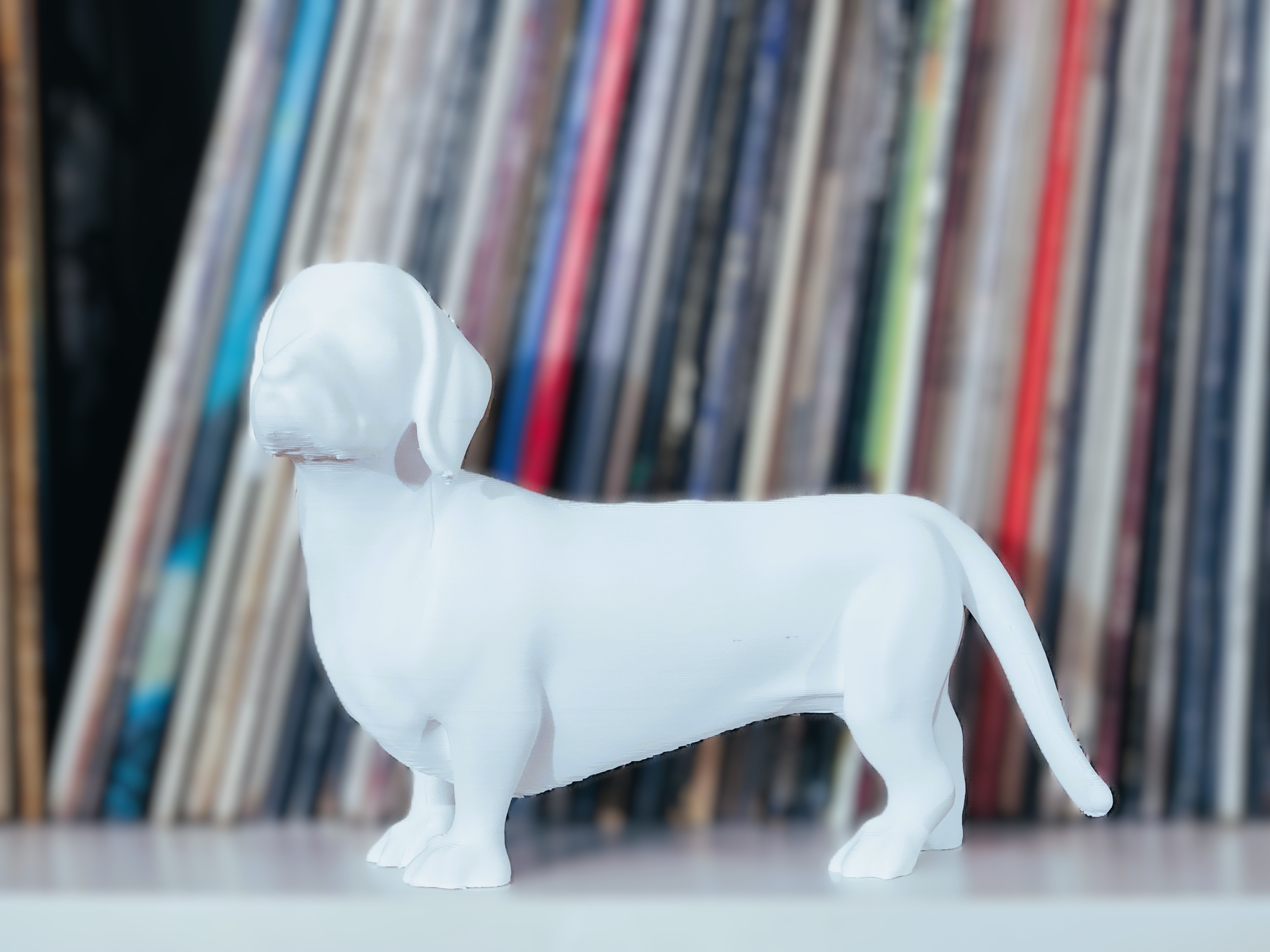 Tượng chó Dachshund đứng thẳng. Mô tả tóm tắt là "Chết từ mắt cá chân". Thích hợp cho người yêu chó, tượng trang trí, hoặc mô hình sưu tập. Vật liệu in phù hợp: PLA, ABS, PETG. Định dạng file: STL.
