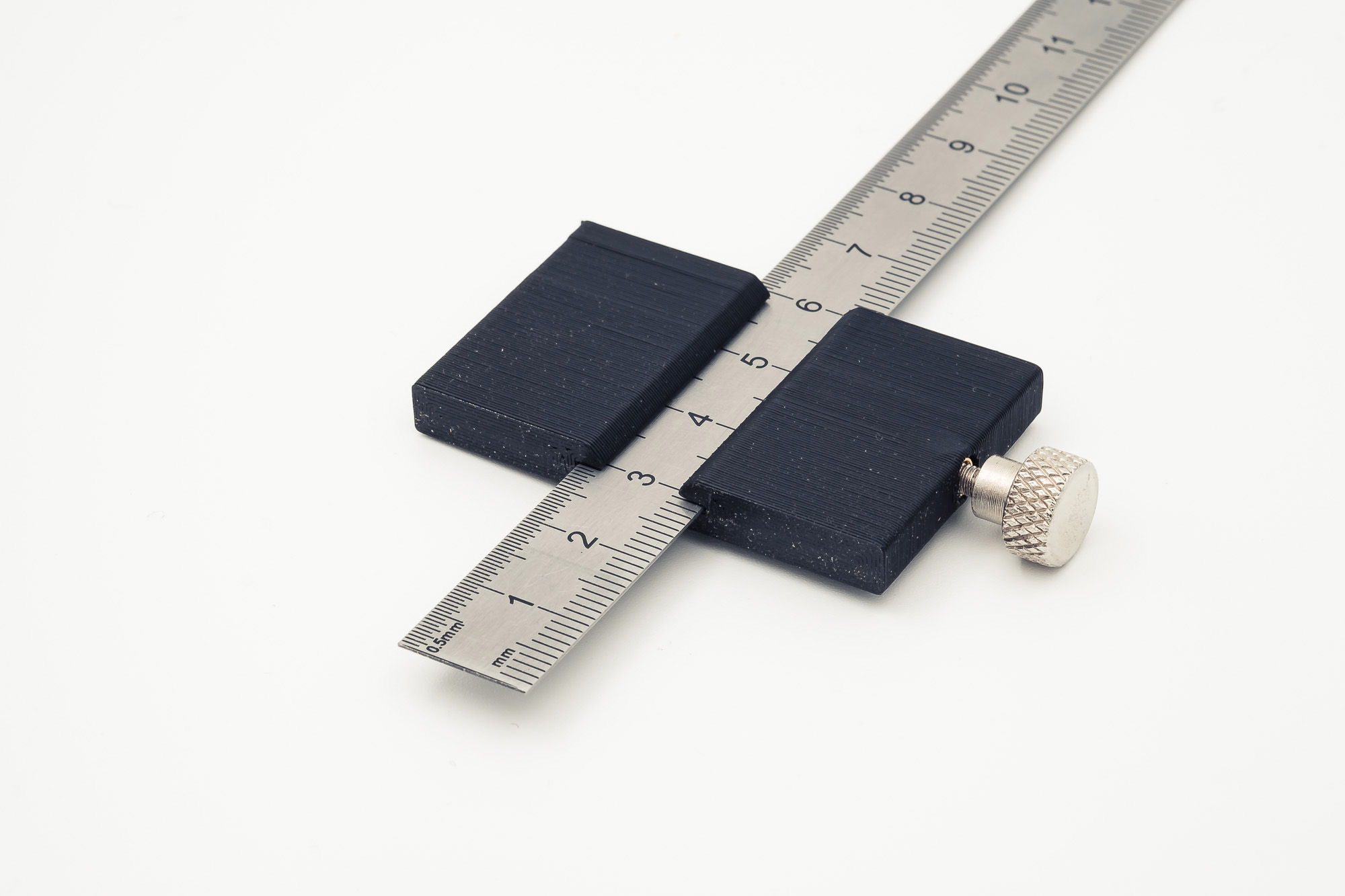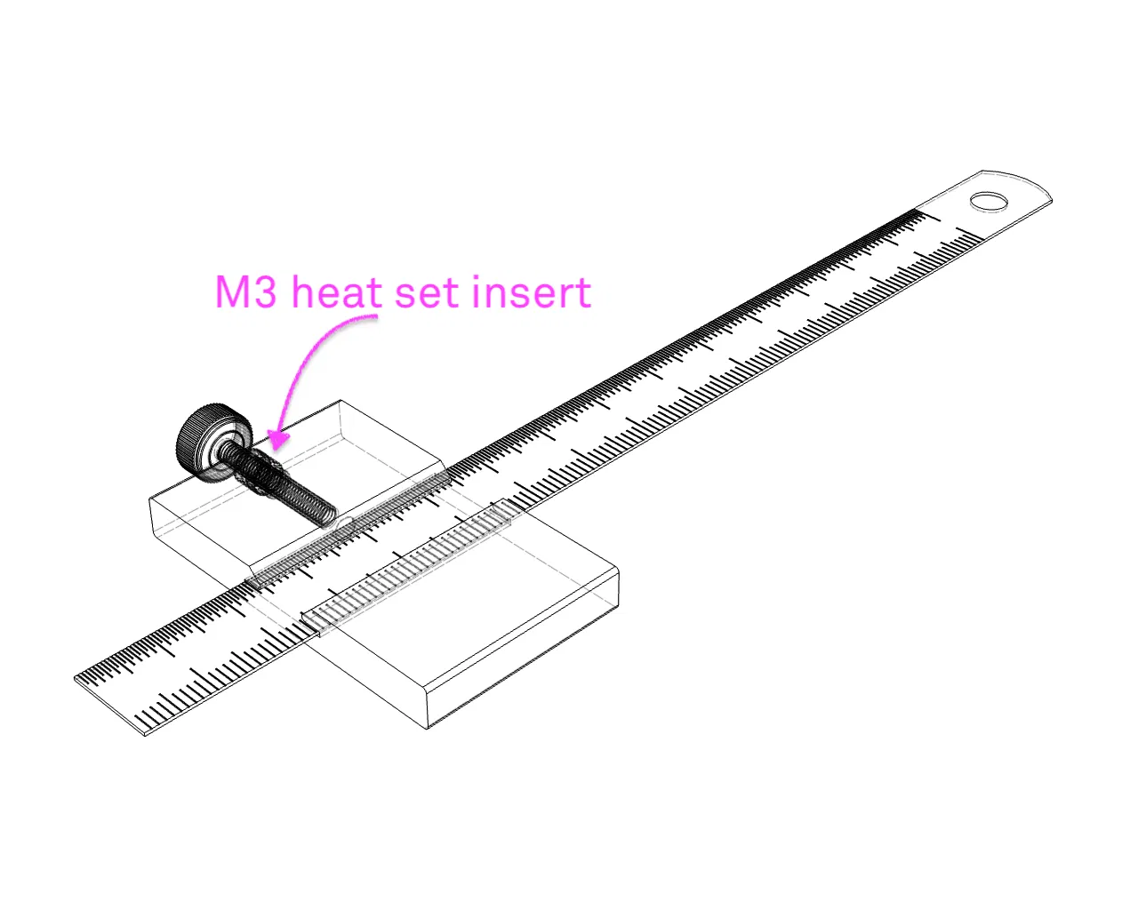 Dụng cụ đánh dấu này vừa với thước có kích thước 13x0.5 mm, sử dụng insert nhiệt M3 thay vì đai ốc. Phiên bản V2 có thêm các vít vặn M3x20 và M3x16 để tiện sử dụng.