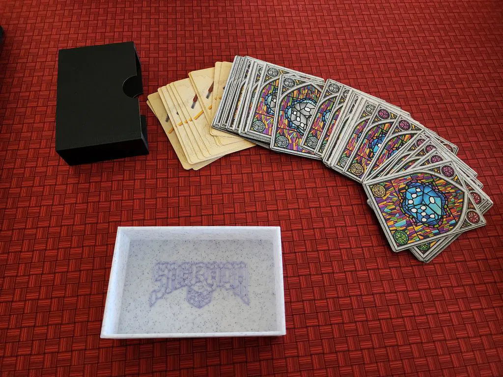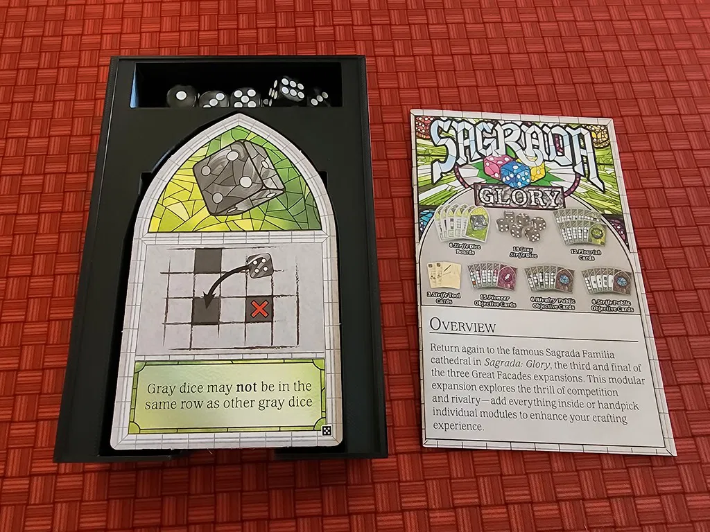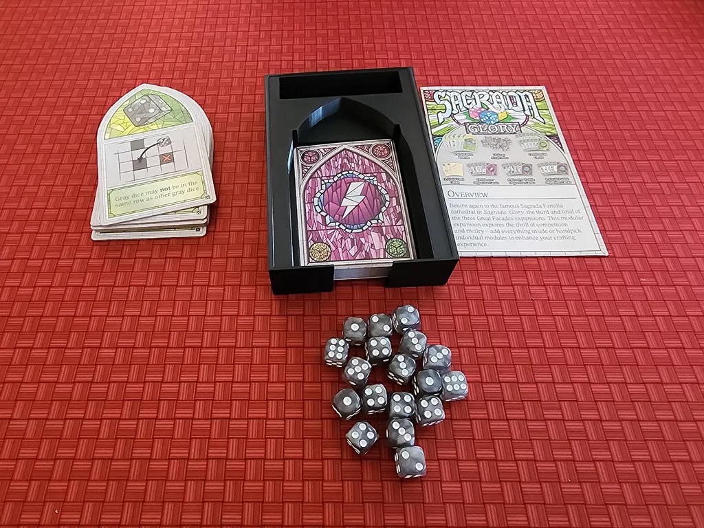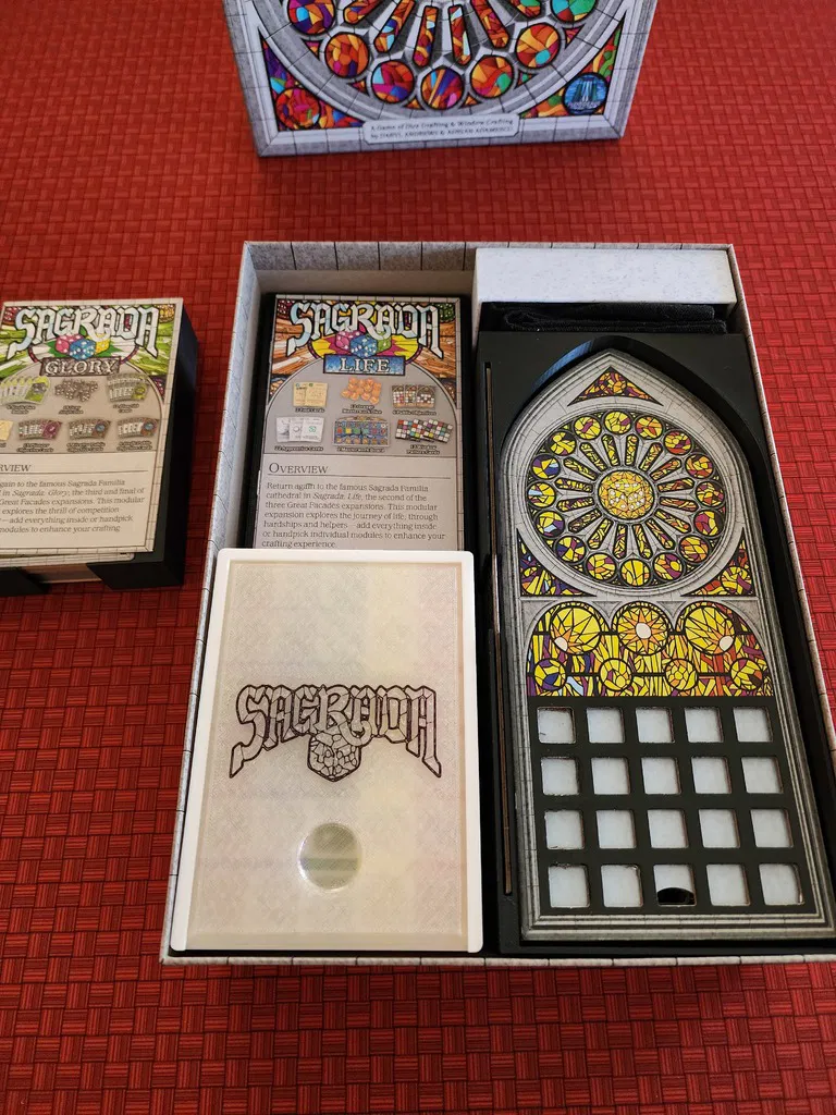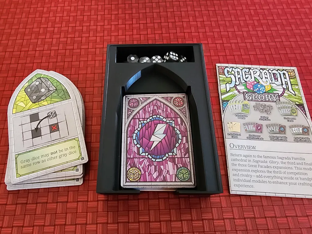 Bộ tổ chức hộp game board Sagrada này, bao gồm tất cả các bản mở rộng Glory, Life và Passion, được thiết kế để vừa vặn hoàn hảo trong hộp game gốc. Bao gồm cả khay xúc xắc kiêm giá đỡ bài mới, khe đựng quân cờ và token thủy tinh. Lưu ý: không vừa với bài đã bọc.