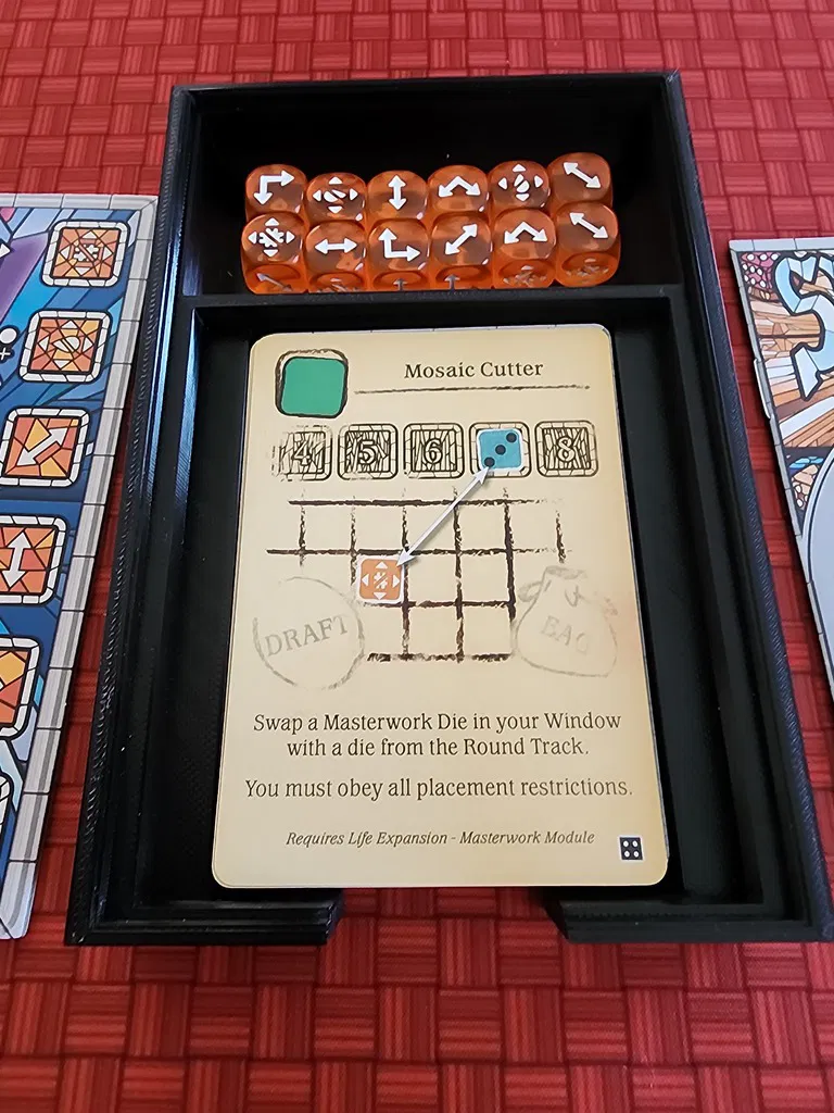 Mục tiêu của tôi với bản chỉnh sửa này là để chứa tất cả các bản mở rộng: Glory, Life và Passion trong hộp game gốc mà không bị cấn hộp. Thứ duy nhất tôi không thể xếp vừa từ game là khay xúc xắc đi kèm, nhưng tôi đã tạo một cái mới có thể dùng làm giá đỡ bài. Tôi cũng đã chỉnh sửa quân cờ người chơi và tạo các khe trong khay người chơi để đựng chúng và các token thủy tinh. Tôi đã chỉnh sửa giá đỡ xúc xắc để khắc số lượng người chơi ở cạnh bên.