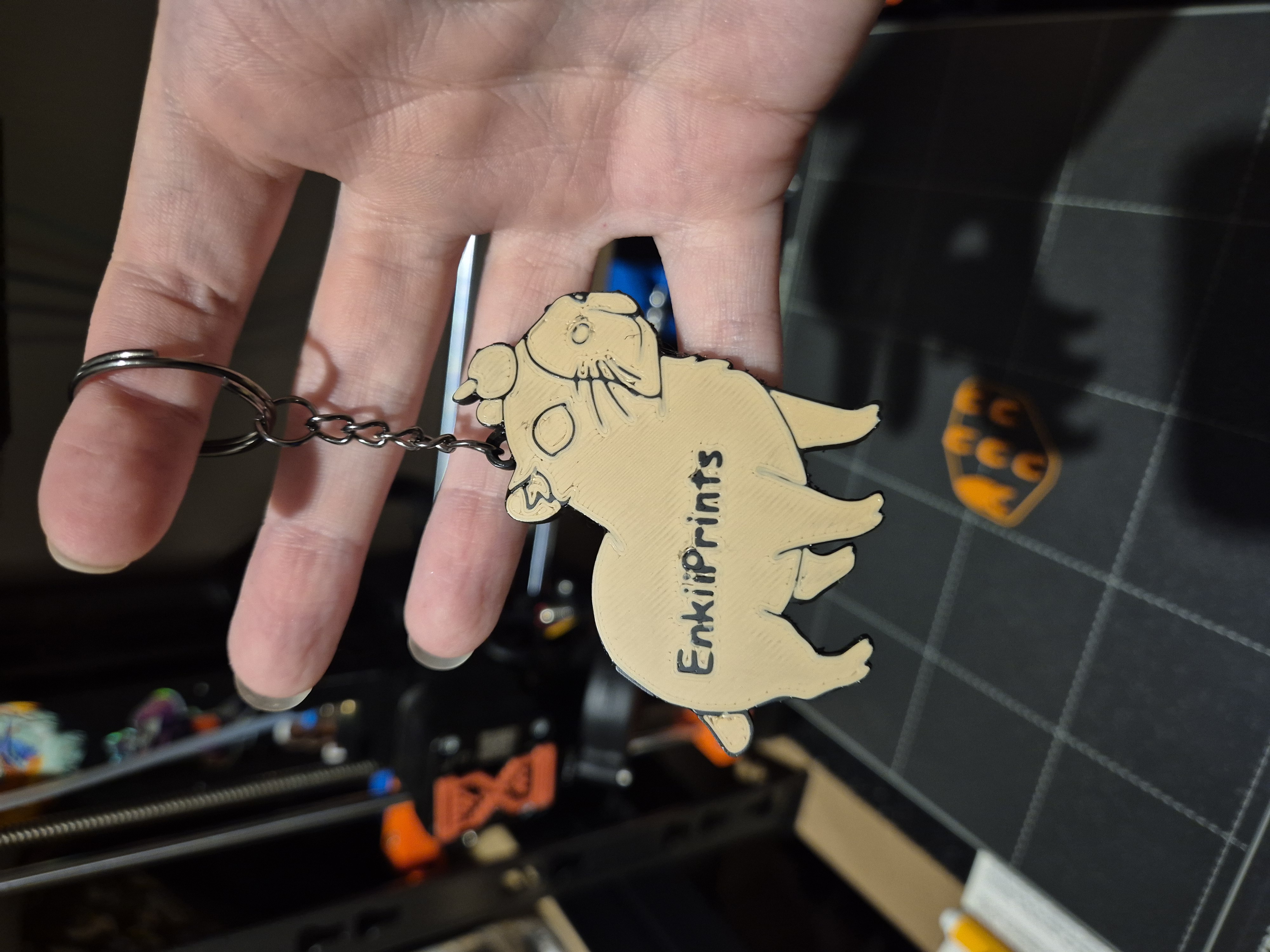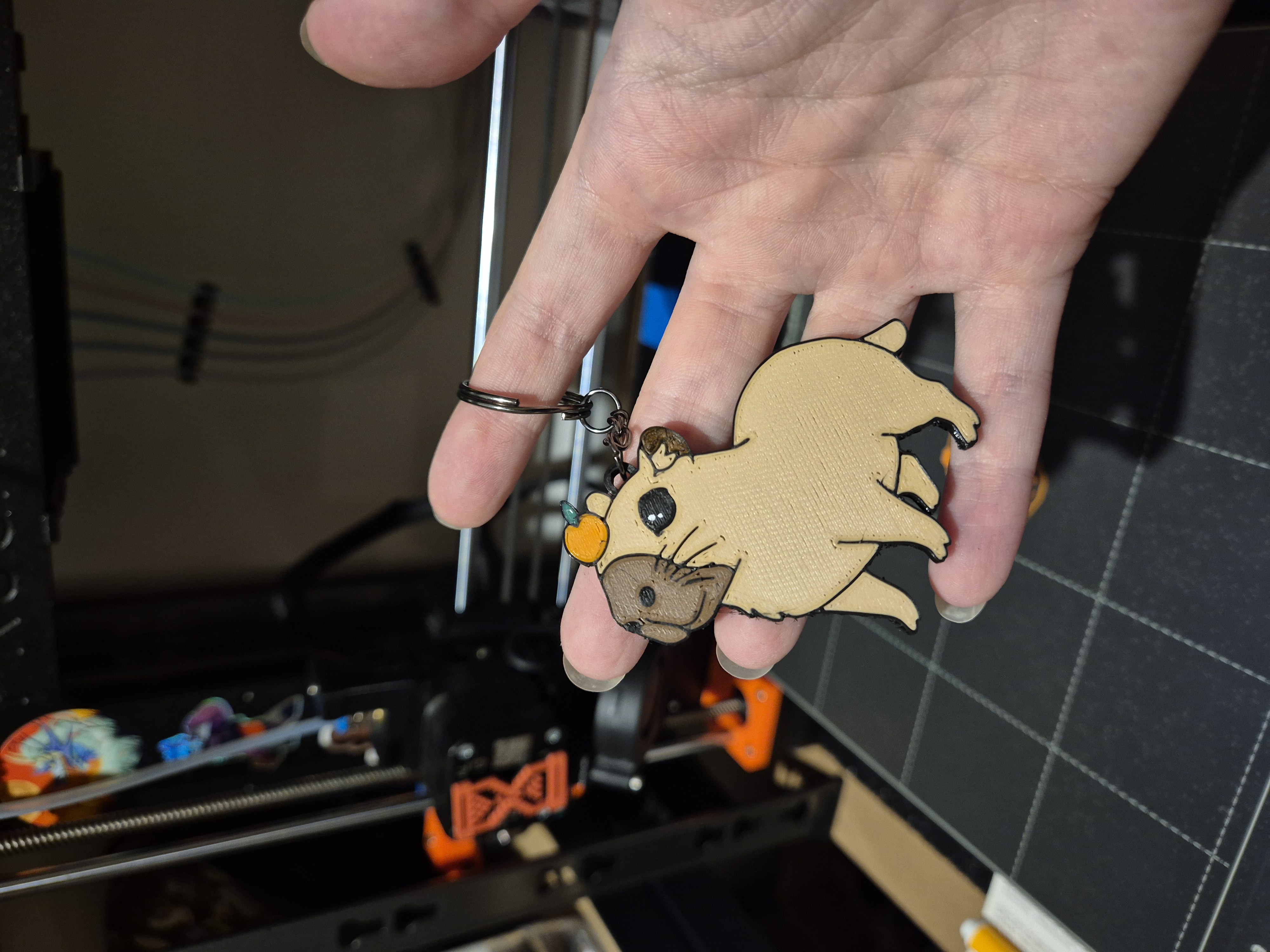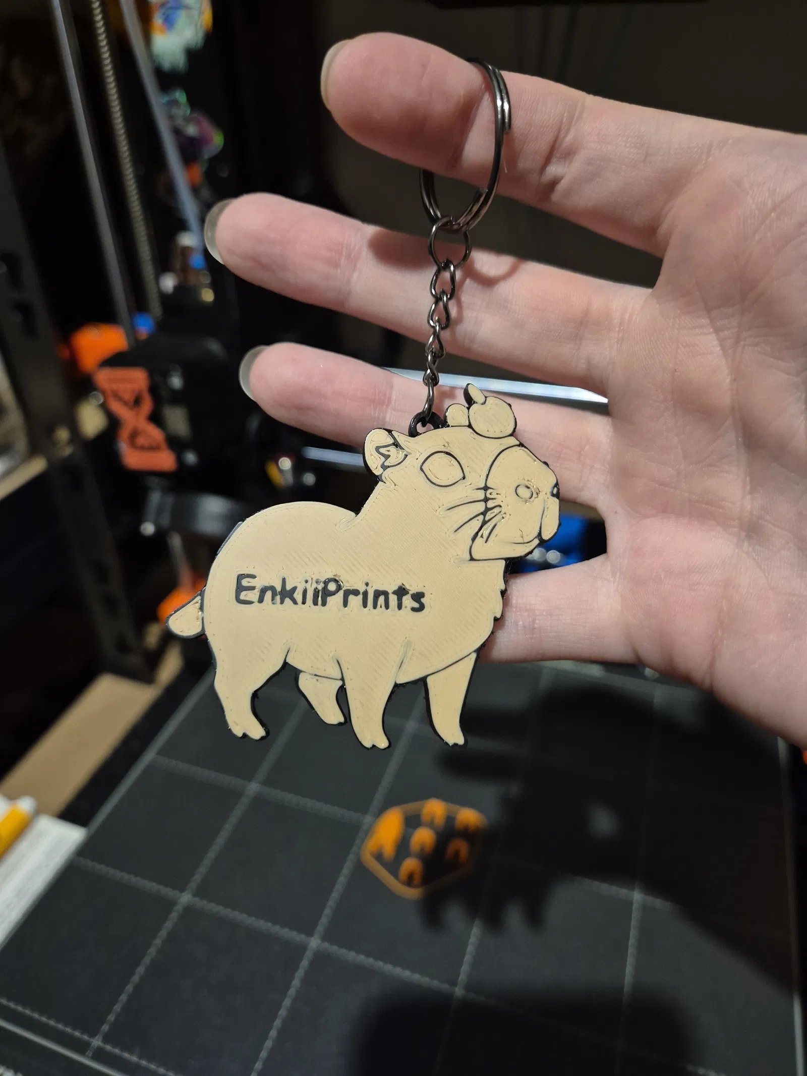 Móc khóa Capybara này là mẫu gốc, được tặng làm quà giveaway cho sự kiện Twitch "Capybarathon!". Giờ thì bạn cũng có thể tự in cho mình một em rồi! Chấm trắng trên mắt là vẽ tay nha.