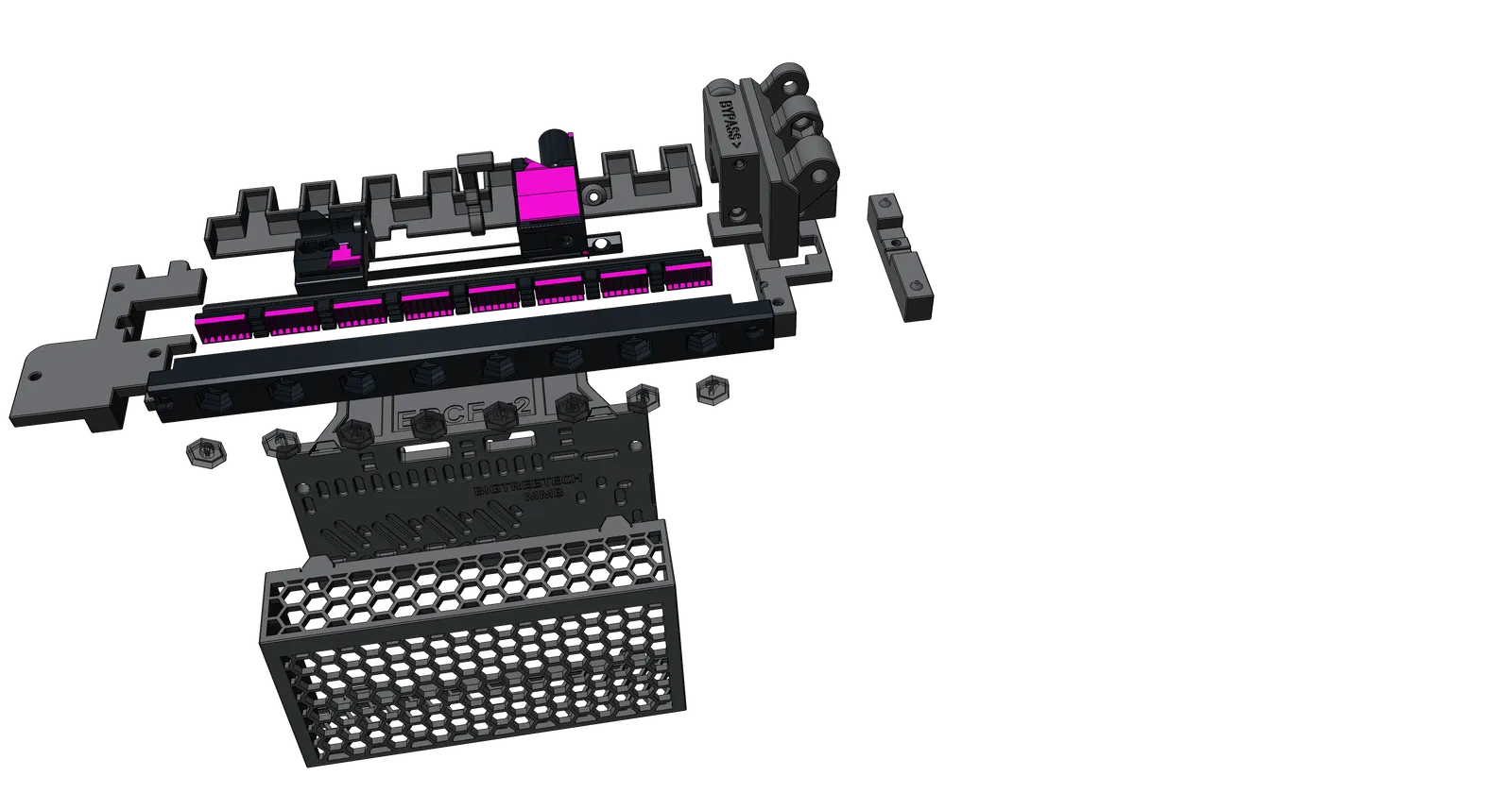 Có cái End Bypass mới với các rãnh để đi dây phía dưới và cho dải đèn LED. Cái End Bypass Foot và Gearbox cover mới được rút ngắn lại. Sẽ cần một ít ren nhiệt M3, 2 con ốc M3x12mm SHCS hoặc 16mm SHCS để gắn washer, 2 con ốc M3x8mm SHCS và T-slot M3 hoặc hammerhead để gắn BTT MMB, 2 con ốc M3x8mm SHCS và 2 ren nhiệt M3 cho End Bypass, và cuối cùng là một ít băng keo xốp 3mm.