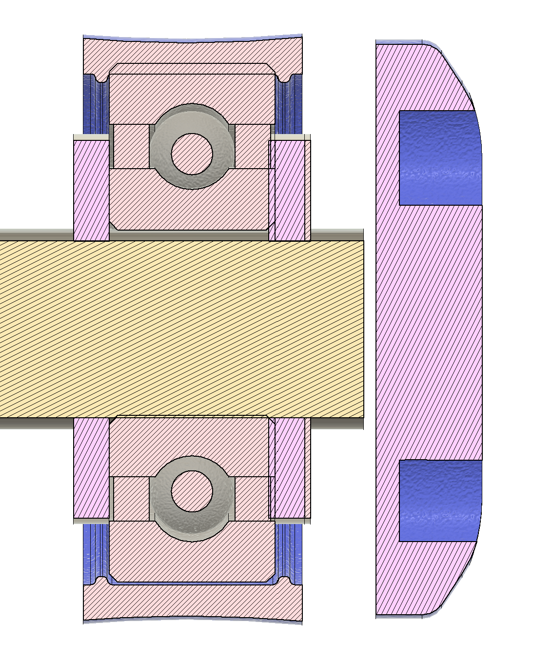 - Phần thú vị đây…… từ từ luồn các thanh tròn từ phải sang trái, chèn vòng đệm và vòng bi khi bạn đi. Nên có một vòng đệm ở mỗi bên. Điều này giúp vòng bi và con lăn không bị cọ xát vào hai bên. Phía bên trái của mỗi vị trí con lăn nên có nắp vòng bi vát với cạnh sắc quay về bên trái. Ở mặt cắt ngang, nó sẽ trông như thế này. Hướng của vòng bi ở bên phải không quan trọng. Sau khi lắp hết vào, hãy đảm bảo các nắp che TPU được căn chỉnh và không bị cọ xát. Chúng nên quay trơn tru.