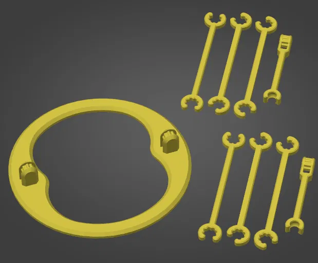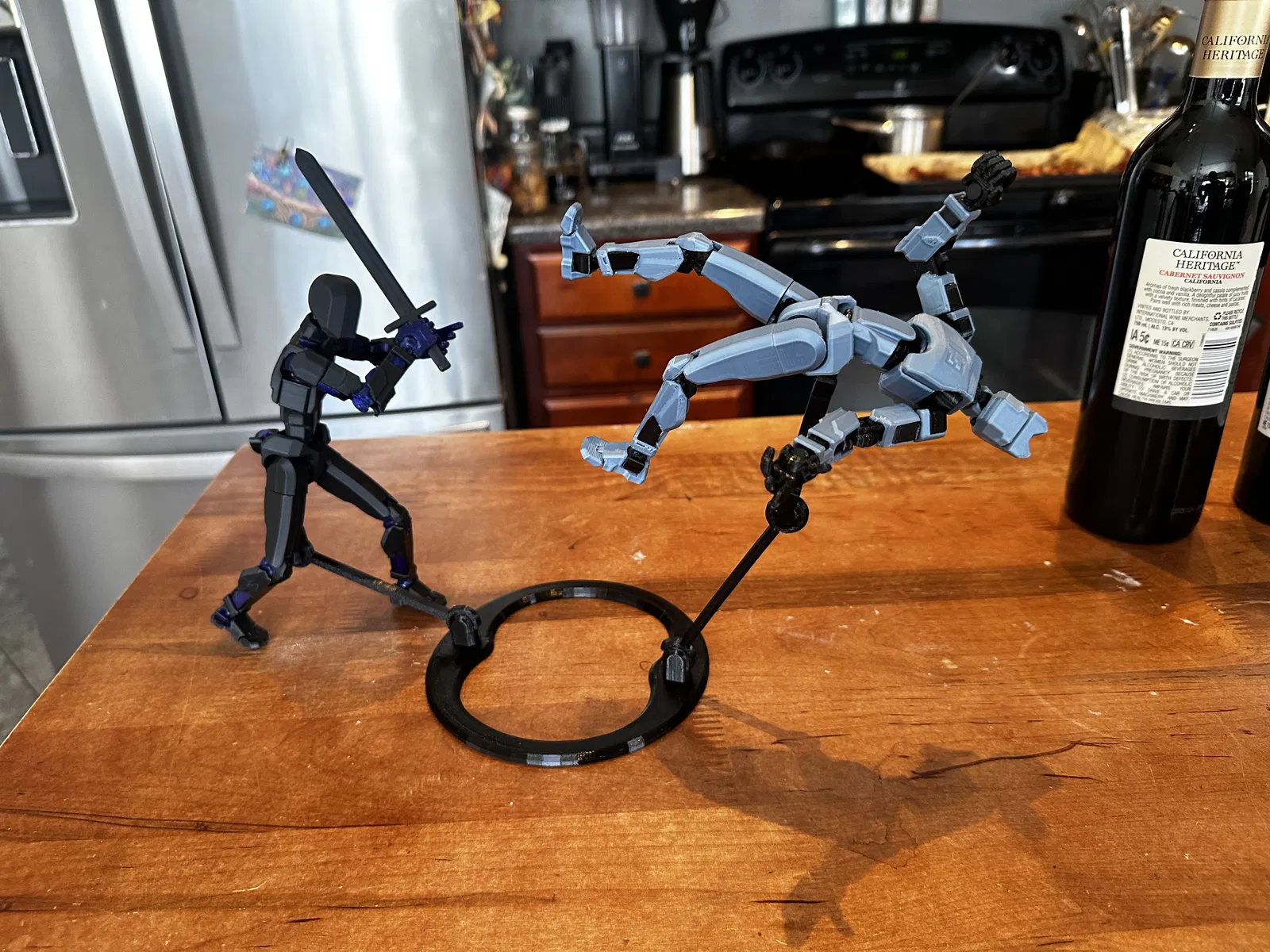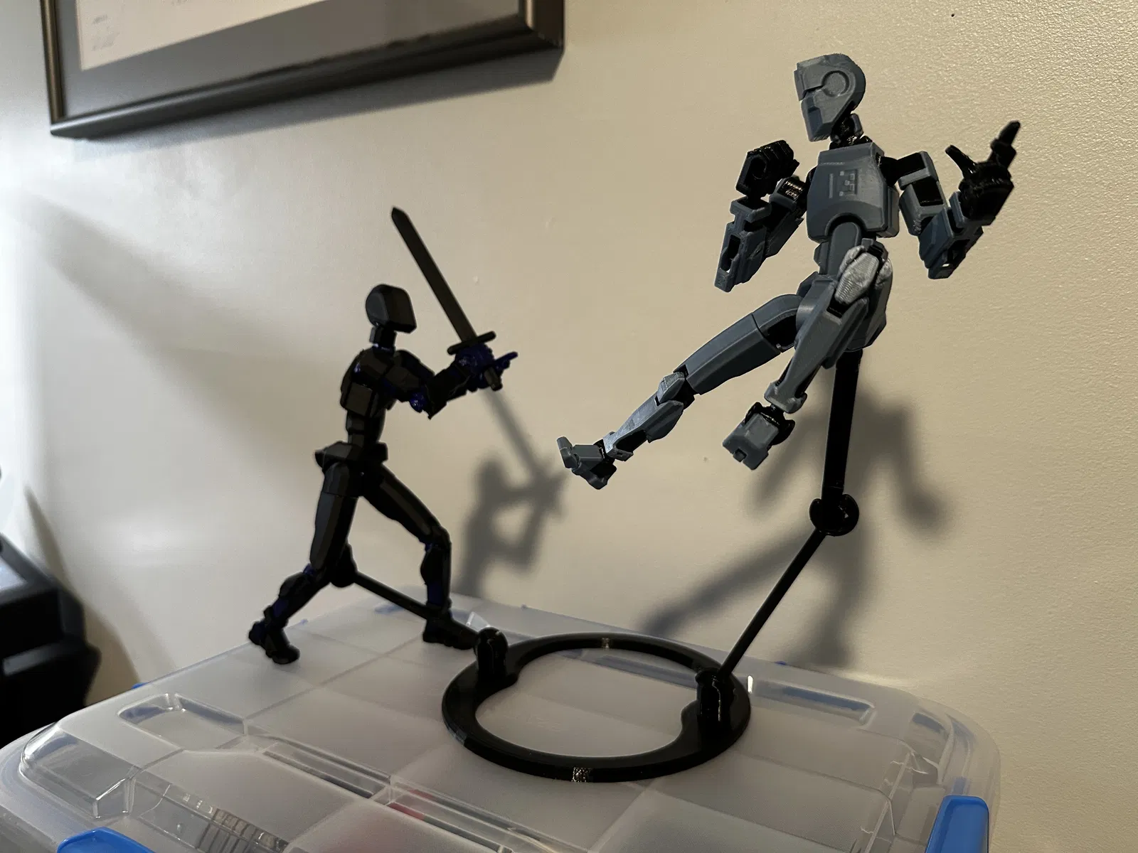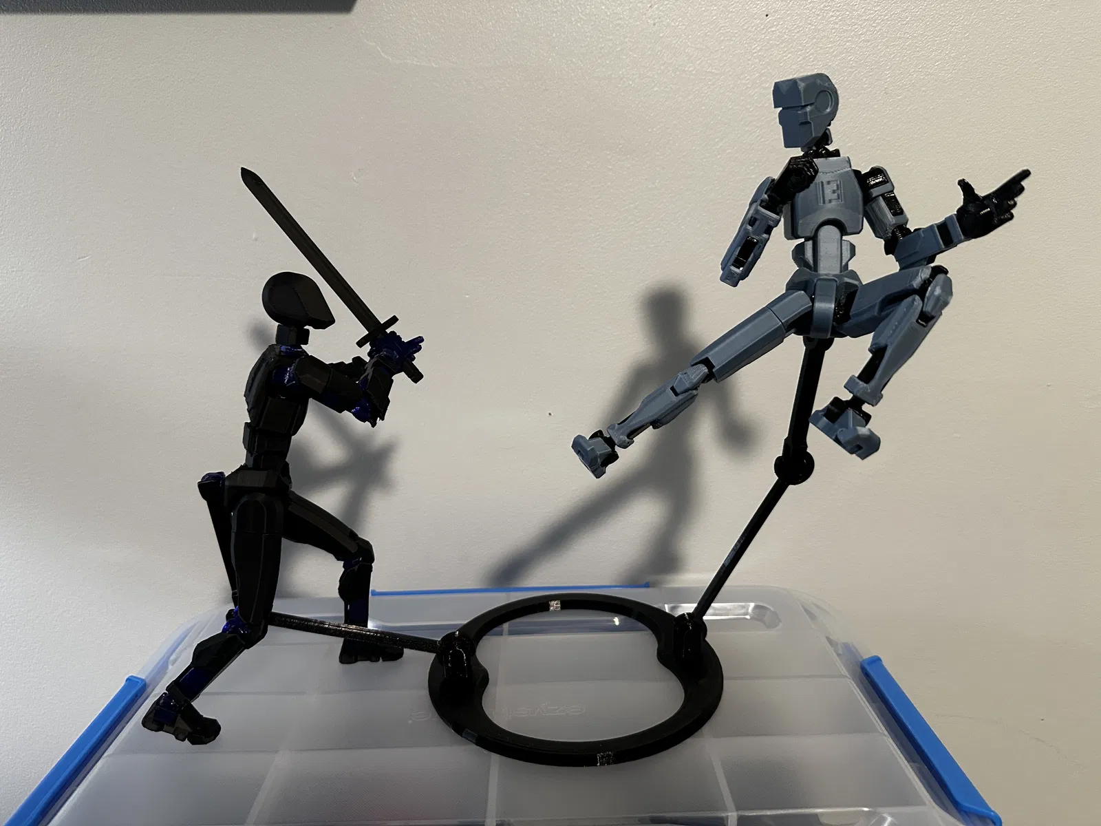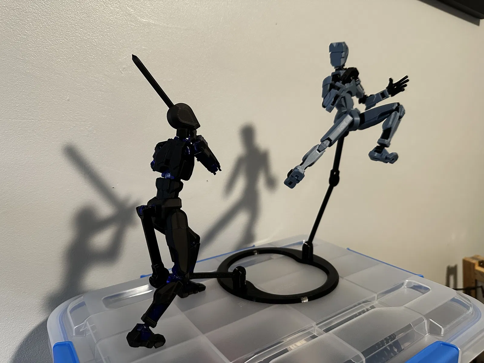 Dựng dáng hai con Dummy 13 trên cùng một đế. Phần đế có thể in bằng PLA hoặc PETG, còn các chi tiết cánh tay thì nên dùng PETG để bền hơn. Đã thử scale lên 150% và chạy ngon lành.