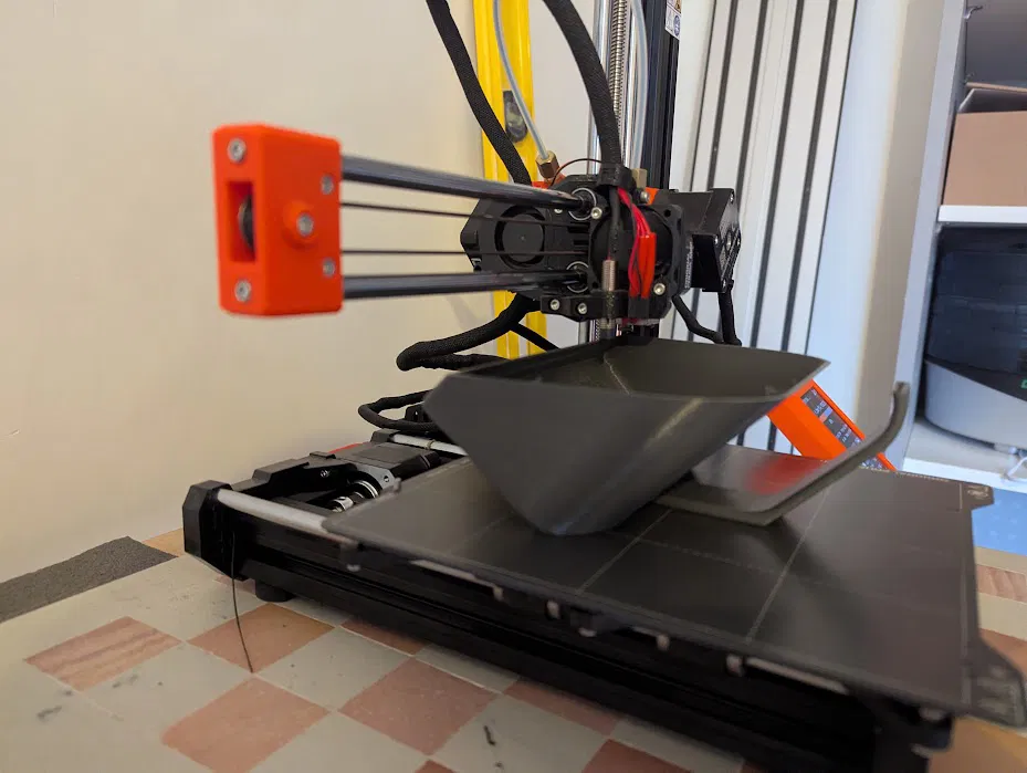 In thùng rác ở cạnh 45 độ giữa tay cầm và đáy (theo định hướng trong STL). Tôi đề xuất 3 lớp vỏ. Không cần hỗ trợ.