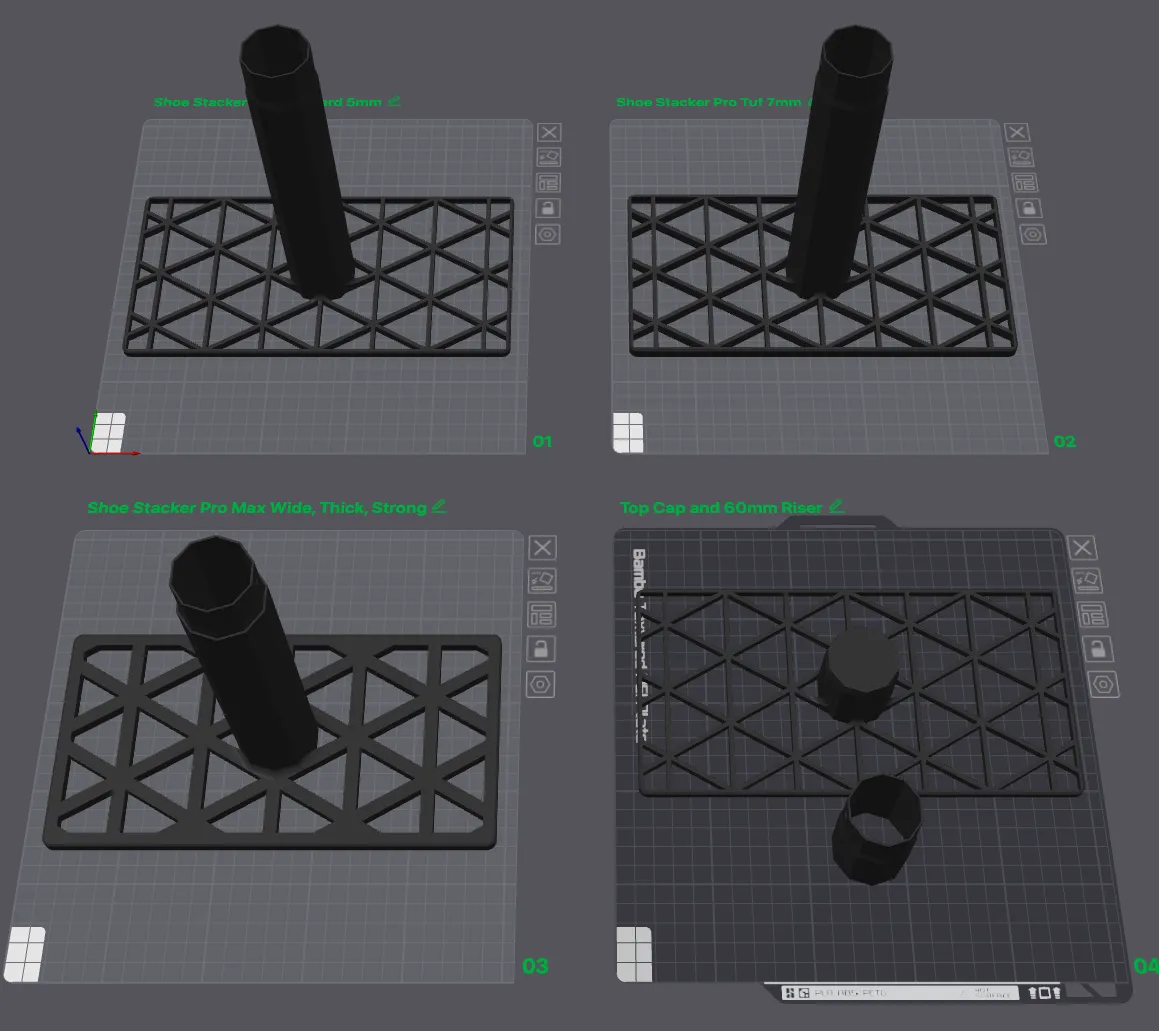 Biết có nhiều mẫu kệ giày lắm rồi, nhưng mà mẫu này thì tui làm riêng để tối ưu vật liệu in nè. Mẫu tiêu chuẩn in nhanh, rẻ mà vẫn chắc, còn có thêm mẫu Tuf và Max siêu cứng cáp cho giày nặng, với cả mẫu Mini cho giày trẻ em nữa. Đảm bảo ai cũng có cái ưng ý!