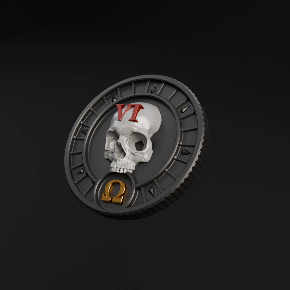 Token hình đầu lâu 40mm với số La Mã từ I đến VI. Đây là một mô hình đơn giản được tạo ra theo yêu cầu của người dùng Reddit, sử dụng mô hình đầu lâu giải phẫu đẹp mắt của 3Demon.
