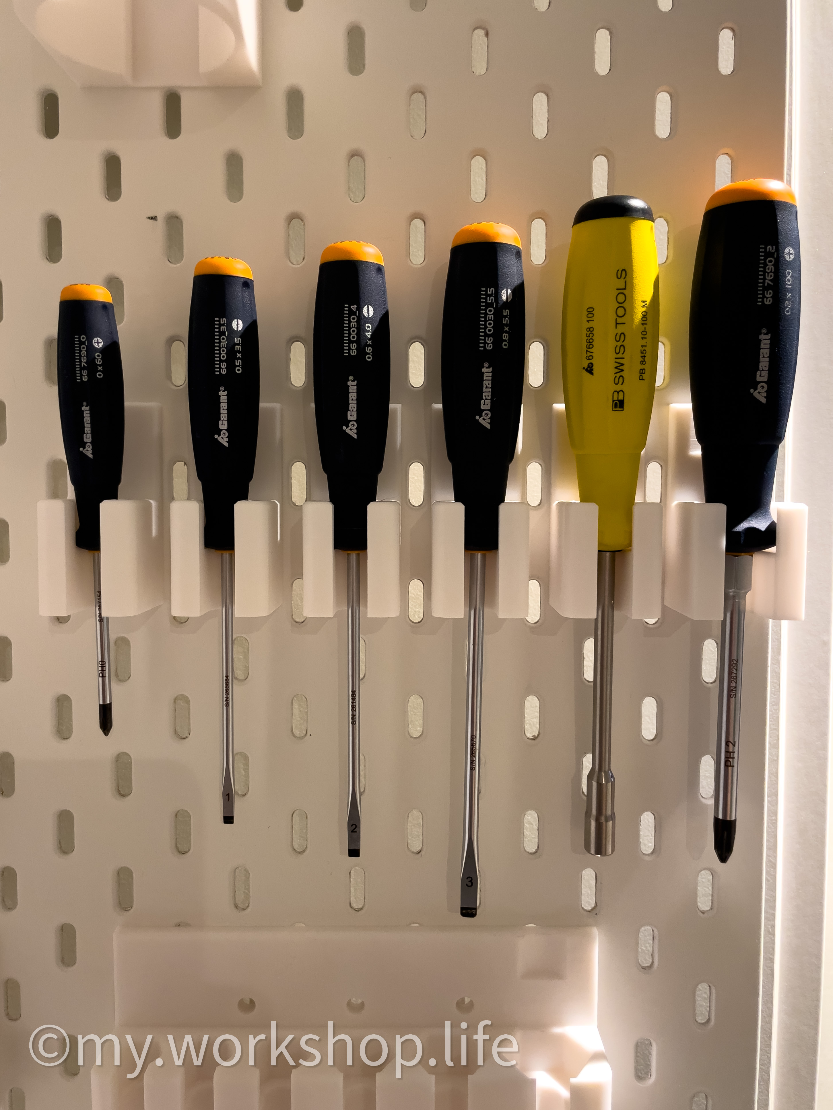 Chỉ cần gắn nó lên bảng pegboard Hoffmann Group Garant hoặc Holex, hay là lên Hệ thống Skadis của IKEA, rồi xem nó biến cái chỗ làm việc của bạn ra sao. Việc tìm đúng cái tua vít sẽ trở nên dễ như ăn cháo, và cuối cùng thì xưởng của bạn cũng sẽ có trật tự.