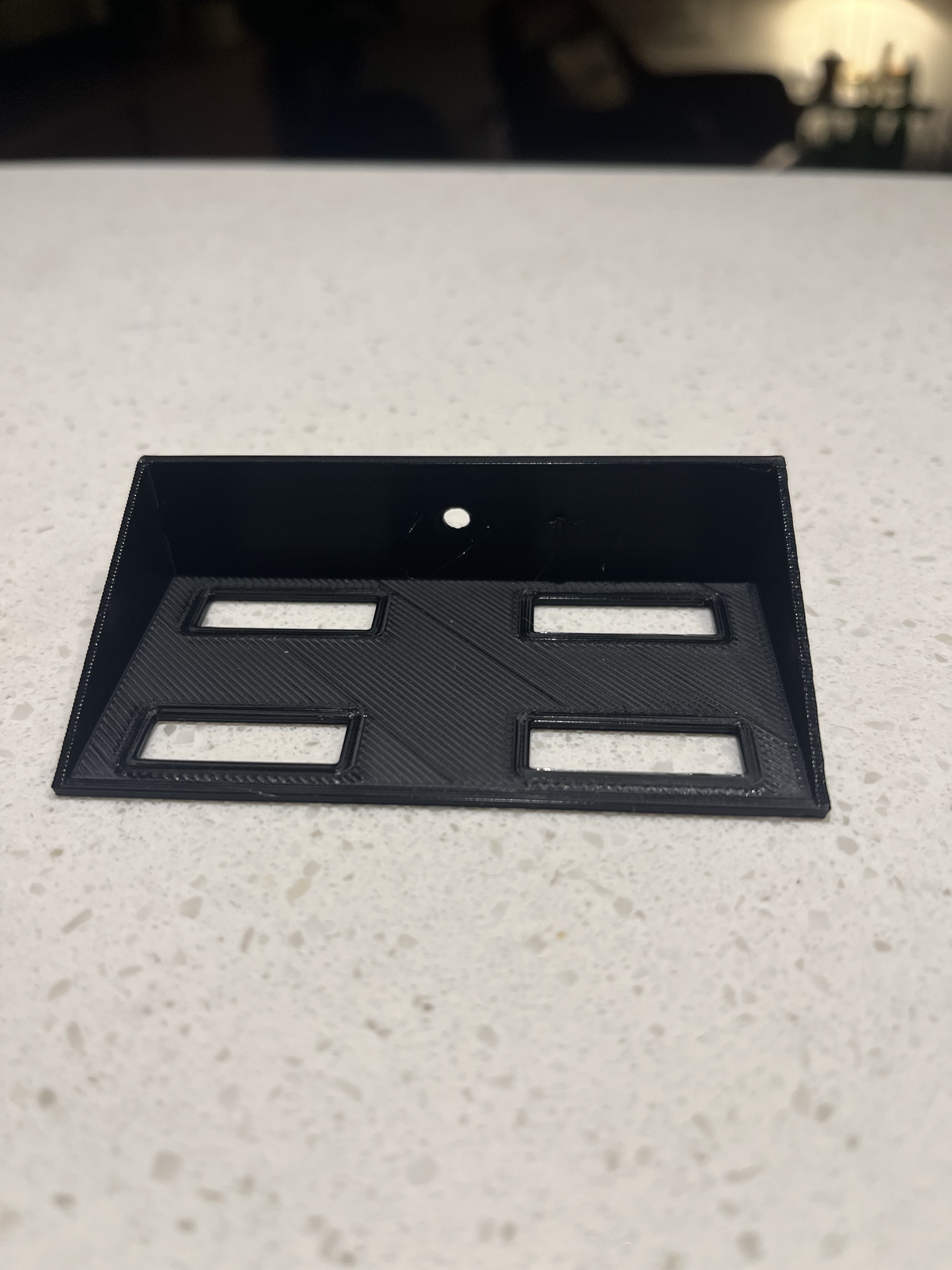 Cái này được thiết kế để dùng một con vít để treo mấy con xe mô hình tỉ lệ. Tôi đã làm kiểu treo bằng một vít âm đầu để có thể trưng bày theo kiểu show-park. File f3d đã được đính kèm nếu bạn muốn điều chỉnh số lượng/vị trí/kích thước lỗ.