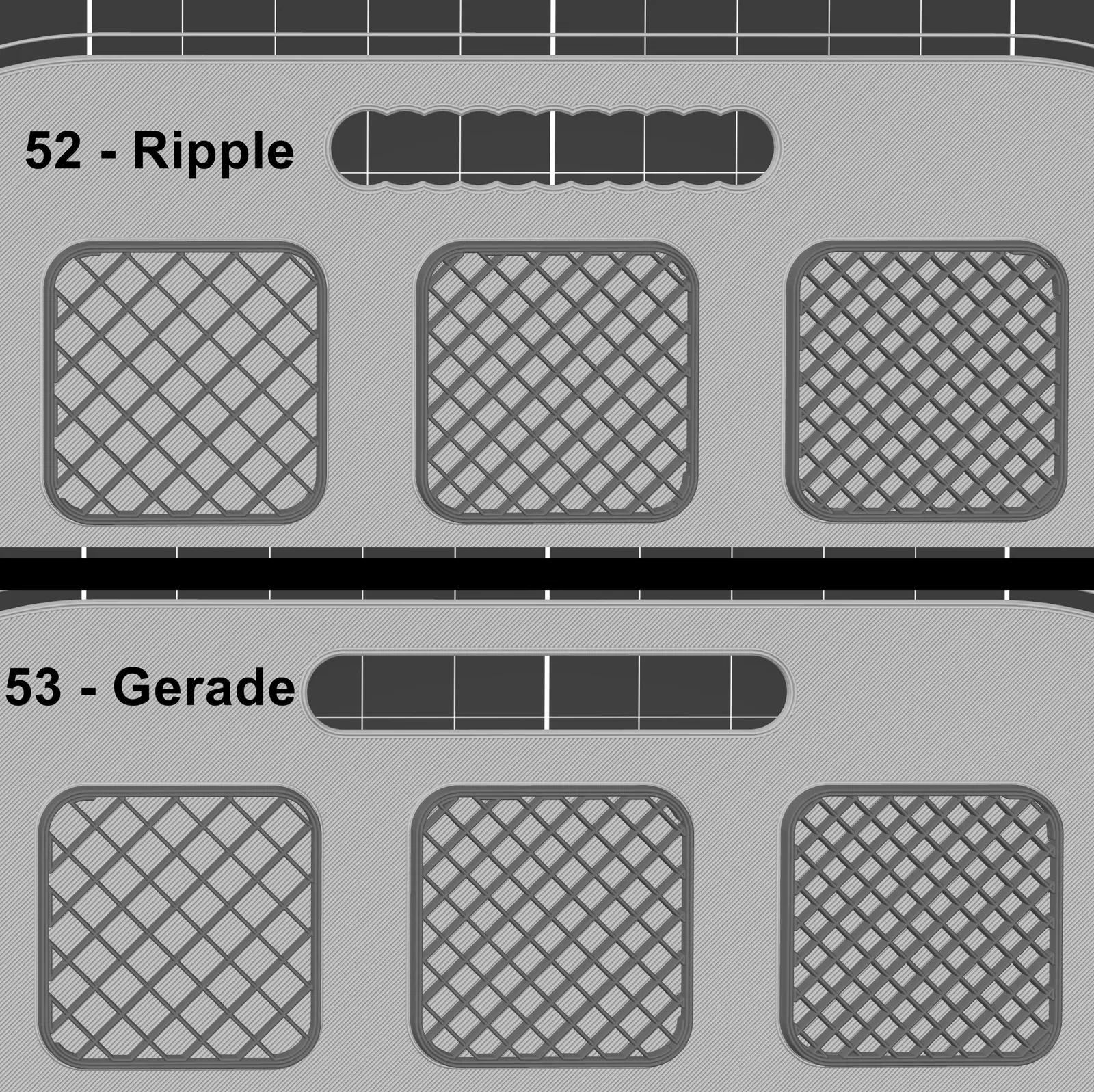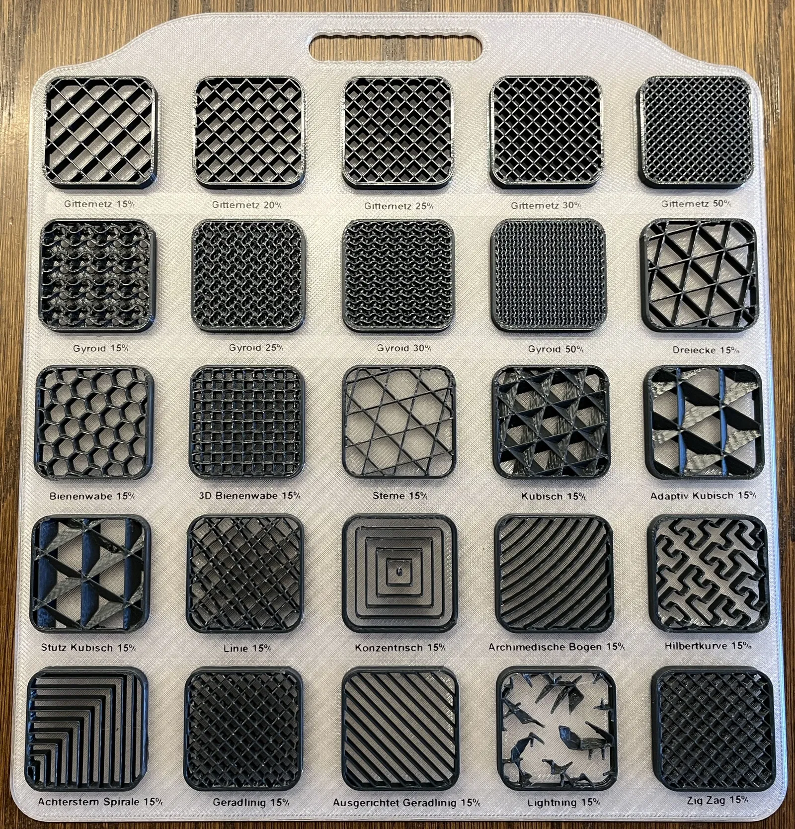 Tấm Mẫu Infill Prusa Slicer trong suốt, kích thước 200x215x7mm. Có mẫu PETG trong suốt (đổi filament ở 2.6mm) và PETG xám Anthracite. Bao gồm tệp P-Touch Editor và video xem rõ.