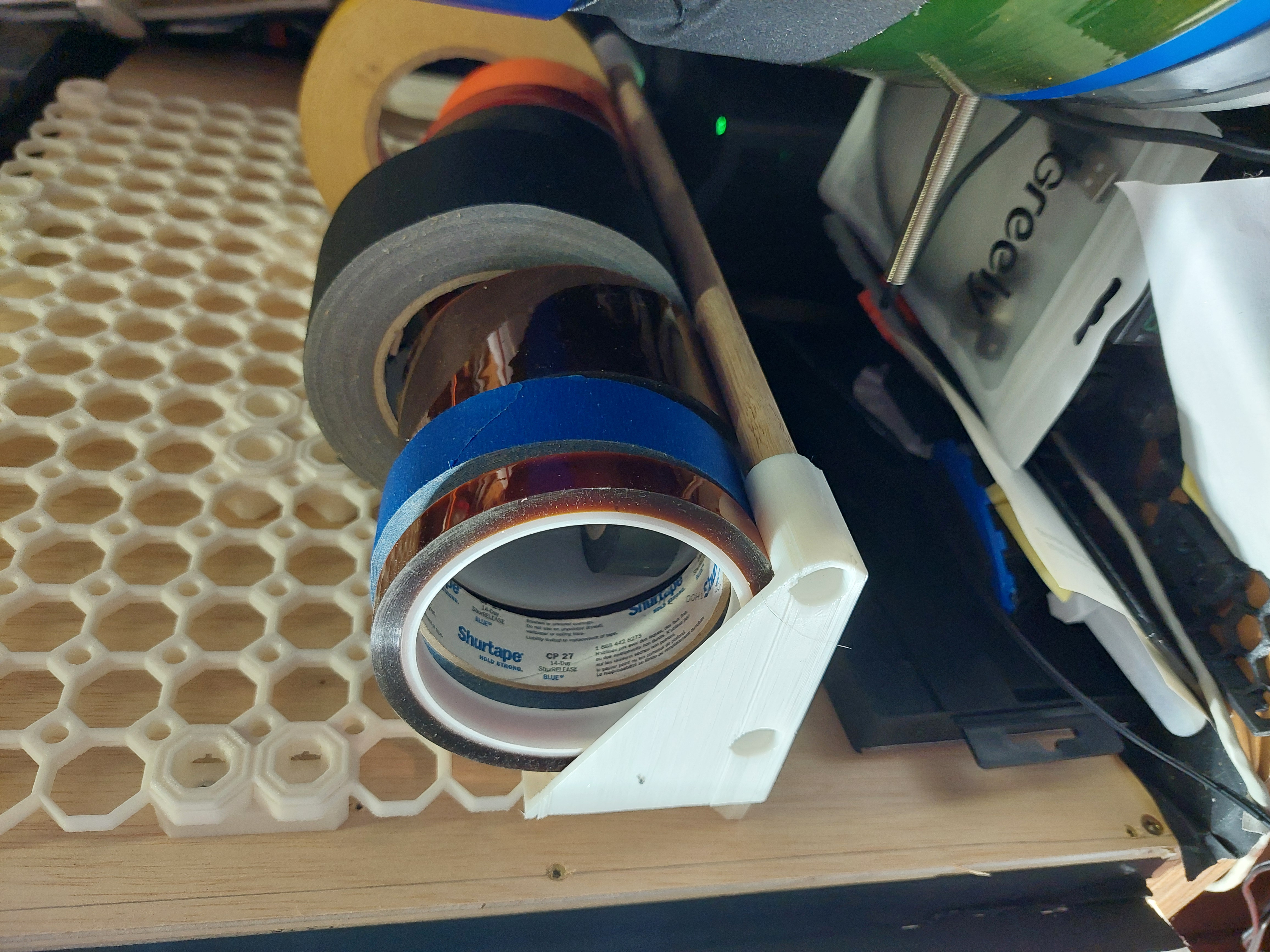 Dùng để đựng các cuộn băng keo trên MultiBoard của bạn. Thiết kế này không cần support và có thể nối dài tùy ý, sử dụng chốt gỗ và ốc vít lớn để gắn tường. Phiên bản R2 đã được cập nhật để in nằm ngang.