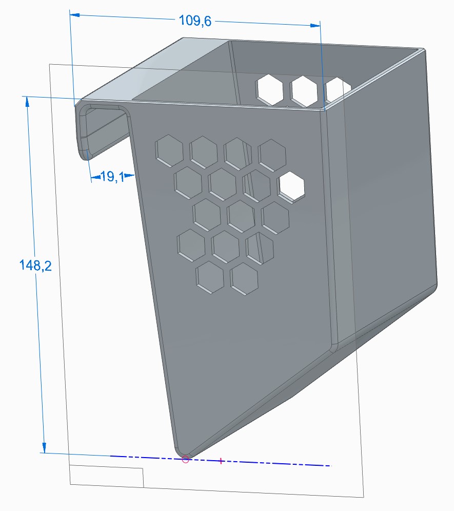 Tui cũng thiết kế thêm một cái đế đựng scoop, tui có thể gắn nó vào khay vệ sinh của mèo. Cái đế này có thể in rất dễ dàng và không cần support. Tui đã xài nhựa PLA Plus ở đây và in với bốn lớp tường, còn lại giữ nguyên cài đặt tốc độ của máy MK4S. Trong lần thử đầu tiên, tui đã gặp phải hiện tượng bị cong vênh. Tui đã khắc phục được bằng cách dùng một cái brim bên trong (10 mm). Cái này rất dễ dàng gỡ bỏ sau khi in bằng dụng cụ làm sạch cạnh.