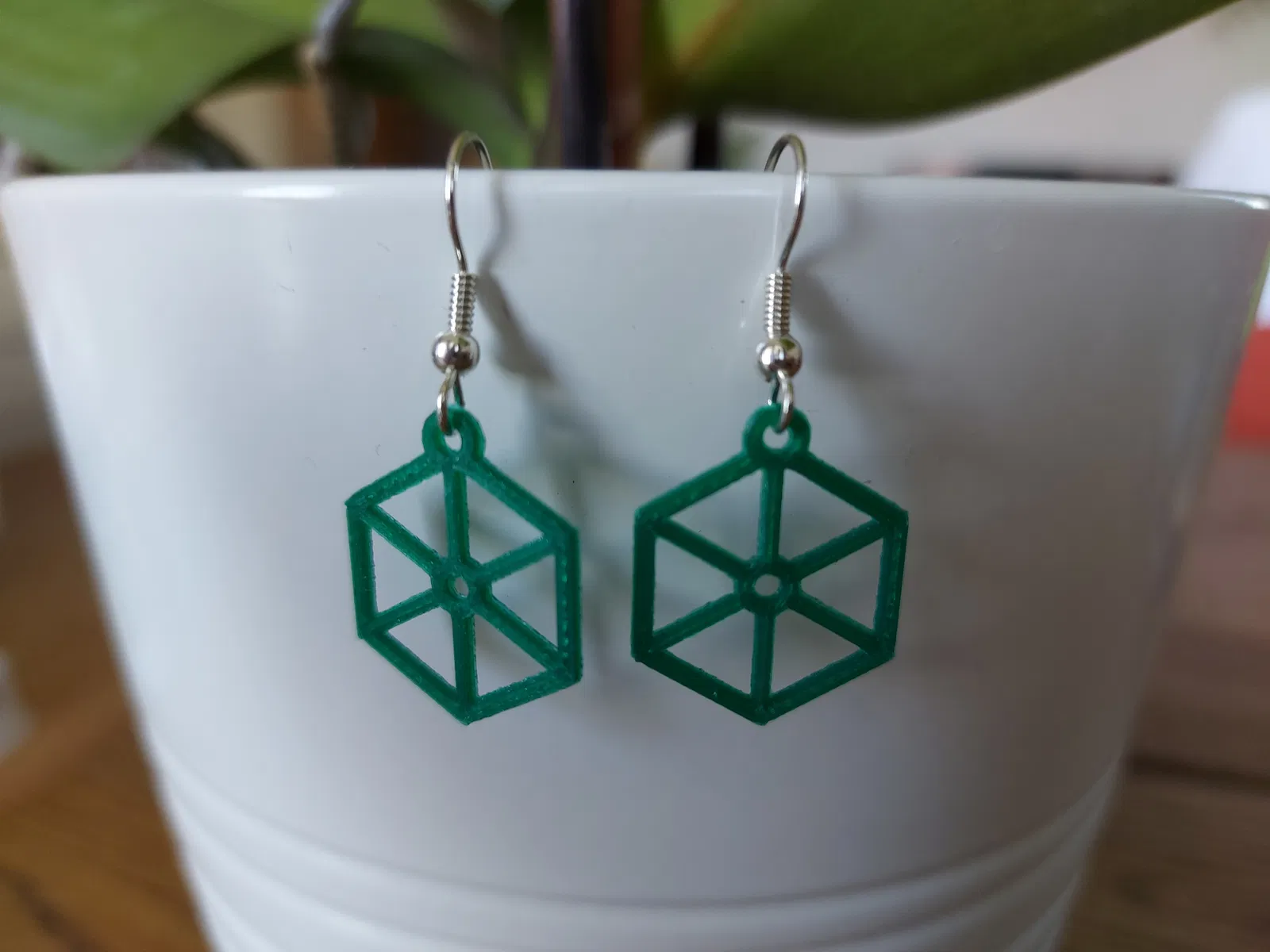 Mẫu bông tai hình học dạng lục giác, in siêu nhanh chỉ khoảng 6 phút. Khuyên dùng layer height 0.1 mm. In được với nhiều loại filament; tác giả đã in bằng PLA (Prusament).