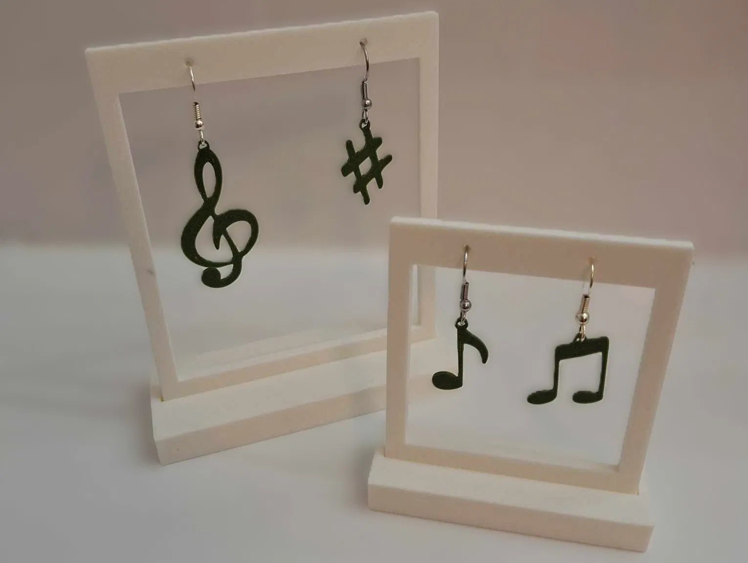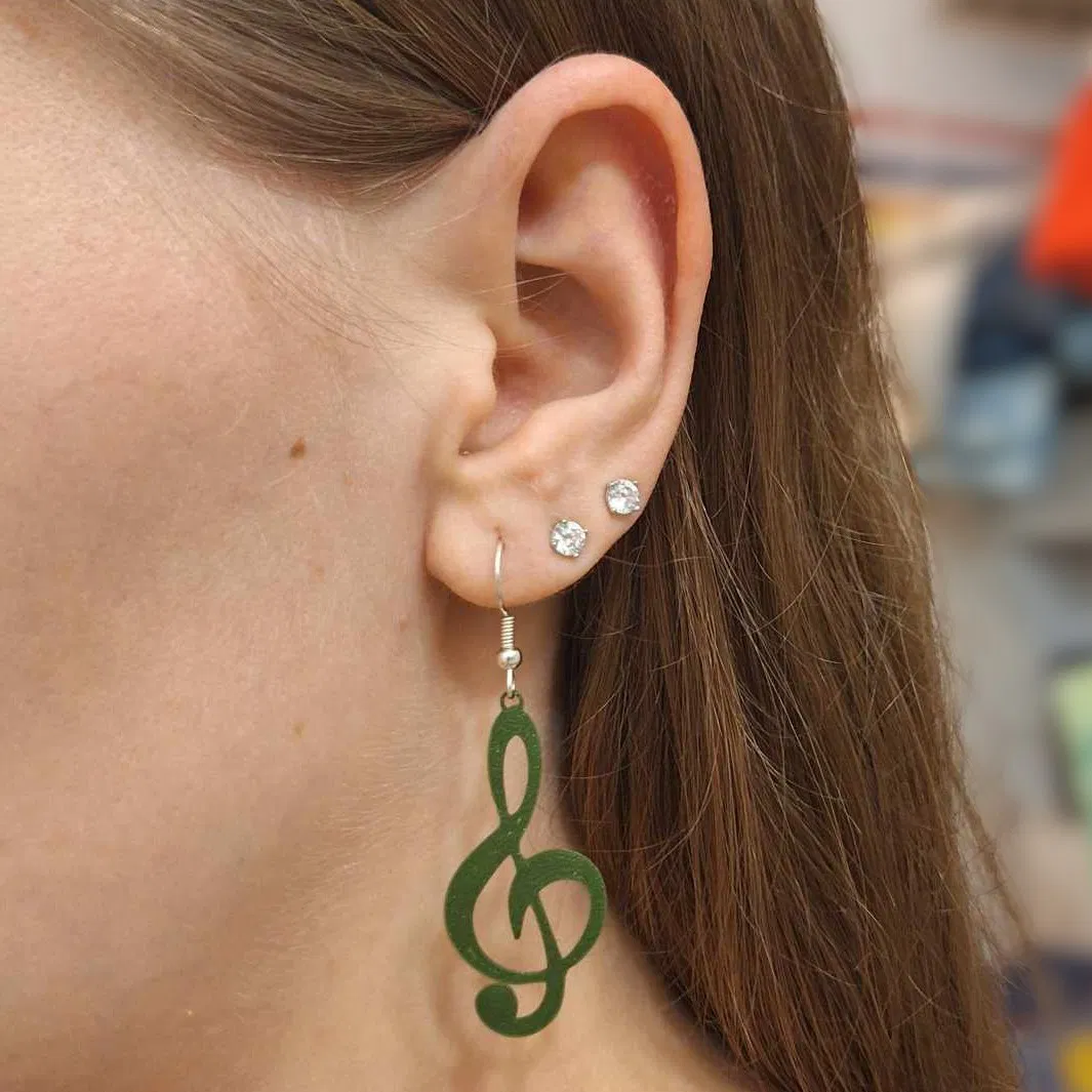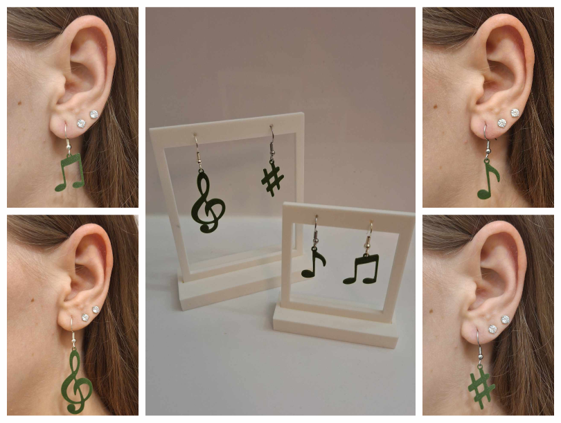 Bộ bông tai chủ đề âm nhạc gồm 4 ký hiệu: khóa Sol (treble), nốt eighth, cặp beamed eighth và dấu sharp. File in PLA với nozzle 0.4mm, layer 0.1mm; có mẹo mirror để mặt ngoài mịn hơn.