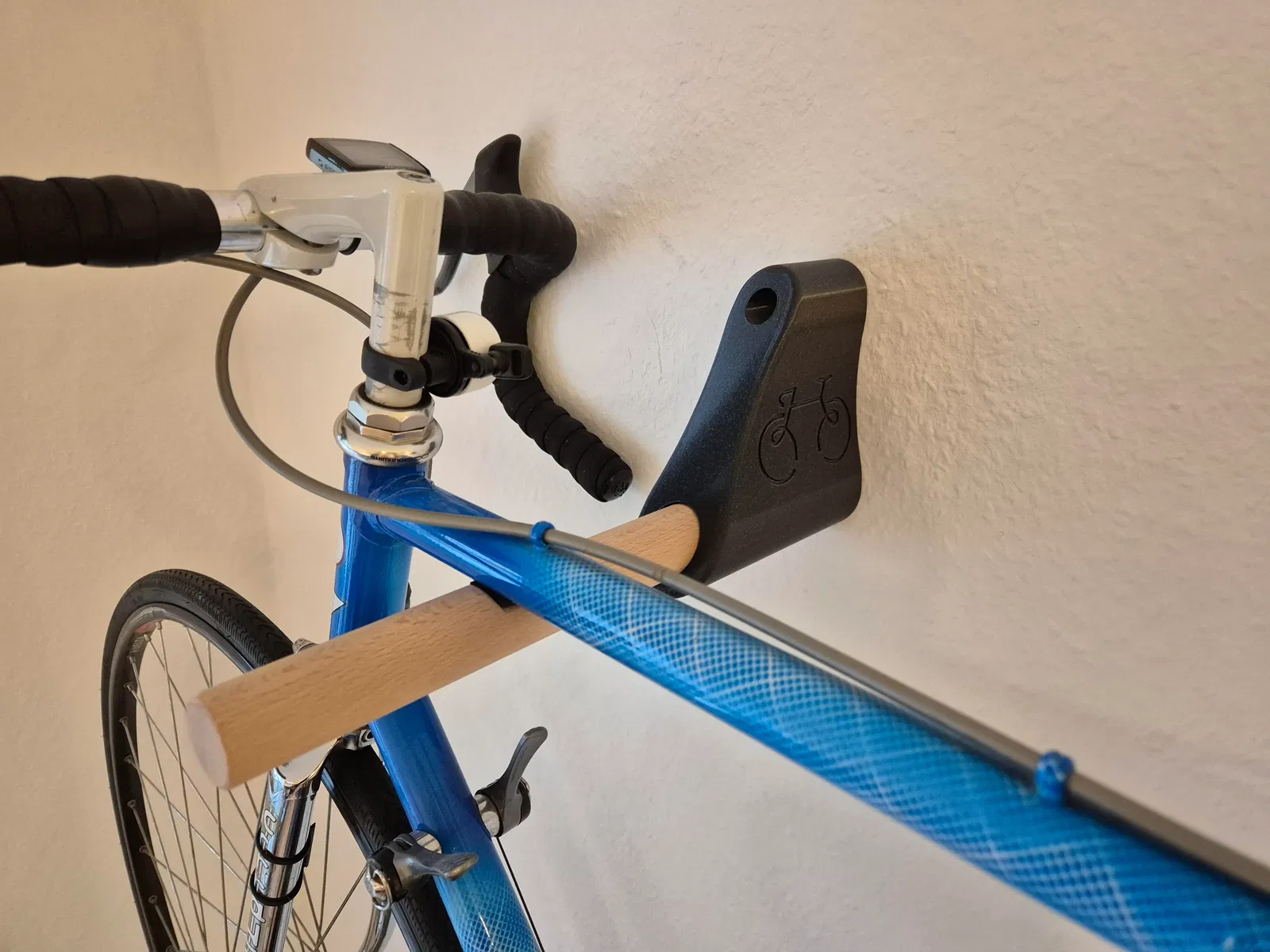 Giá treo xe đạp gắn tường đơn giản, dùng thanh tròn 30mm. In PETG “dày cơm” có thể treo xe khoảng 11–12kg ổn định; chưa test tải tối đa. Nên chỉnh slicer hợp lý, dùng vít và washer đủ lớn.