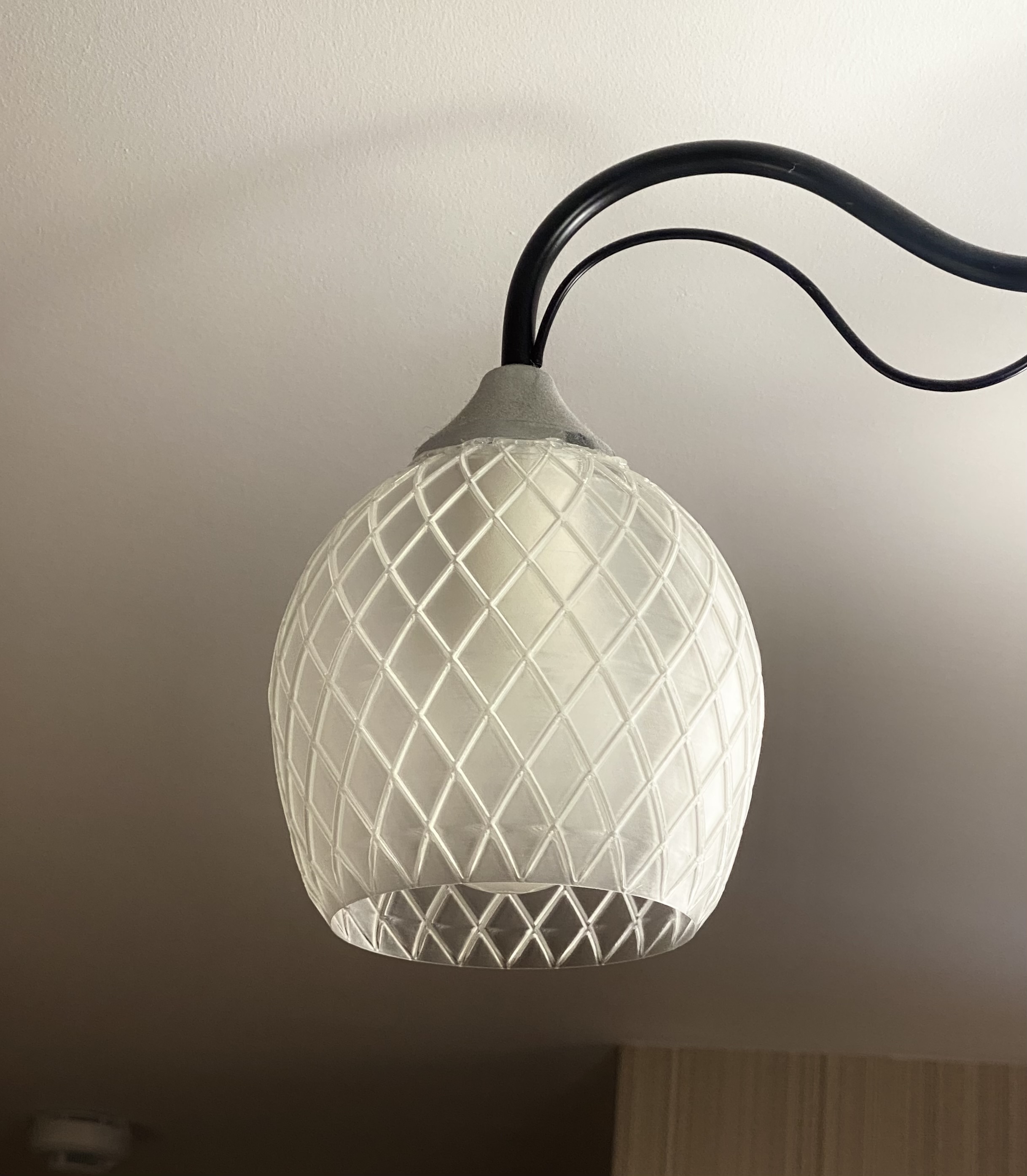 Chụp đèn in Vase Mode dùng cho đui E27. Khuyến nghị layer width 0.4–0.8 mm và dùng 6 bottom layers để phần gắn socket chắc hơn. Chờ bed nguội rồi mới gỡ; nếu đáy bung thì dán hot glue cố định.