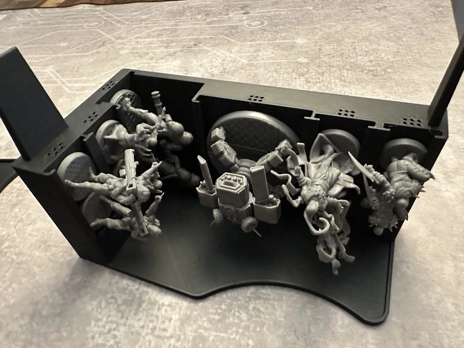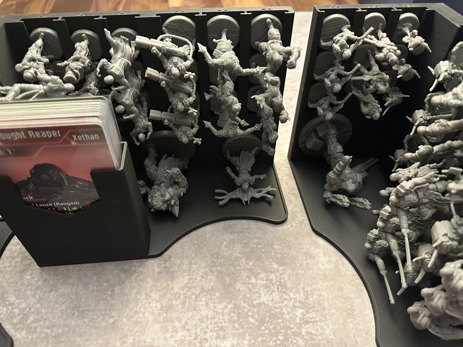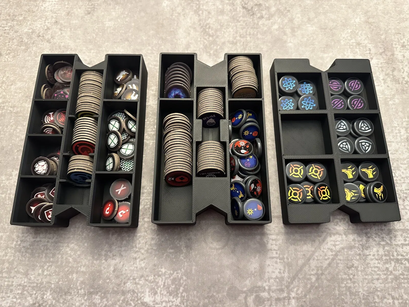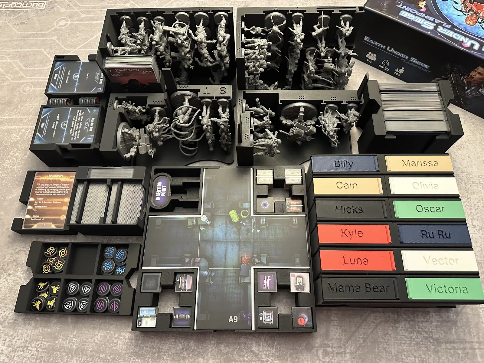 Đây là insert 2 hộp cho Earth Under Siege: Flashpoint, bao gồm cả expansion World Killer. Game này hay lắm, gợi nhớ X-Com, mà lại có rất nhiều token, card và miniature cần quản lý, nên nhiều khay trong bộ này có thể đặt thẳng lên bàn để chơi luôn. Tất cả khay trong hình được in bằng nozzle 0.6mm ở layer height 0.24mm, 10% gyroid infill, không dùng supports.