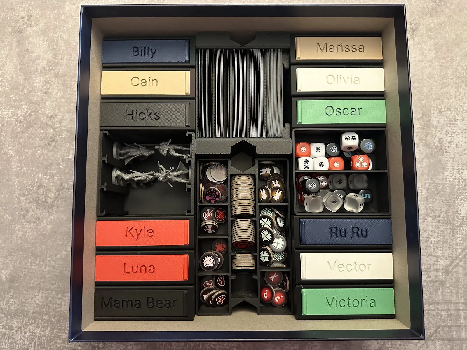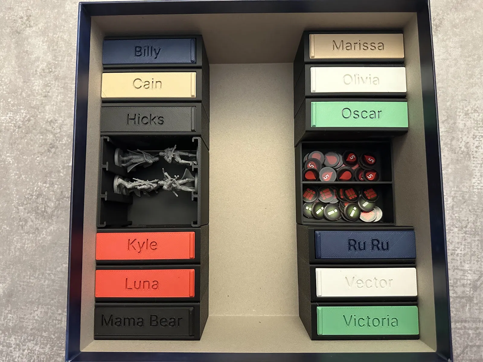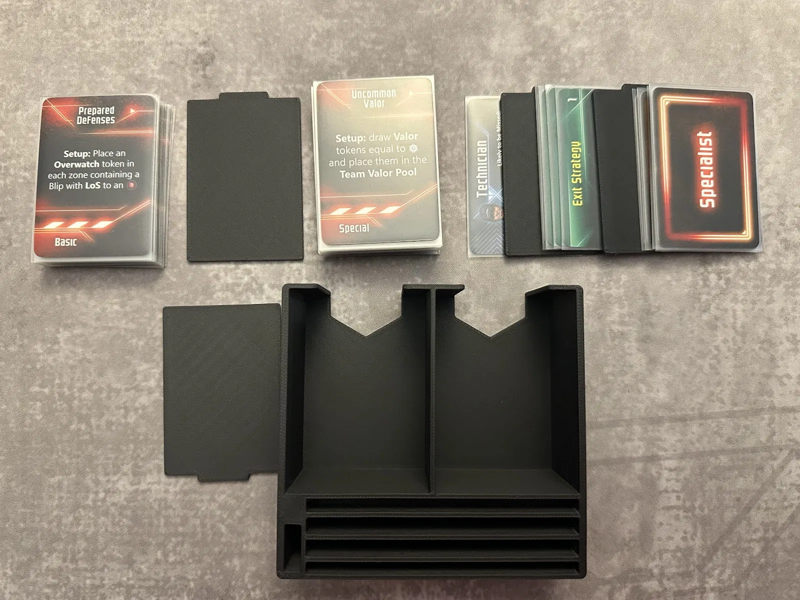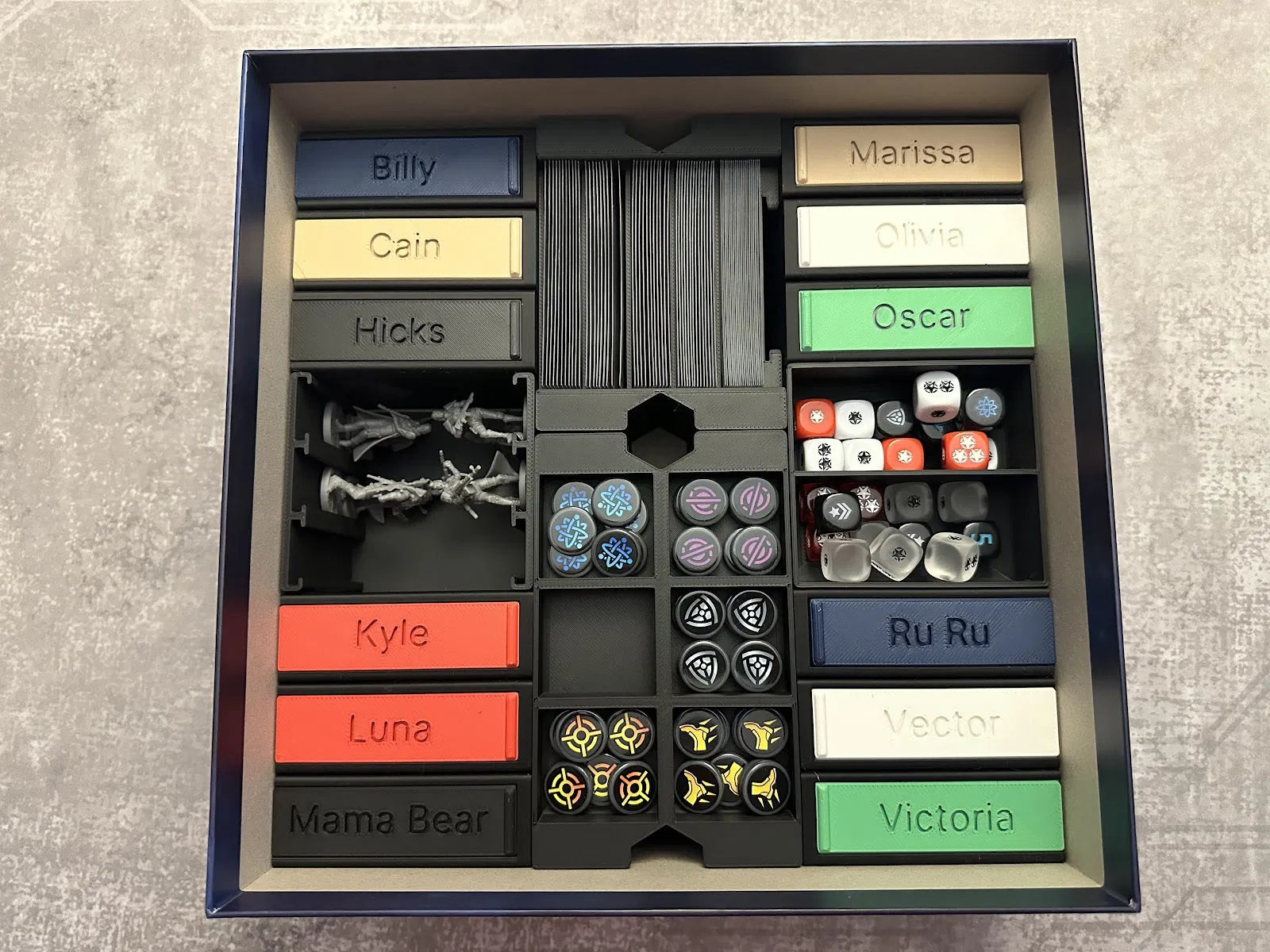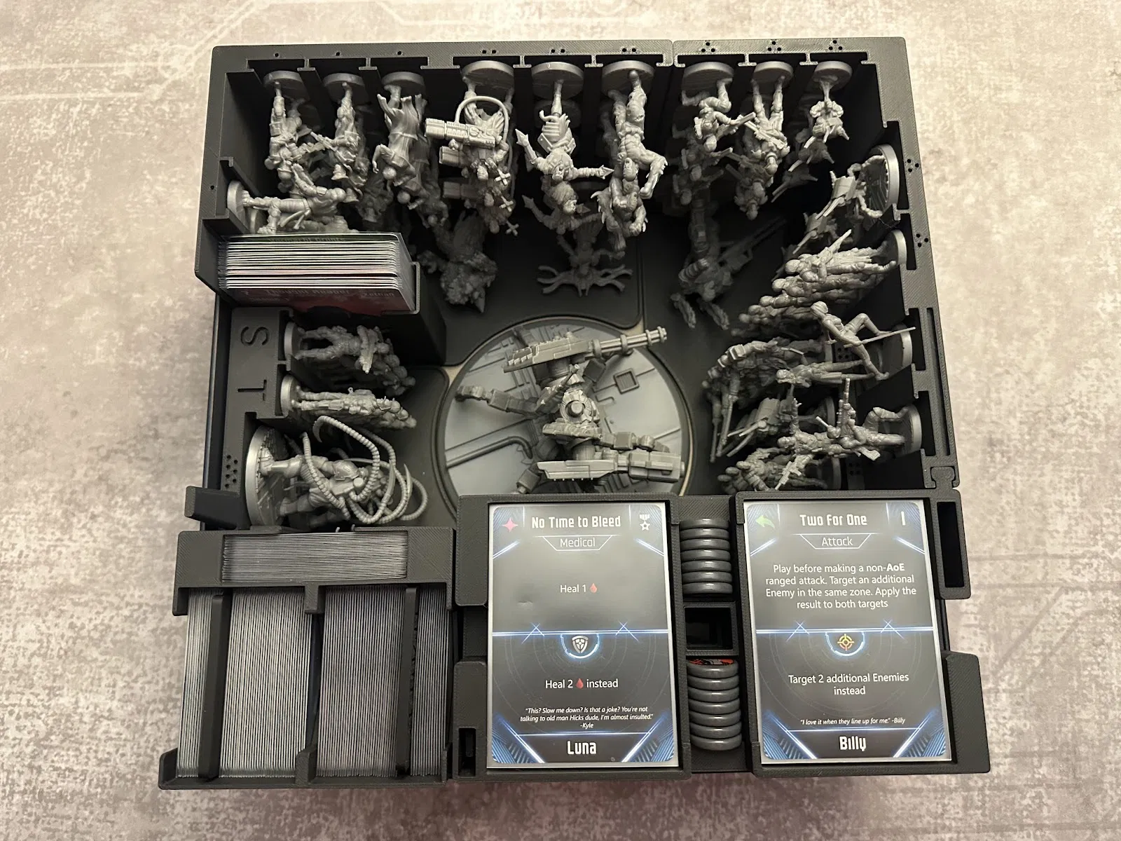Bottom layer - tokens (upgrade / skills / status mỗi loại có 1 khay riêng), dice, damage/alerts, event và enemy draw decks, injury/trauma, và khu lưu trữ operative deck. Có 2 lựa chọn cho operative decks - (A) các khay giữ riêng có nameplate, hoặc (B) 2 hộp card lớn có dividers. Tuỳ chọn B (boxes/dividers) sẽ tiết kiệm khoảng 300g filament. Cá nhân mình thì mình mã hoá màu theo class, rồi lưu theo thứ tự alphabet.