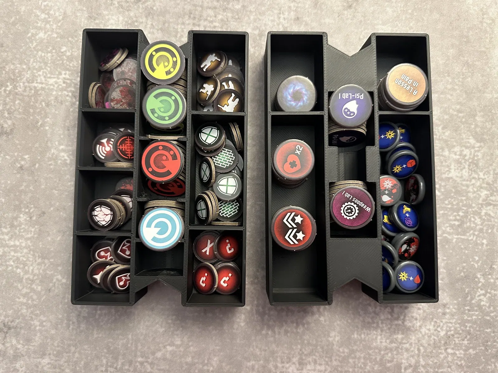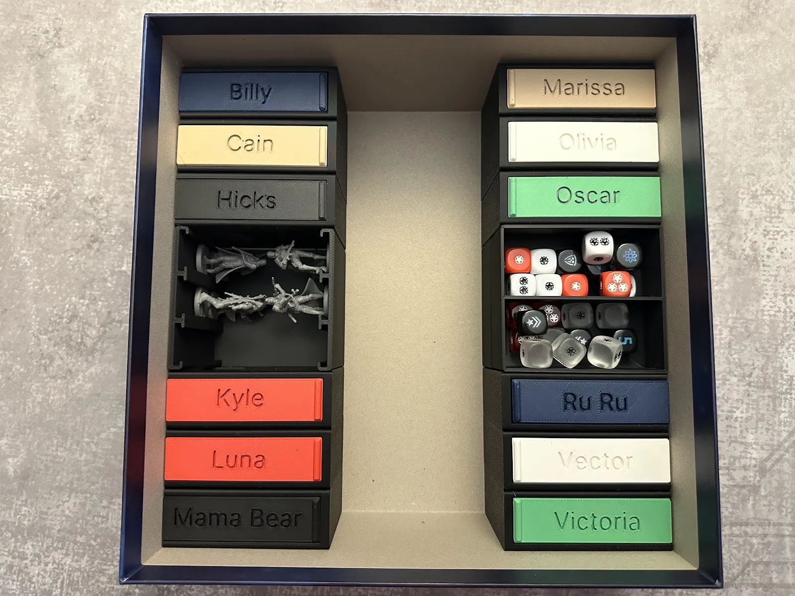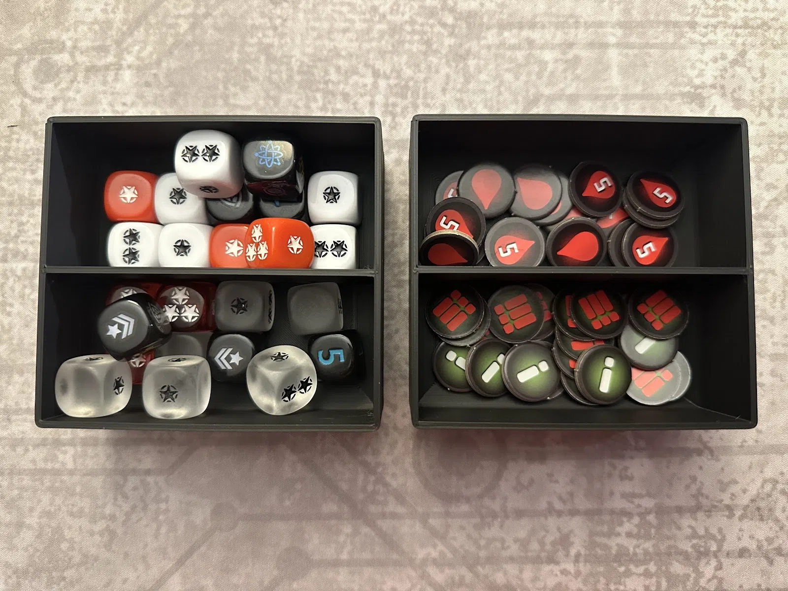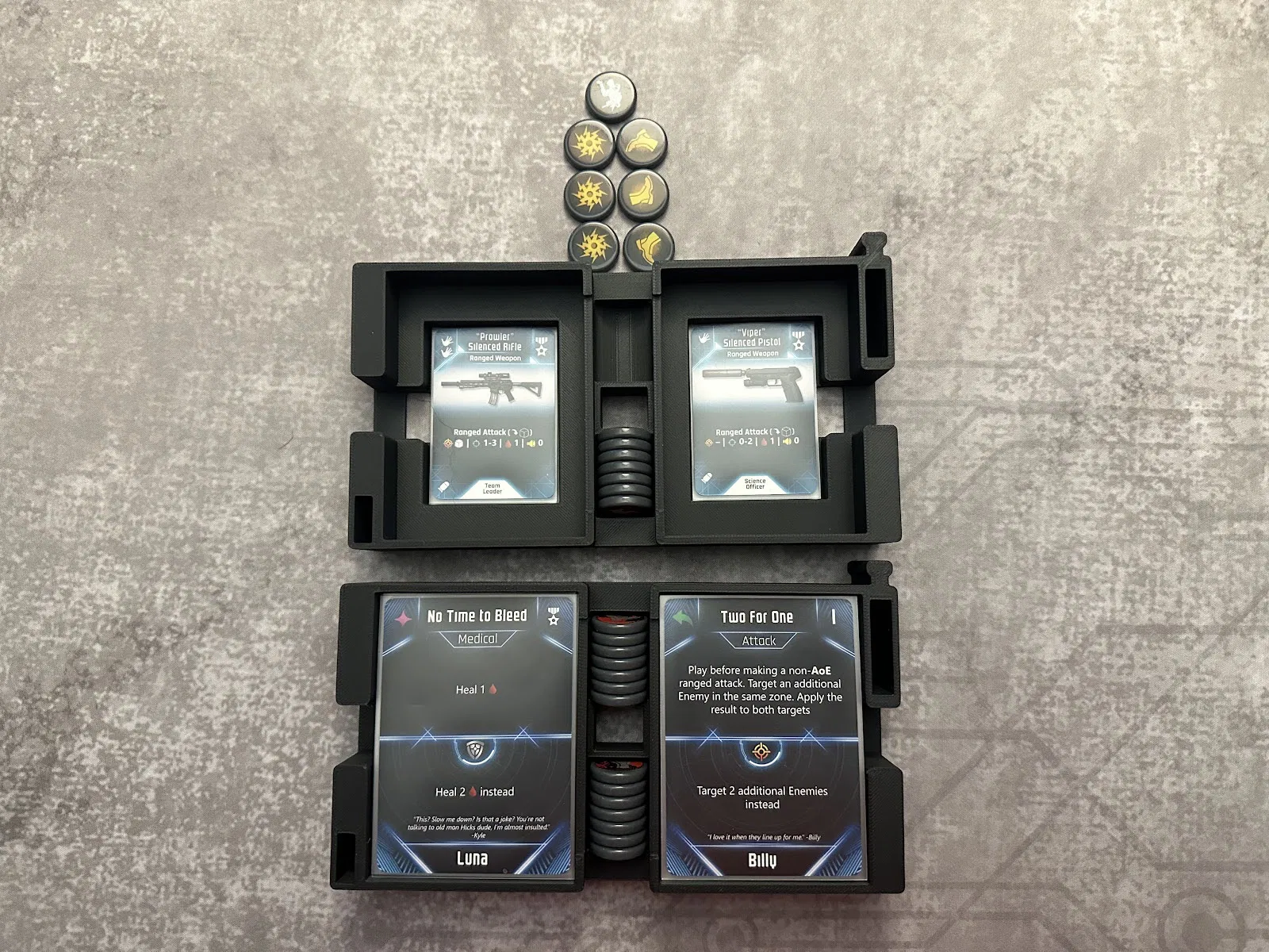 Bottom layer - tokens (upgrade / skills / status mỗi loại có 1 khay riêng), dice, damage/alerts, event và enemy draw decks, injury/trauma, và khu lưu trữ operative deck. Có 2 lựa chọn cho operative decks - (A) các khay giữ riêng có nameplate, hoặc (B) 2 hộp card lớn có dividers. Tuỳ chọn B (boxes/dividers) sẽ tiết kiệm khoảng 300g filament. Cá nhân mình thì mình mã hoá màu theo class, rồi lưu theo thứ tự alphabet.