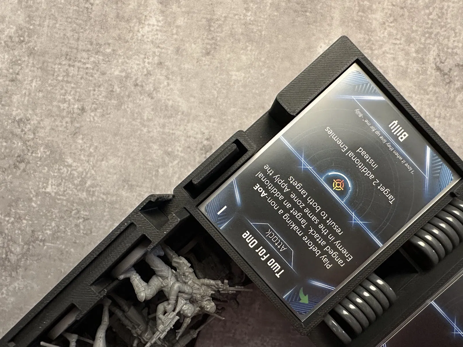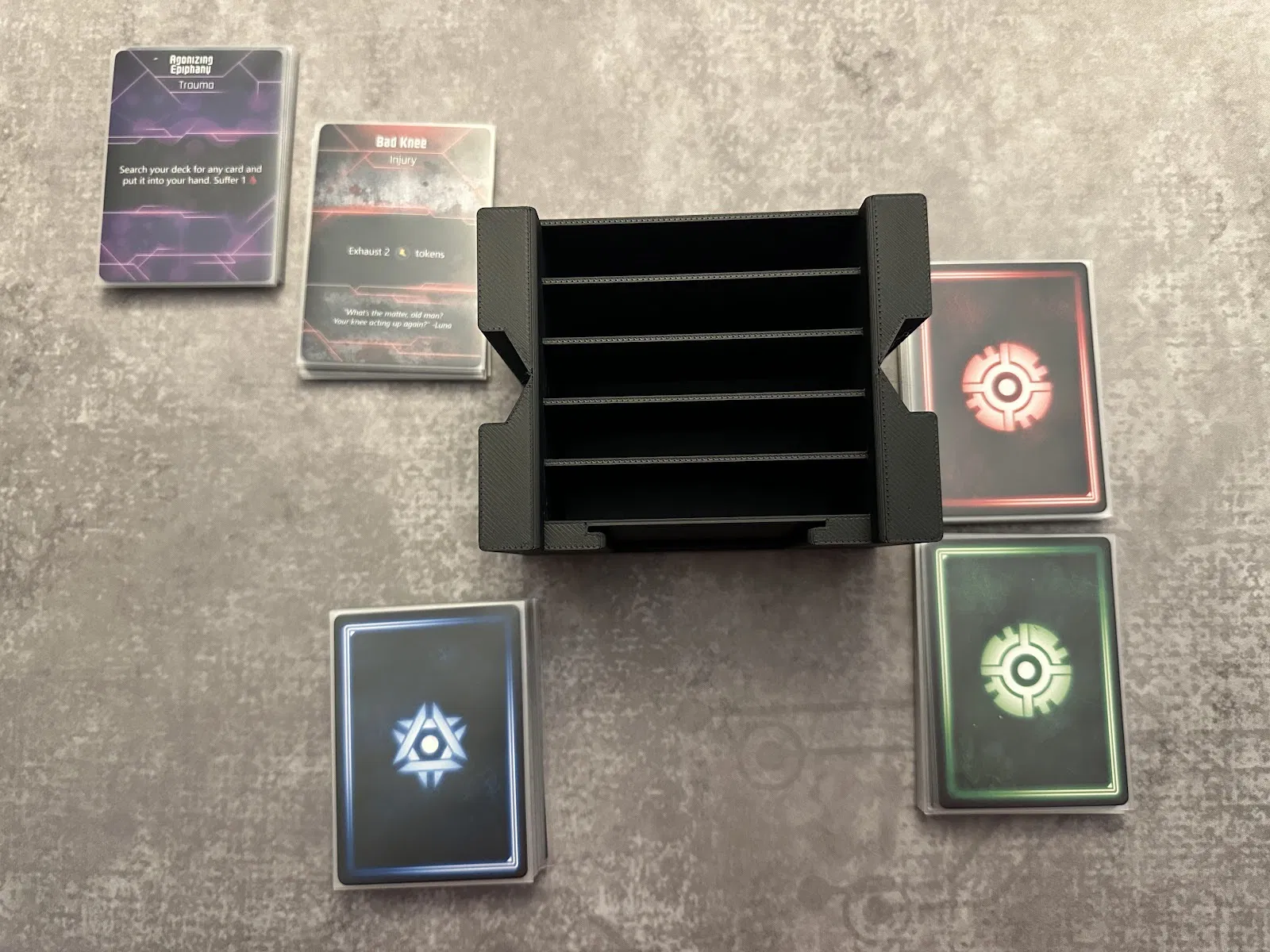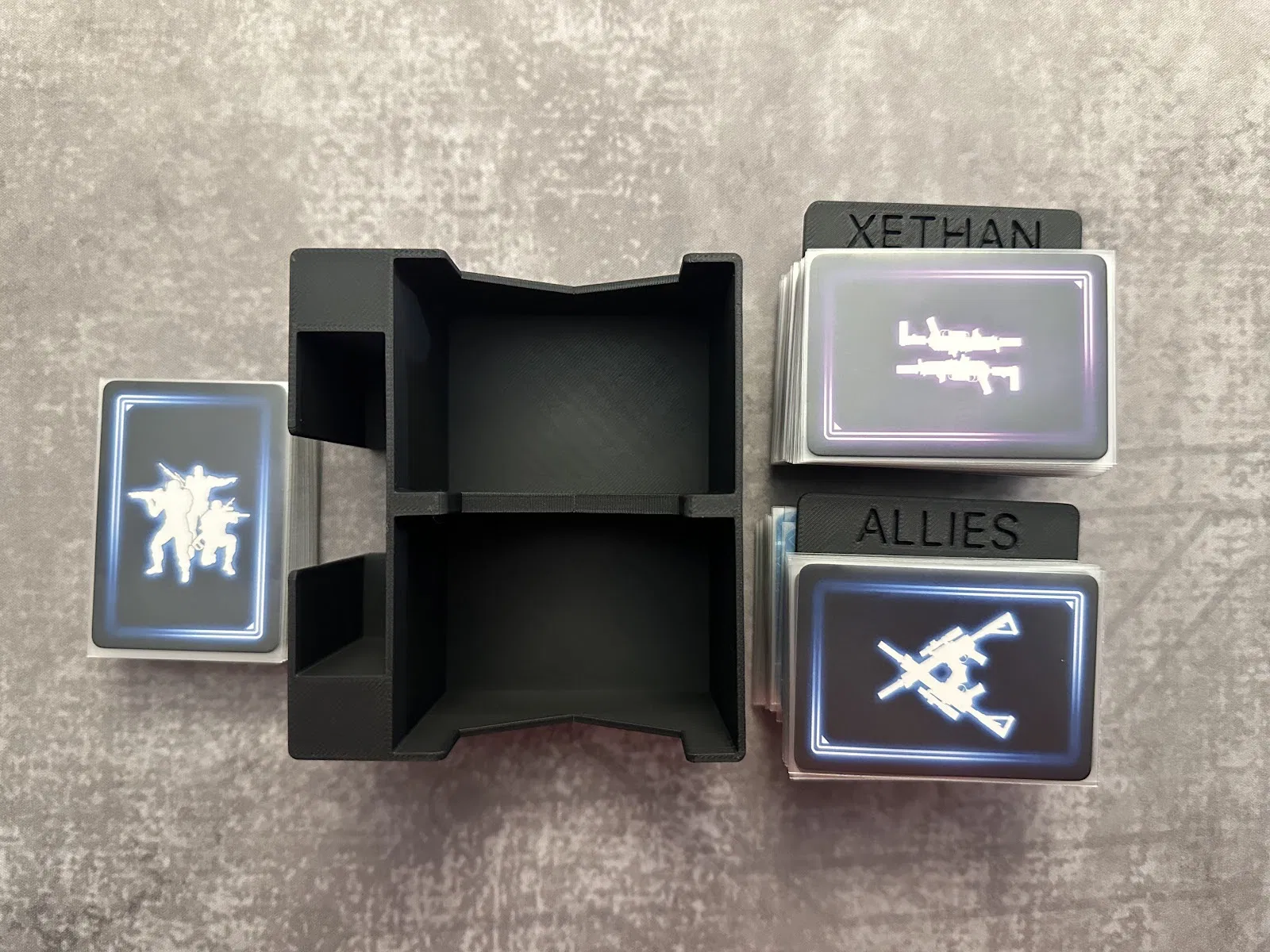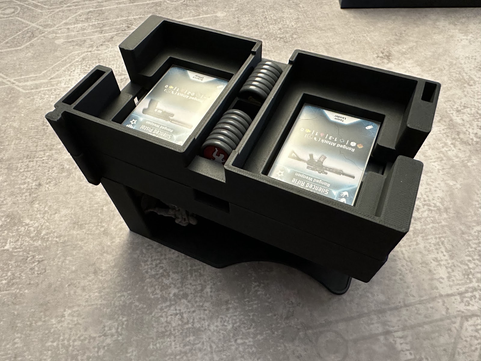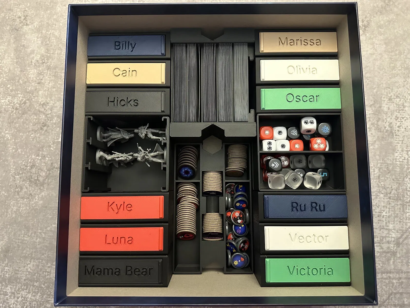 Bottom layer - tokens (upgrade / skills / status mỗi loại có 1 khay riêng), dice, damage/alerts, event và enemy draw decks, injury/trauma, và khu lưu trữ operative deck. Có 2 lựa chọn cho operative decks - (A) các khay giữ riêng có nameplate, hoặc (B) 2 hộp card lớn có dividers. Tuỳ chọn B (boxes/dividers) sẽ tiết kiệm khoảng 300g filament. Cá nhân mình thì mình mã hoá màu theo class, rồi lưu theo thứ tự alphabet.