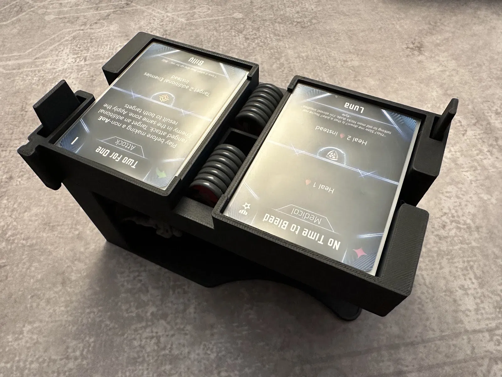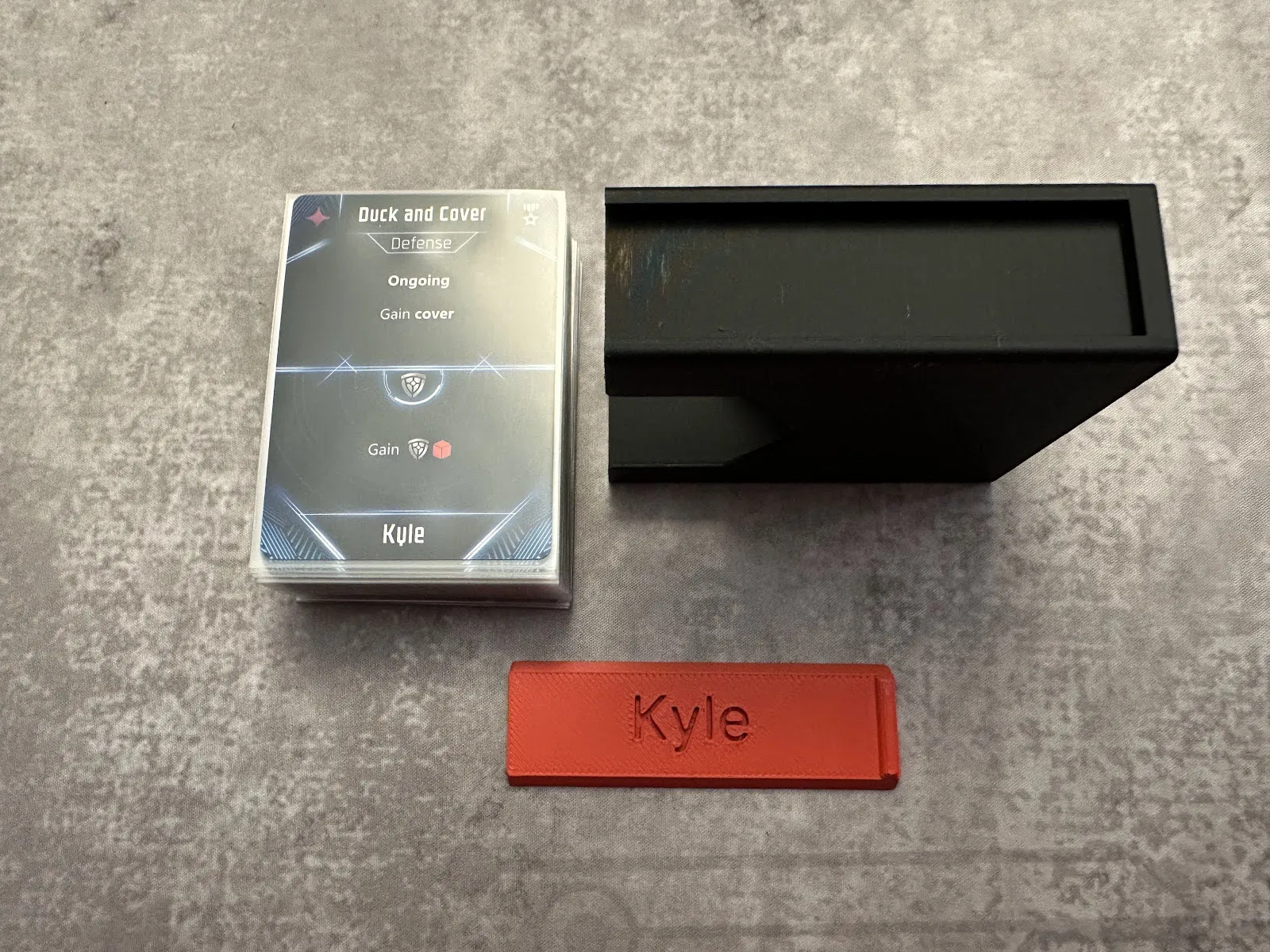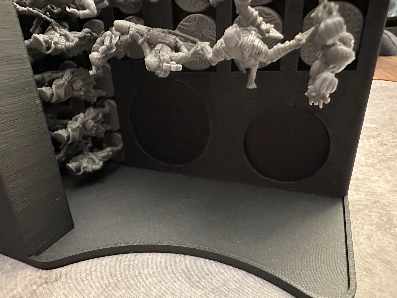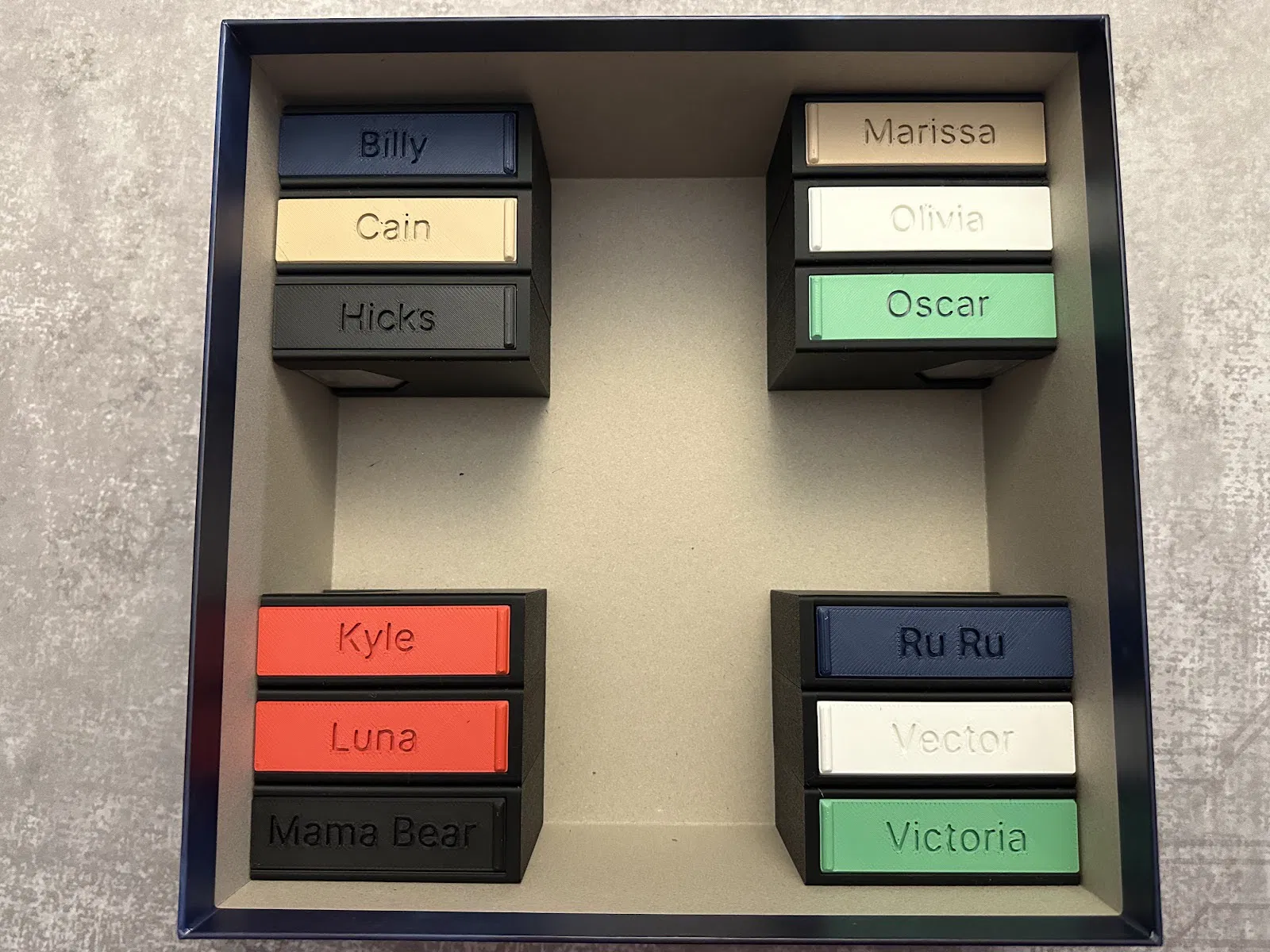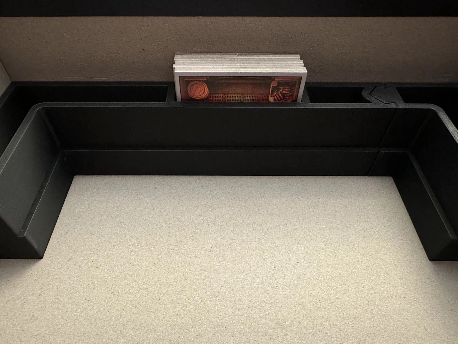 Bottom layer - tokens (upgrade / skills / status mỗi loại có 1 khay riêng), dice, damage/alerts, event và enemy draw decks, injury/trauma, và khu lưu trữ operative deck. Có 2 lựa chọn cho operative decks - (A) các khay giữ riêng có nameplate, hoặc (B) 2 hộp card lớn có dividers. Tuỳ chọn B (boxes/dividers) sẽ tiết kiệm khoảng 300g filament. Cá nhân mình thì mình mã hoá màu theo class, rồi lưu theo thứ tự alphabet.