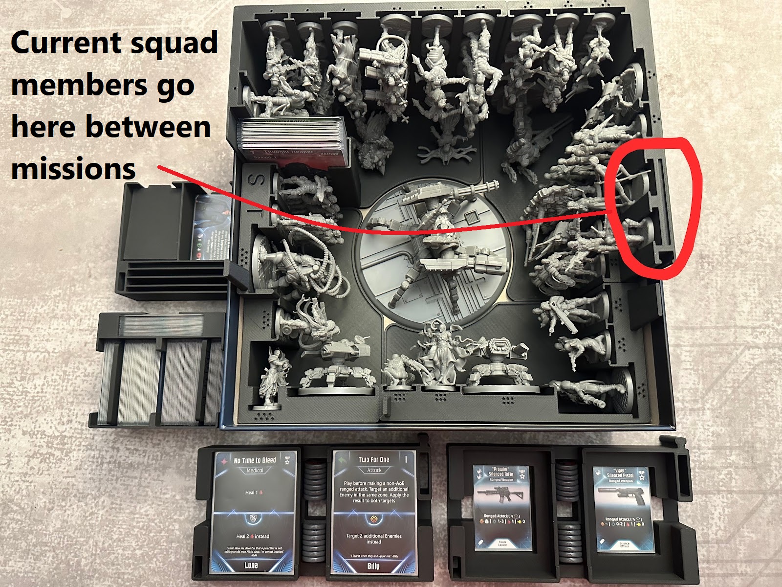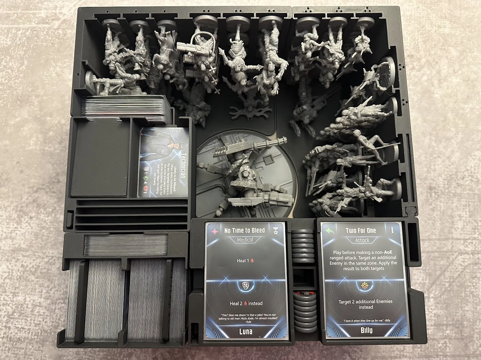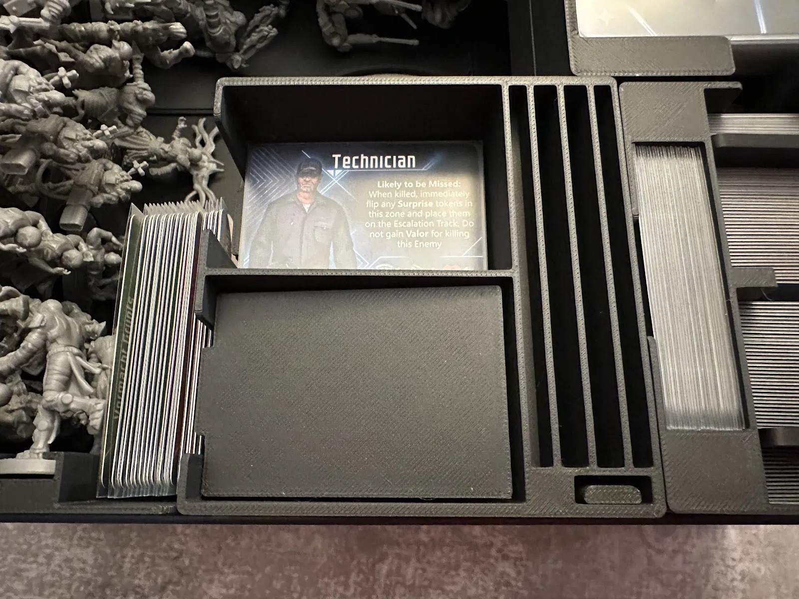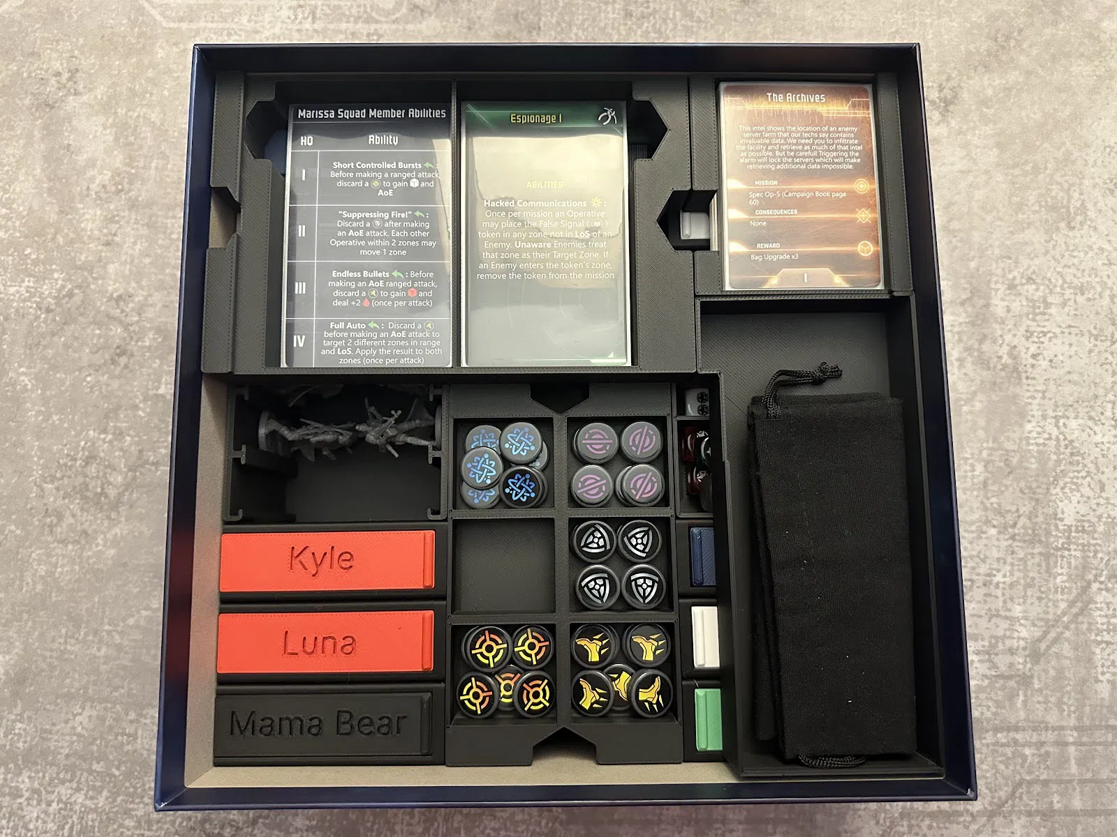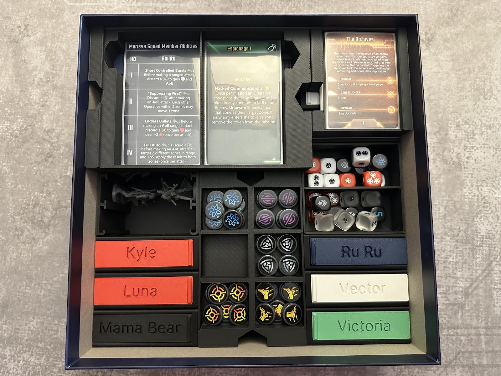 Top - miniatures, khay campaign của người chơi (chứa action tokens, gear và các deck đang dùng), items, enemy cards, và các card nhỏ linh tinh. Kẻ địch được sắp theo các dấu pips dọc mép ngoài để chỉ tier. Technicians và Soldiers có vị trí riêng, và có chỗ để cất mini operative của campaign hiện tại ngay cạnh khay người chơi (khoanh đỏ).