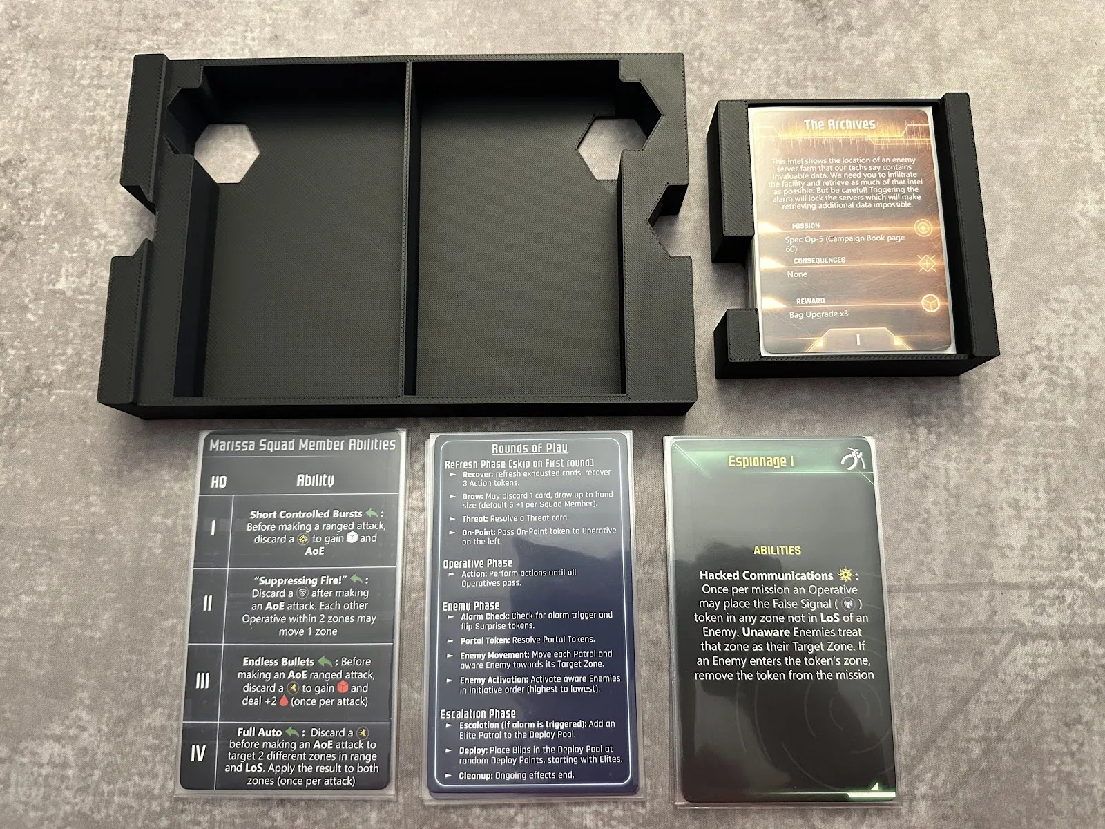 Những file cần in hơn 1 bản: player campaign trays (core box top), mini card divider (core box top), L spacer (core box bottom), và lựa chọn lưu operative deck của bạn A hoặc B.