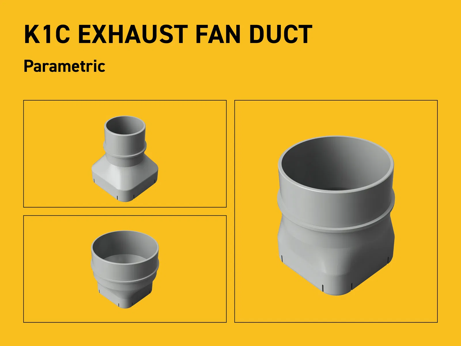 Ống dẫn gió quạt xả parametric này được thiết kế cho Creality K1C để dẫn khí thải ra ngoài hiệu quả bằng ống thông gió (ventilation hose). Thiết kế tùy biến cho phép bạn chỉnh đường kính miệng ống để khớp với kích thước ống của bạn.