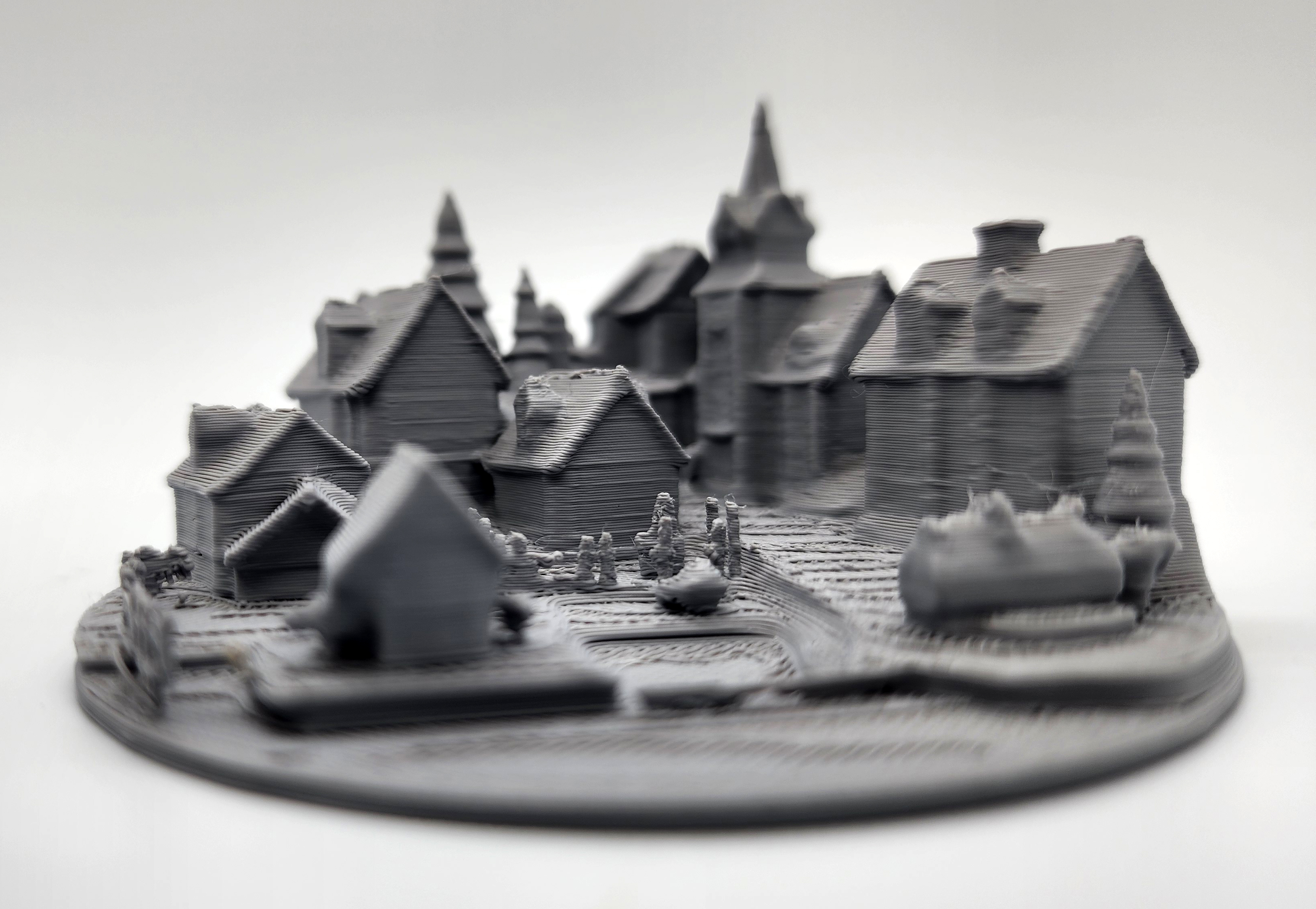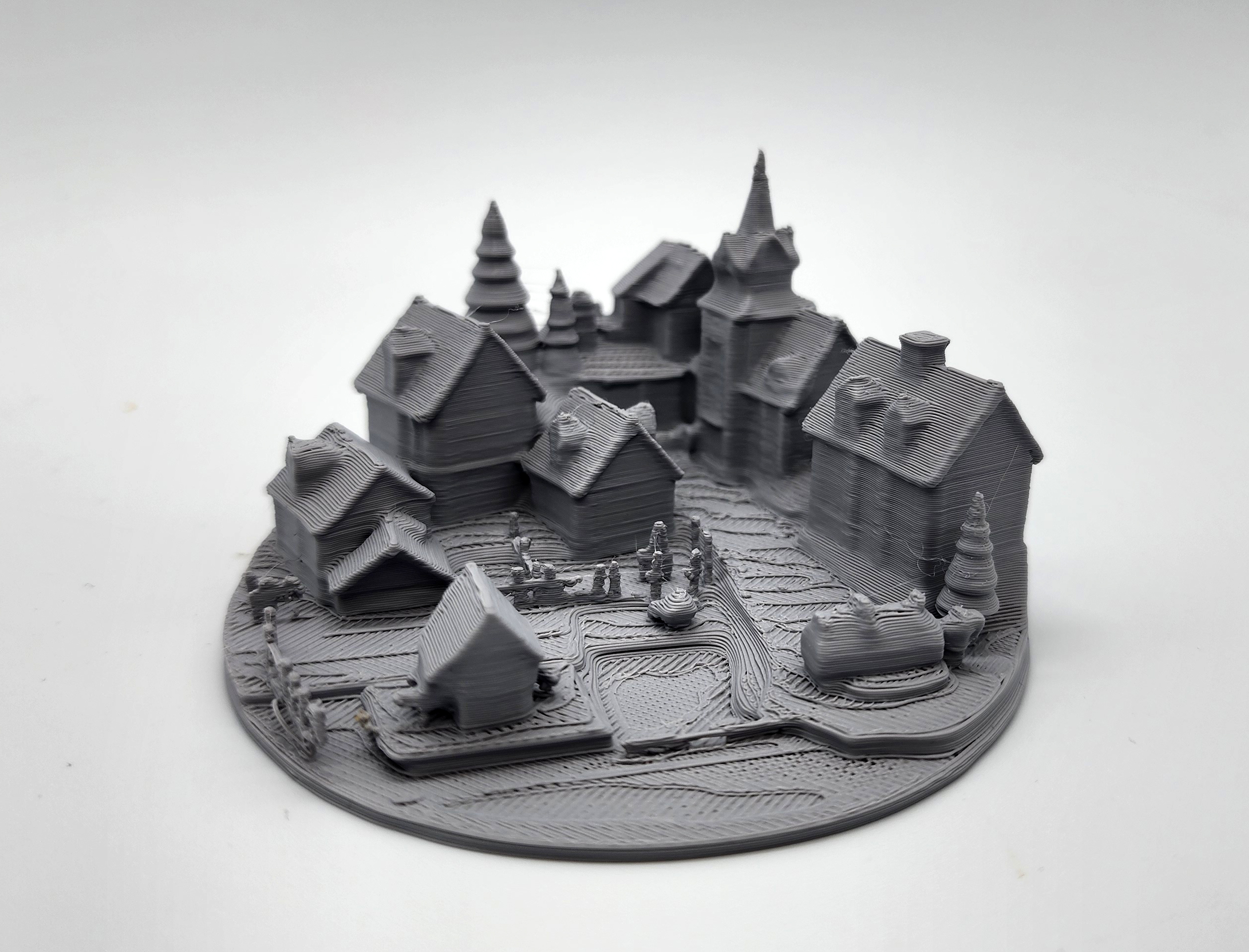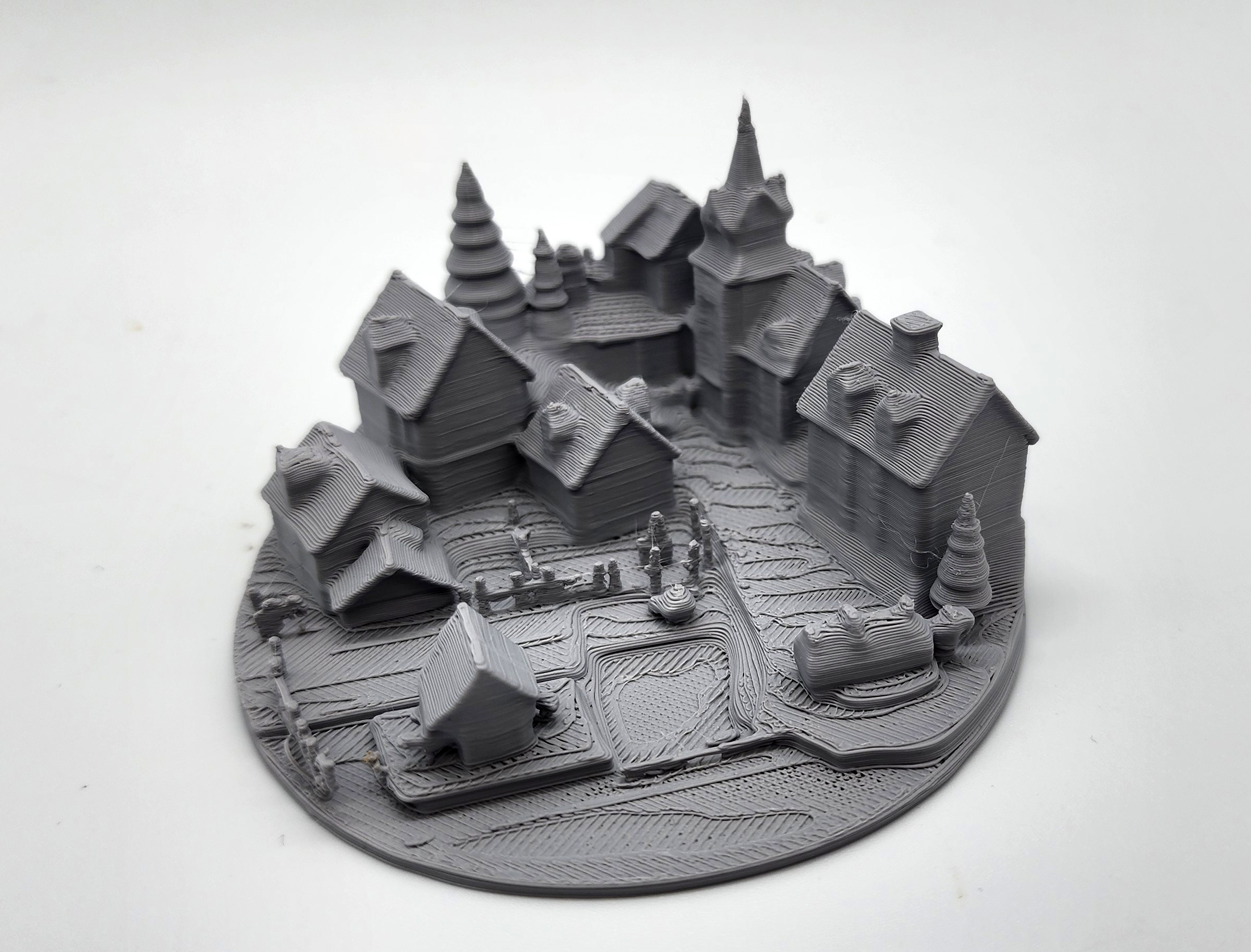 Mô hình làng/ thị trấn thu nhỏ gồm nhà thờ, chuồng ngựa và nhiều công trình xung quanh, phù hợp làm terrain cho tabletop/RPG. Thiết kế tối ưu để in 3D mà không cần Supports.