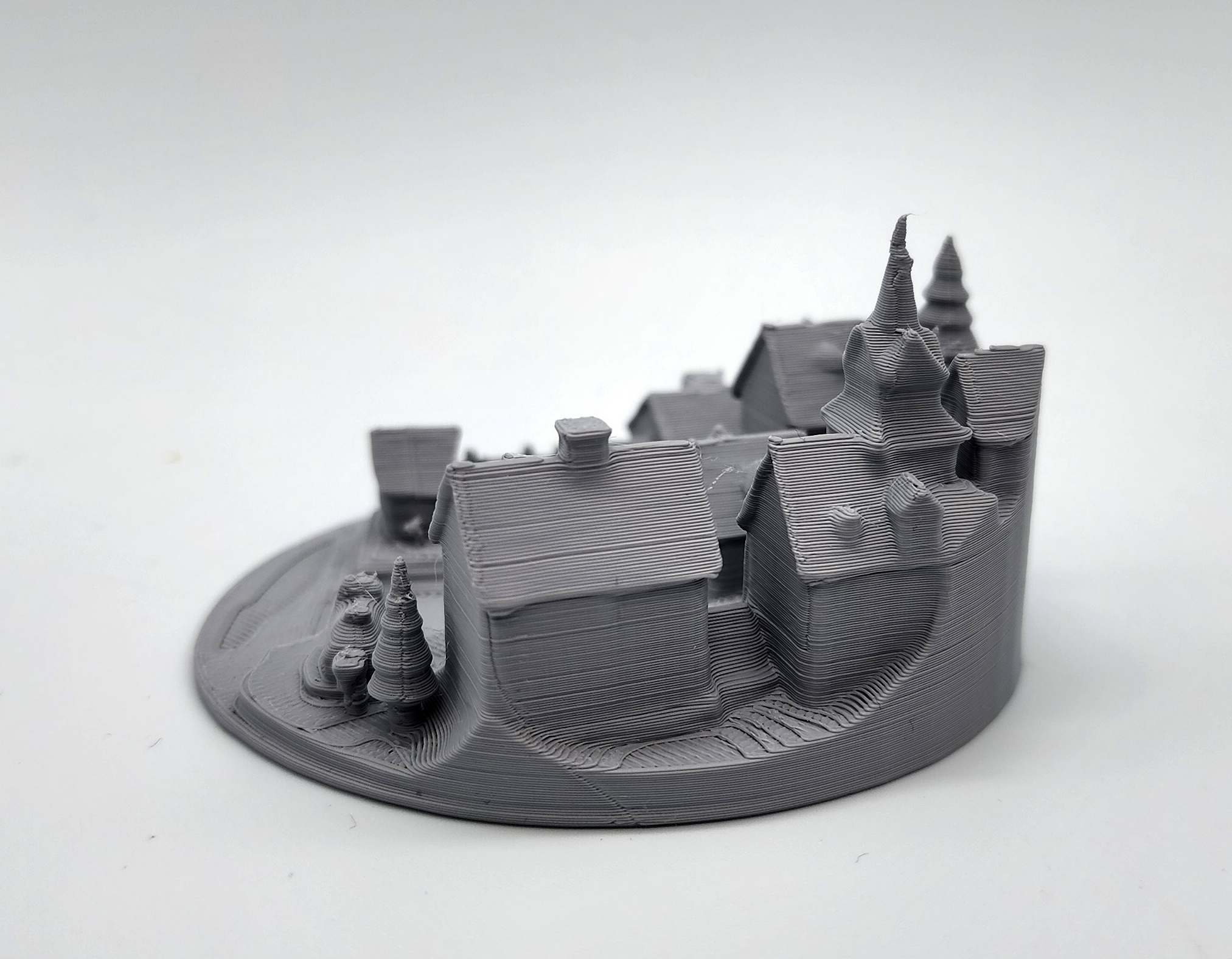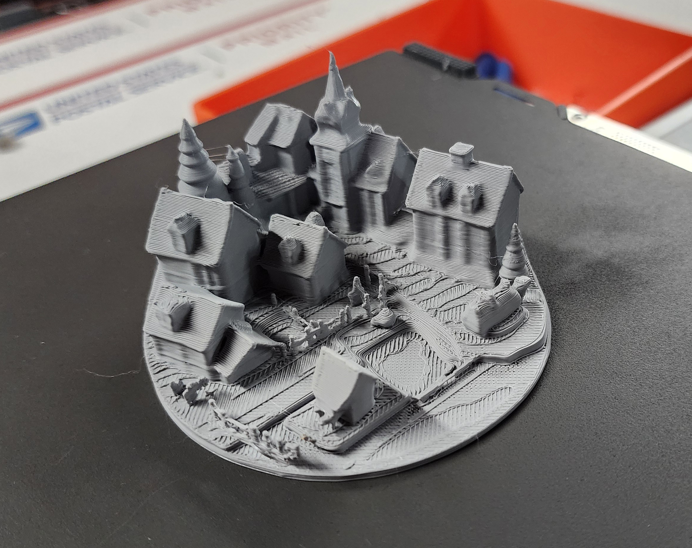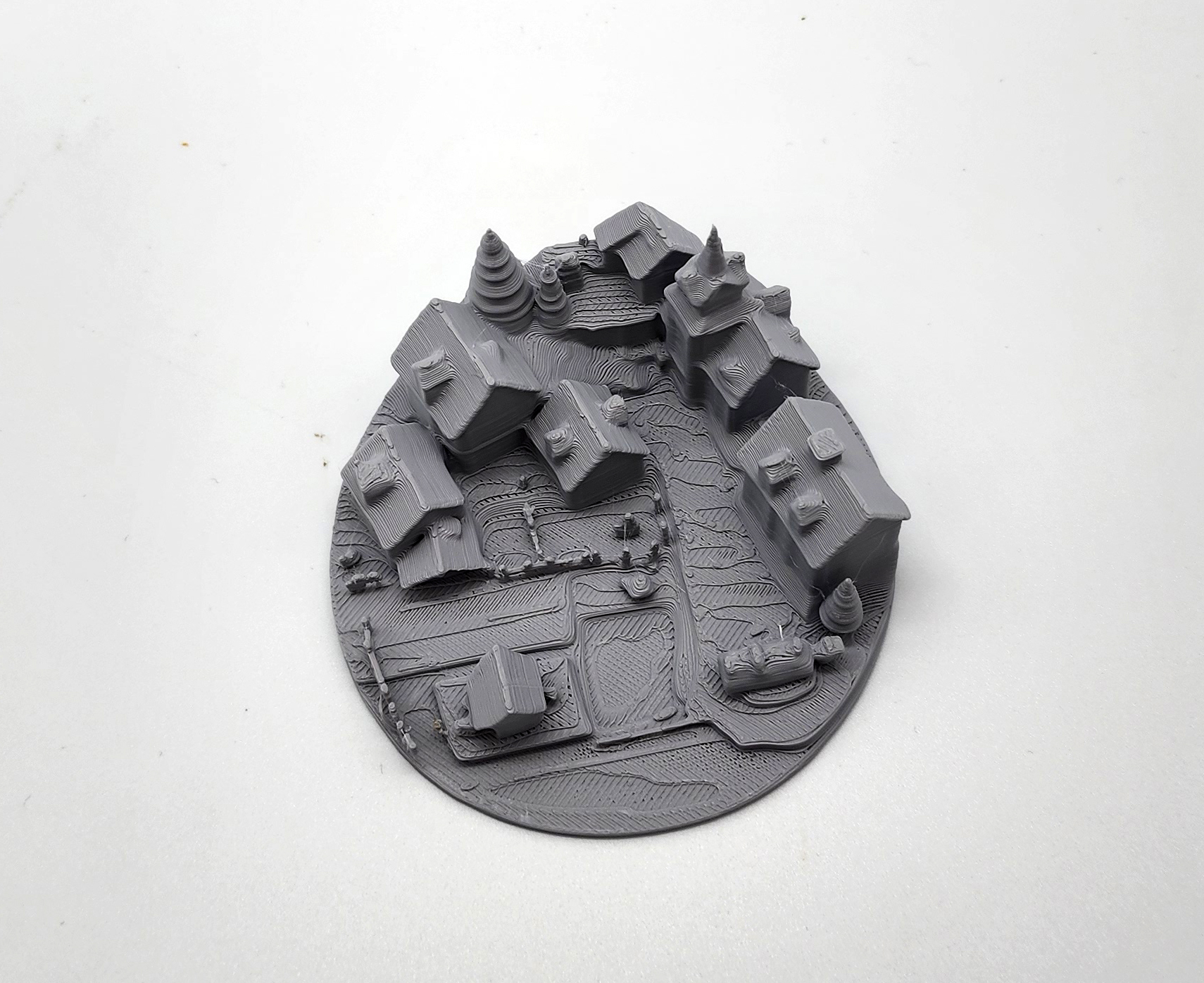 Mô hình làng/ thị trấn thu nhỏ gồm nhà thờ, chuồng ngựa và nhiều công trình xung quanh, phù hợp làm terrain cho tabletop/RPG. Thiết kế tối ưu để in 3D mà không cần Supports.