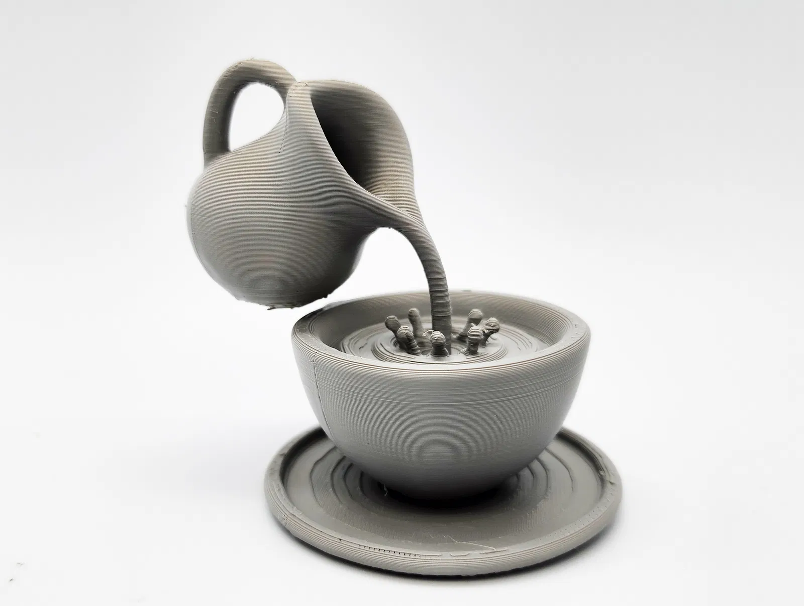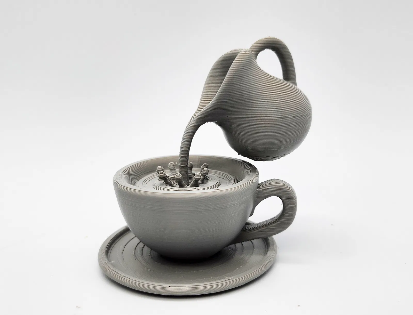Mẫu “Impossible Pour” dạng 1 mảnh, tạo hiệu ứng bình rót nước lơ lửng như ảo thuật. Chỉ cần dùng tree supports (đặt trên build plate) và gỡ support thật nhẹ tay để giữ chi tiết đẹp.