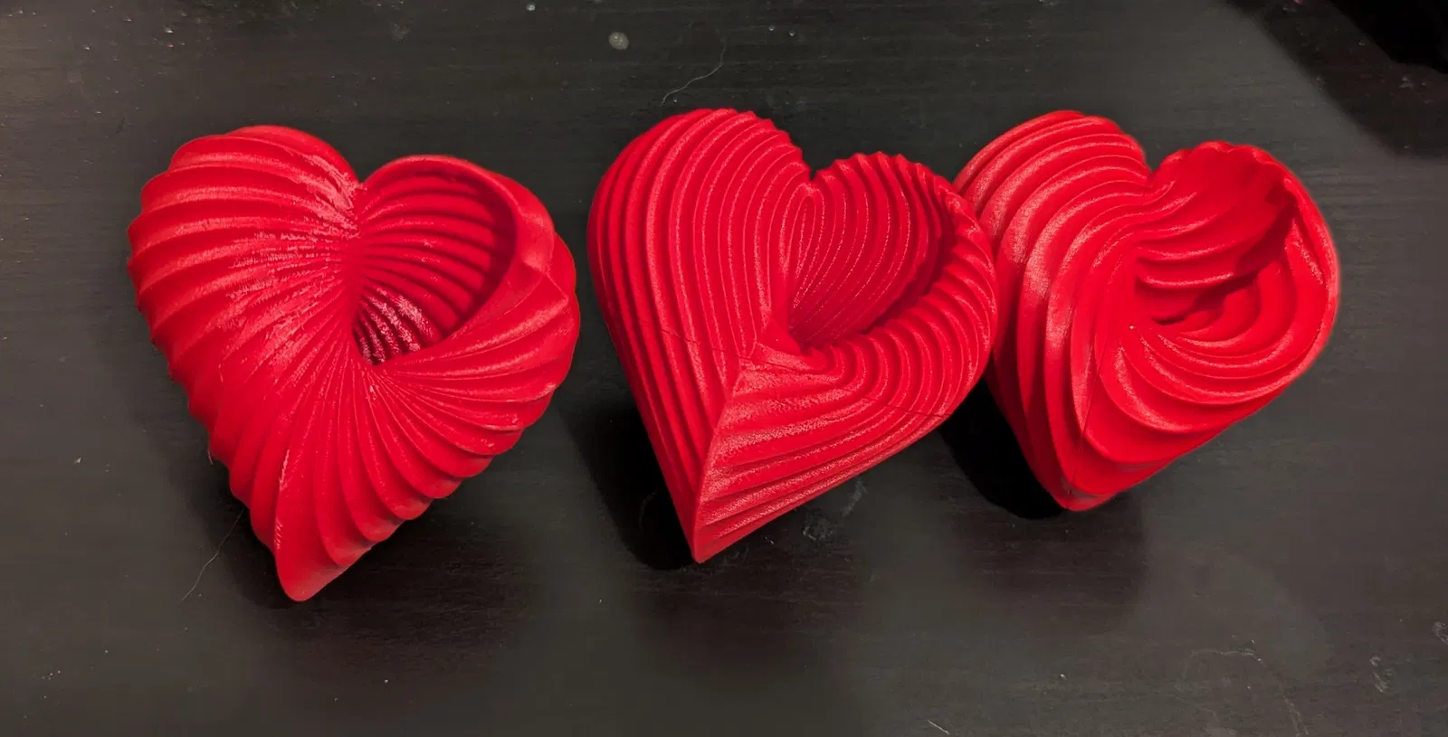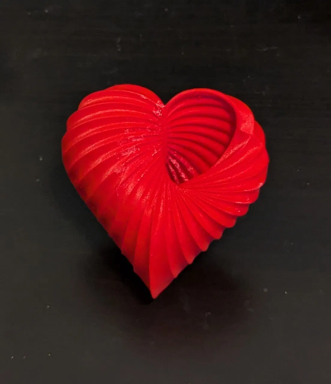 Biến thể dải Möbius Sudanese hình trái tim. Model gồm 1 nửa: in 2 bản rồi dán lại. Cần supports (khuyên tree supports) và nên dùng brim. Có bản có lỗ để cắm đoạn filament giúp canh khi dán; kèm cả bản nguyên khối để in resin.