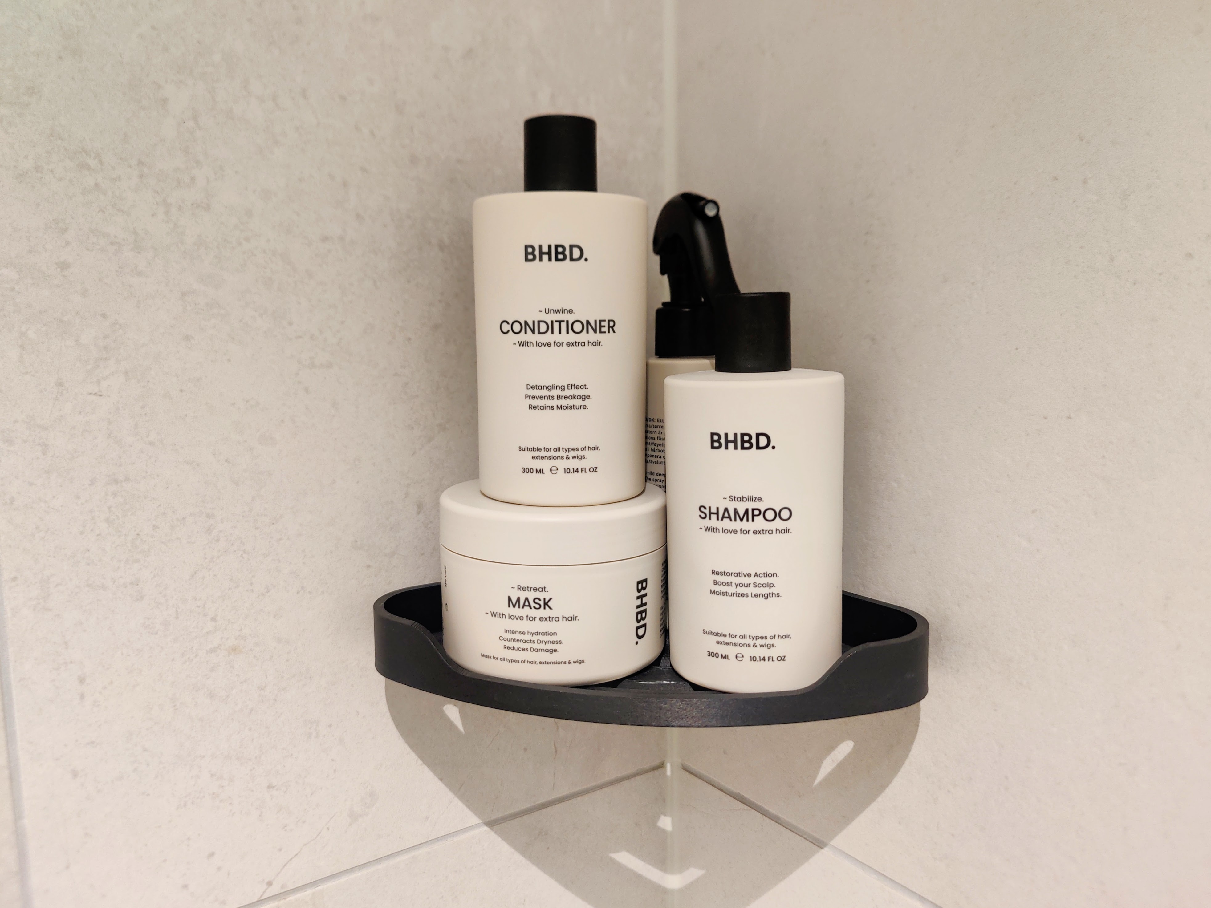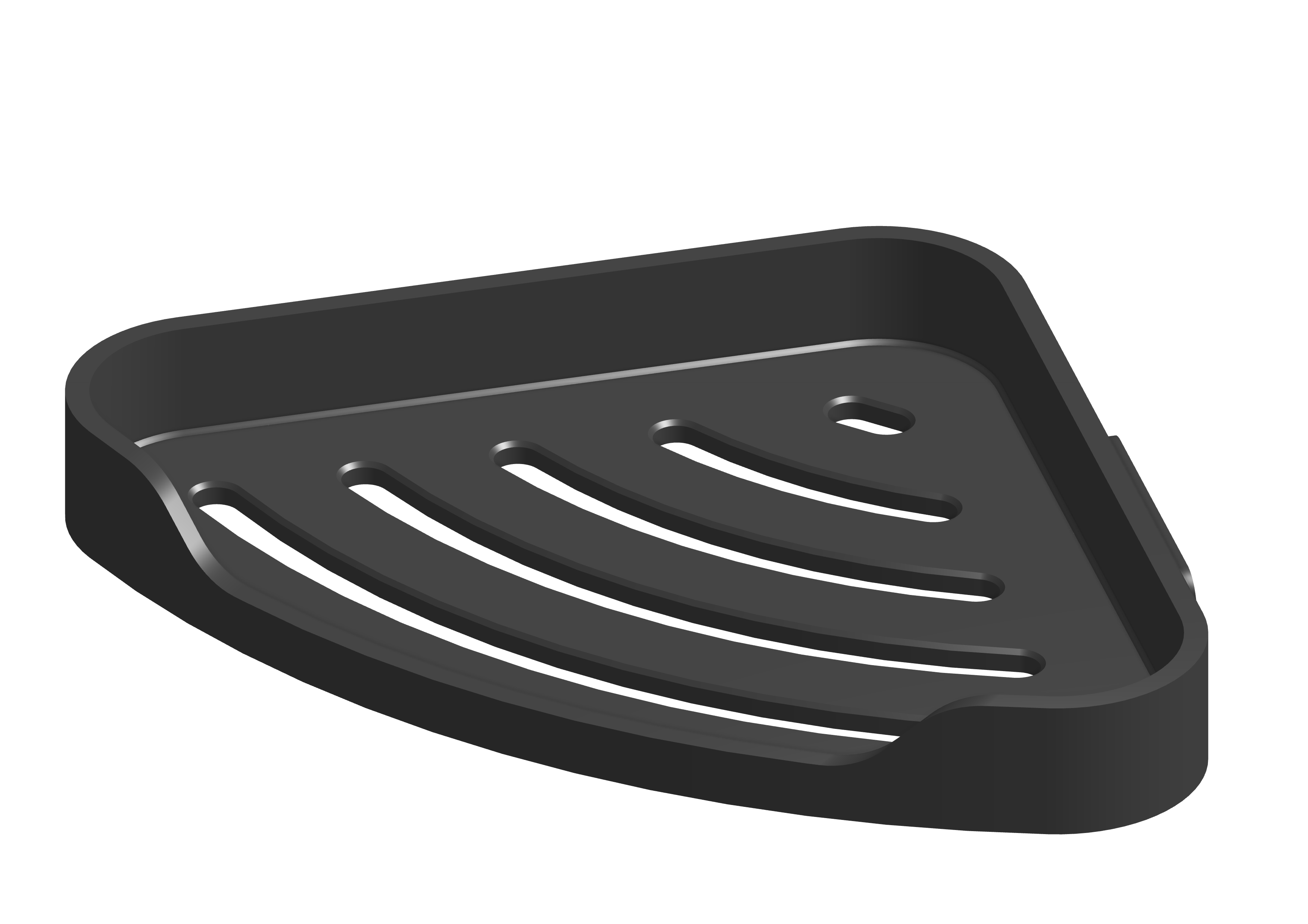 Kệ góc cho khu vực vòi sen, gắn bằng băng keo 2 mặt nên không cần khoan hay bắt vít. Đủ để 5–6 chai, thiết kế gọn và nhìn như “lơ lửng”. Gồm kệ chính, 2 bracket và guide căn vị trí.