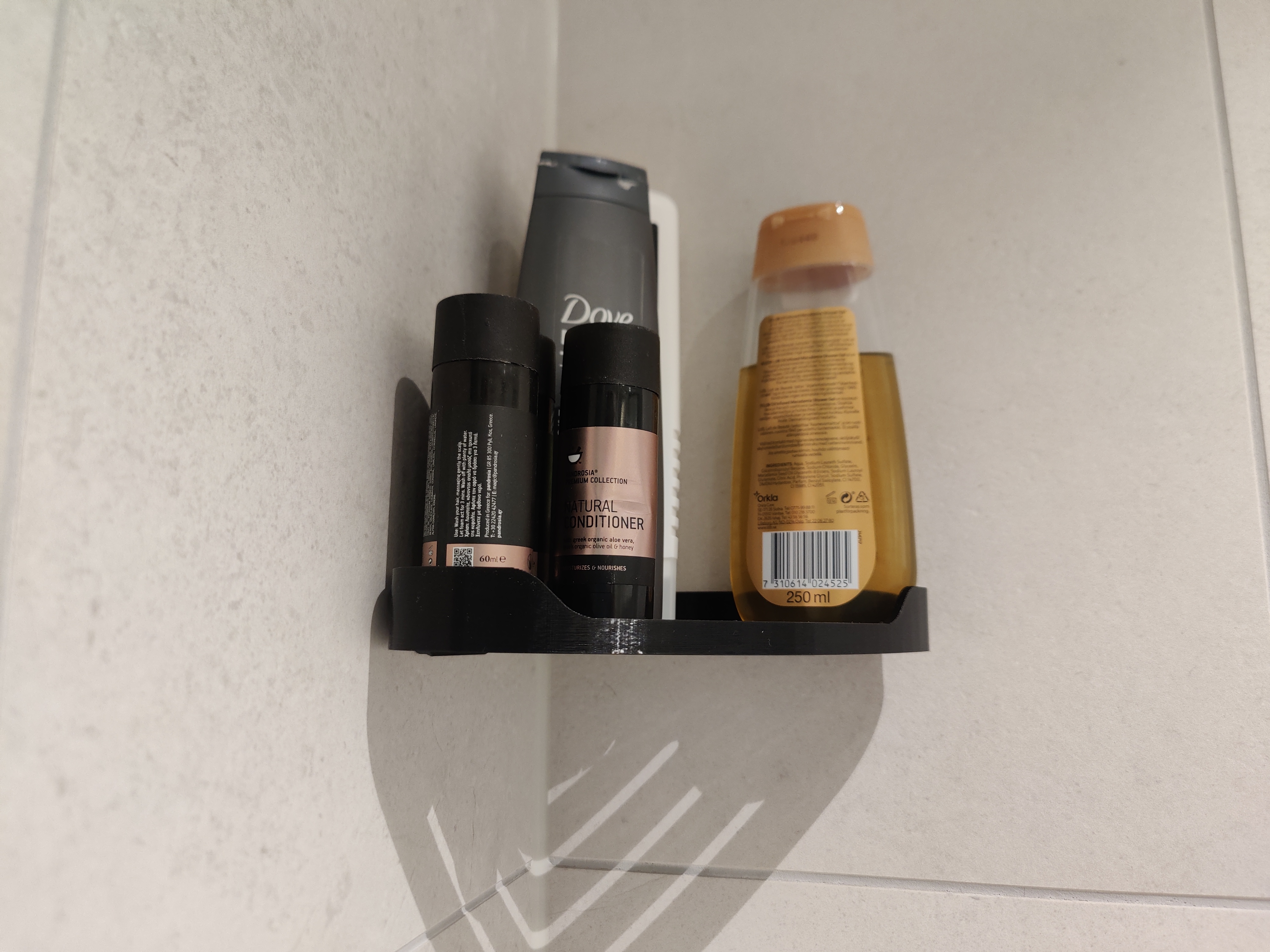 Đây là một cái kệ đơn giản, dễ gắn cho góc phòng tắm (trong khu vực vòi sen). Kệ được dán bằng băng keo 2 mặt và đủ rộng để để khoảng 5–6 chai kích thước bình thường. Thiết kế gọn gàng, tối giản và tạo cảm giác như đang “lơ lửng”.