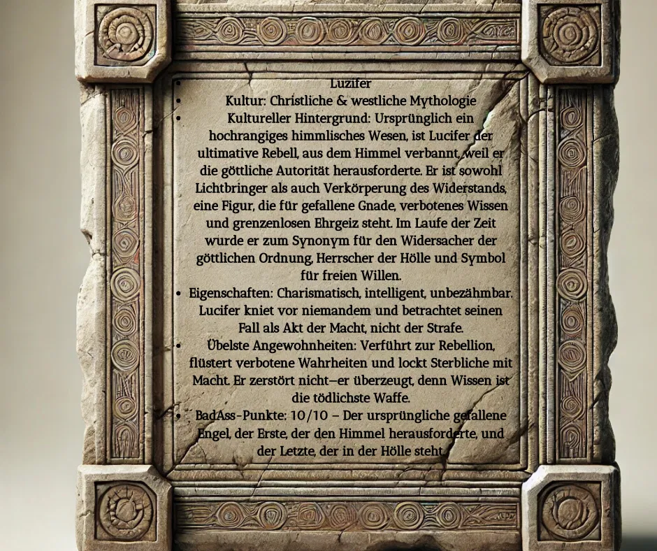 • Kultureller Hintergrund: Ursprünglich ein hochrangiges himmlisches Wesen, ist Lucifer der ultimative Rebell, aus dem Himmel verbannt, weil er die göttliche Autorität herausforderte. Er ist sowohl Lichtbringer als auch Verkörperung des Widerstands, eine Figur, die für gefallene Gnade, verbotenes Wissen und grenzenlosen Ehrgeiz steht. Im Laufe der Zeit wurde er zum Synonym für den Widersacher der göttlichen Ordnung, Herrscher der Hölle und Symbol für freien Willen.