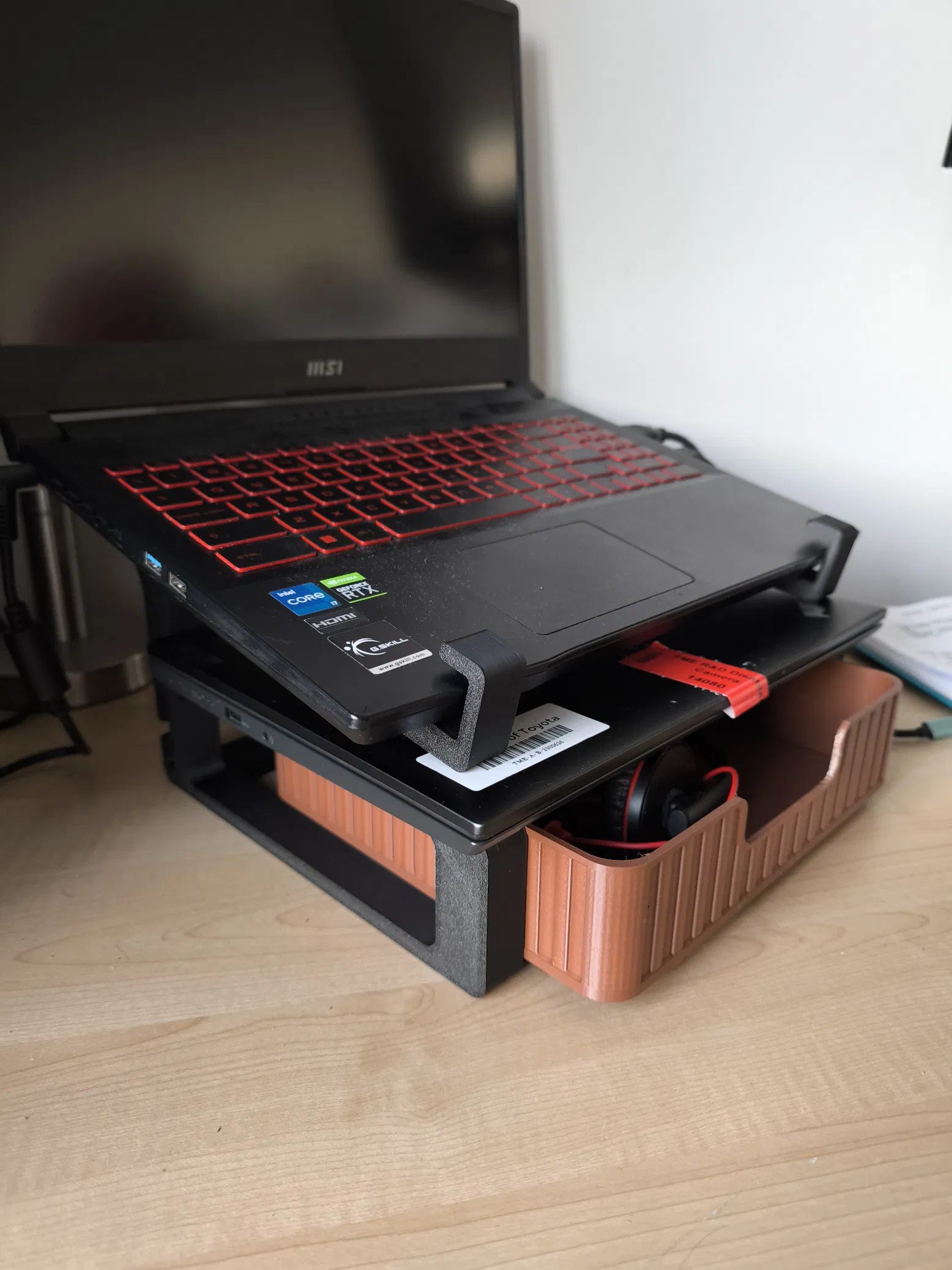 Bản remix của kệ để 2 laptop có ngăn kéo organiser, được kéo dài phần đế và thêm móc đỡ phía sau để tăng độ chắc chắn, hạn chế laptop bị trượt ra khỏi gờ giữ ở phía trên.