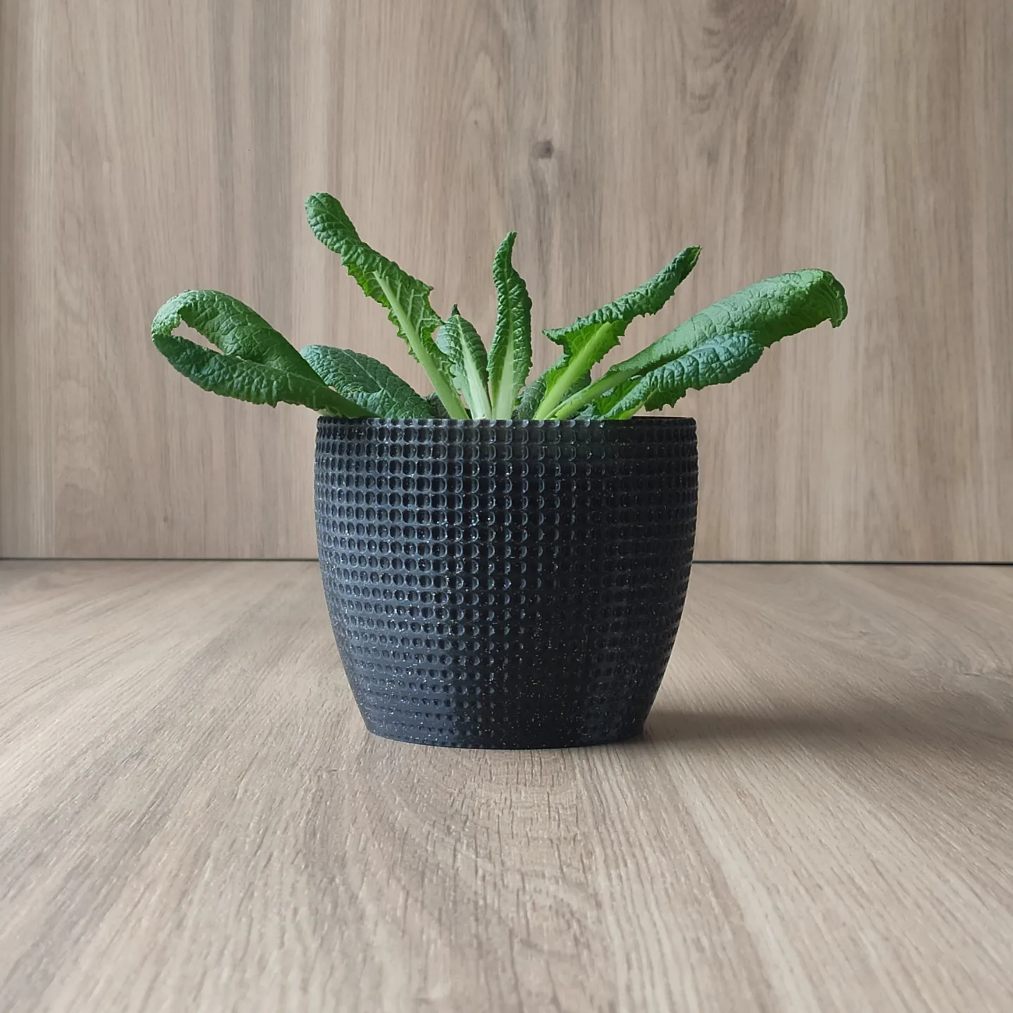 Planter dạng chậu trồng cây với họa tiết chấm (dotted pattern), hỗ trợ in ở vase mode. Gợi ý cài đặt để tường dày hơn: Outer wall 2–3, Inner wall 0, Infill 0%, Top layers 0.