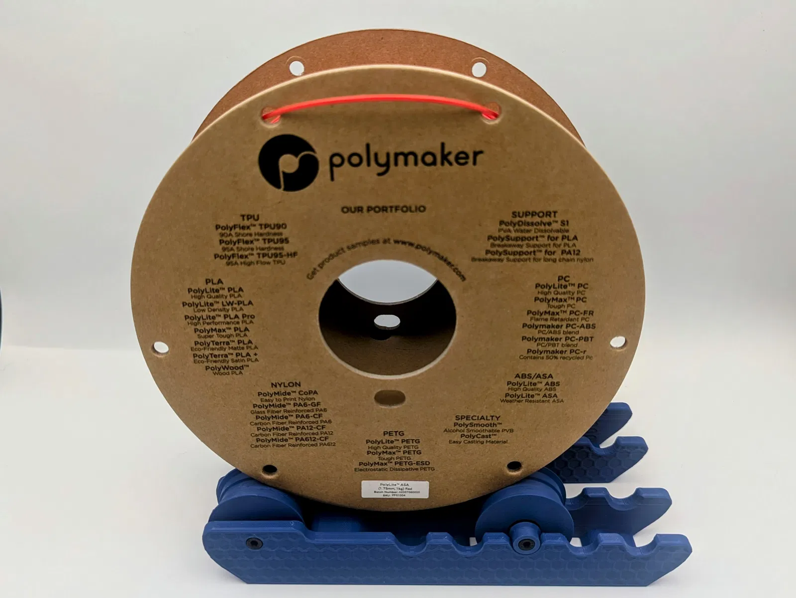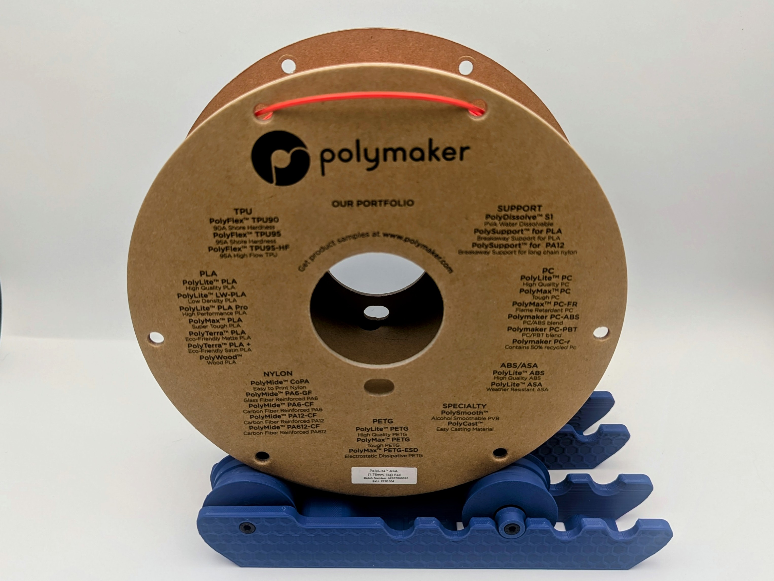 Spool holder dạng spool roller có base điều chỉnh, dùng được spool đường kính 100–300mm (phổ biến 1kg ~200mm). Đã test với PolyMaker 1kg/3kg/5kg, không cần supports, lắp bearing 608rs (M3 hoặc M4).