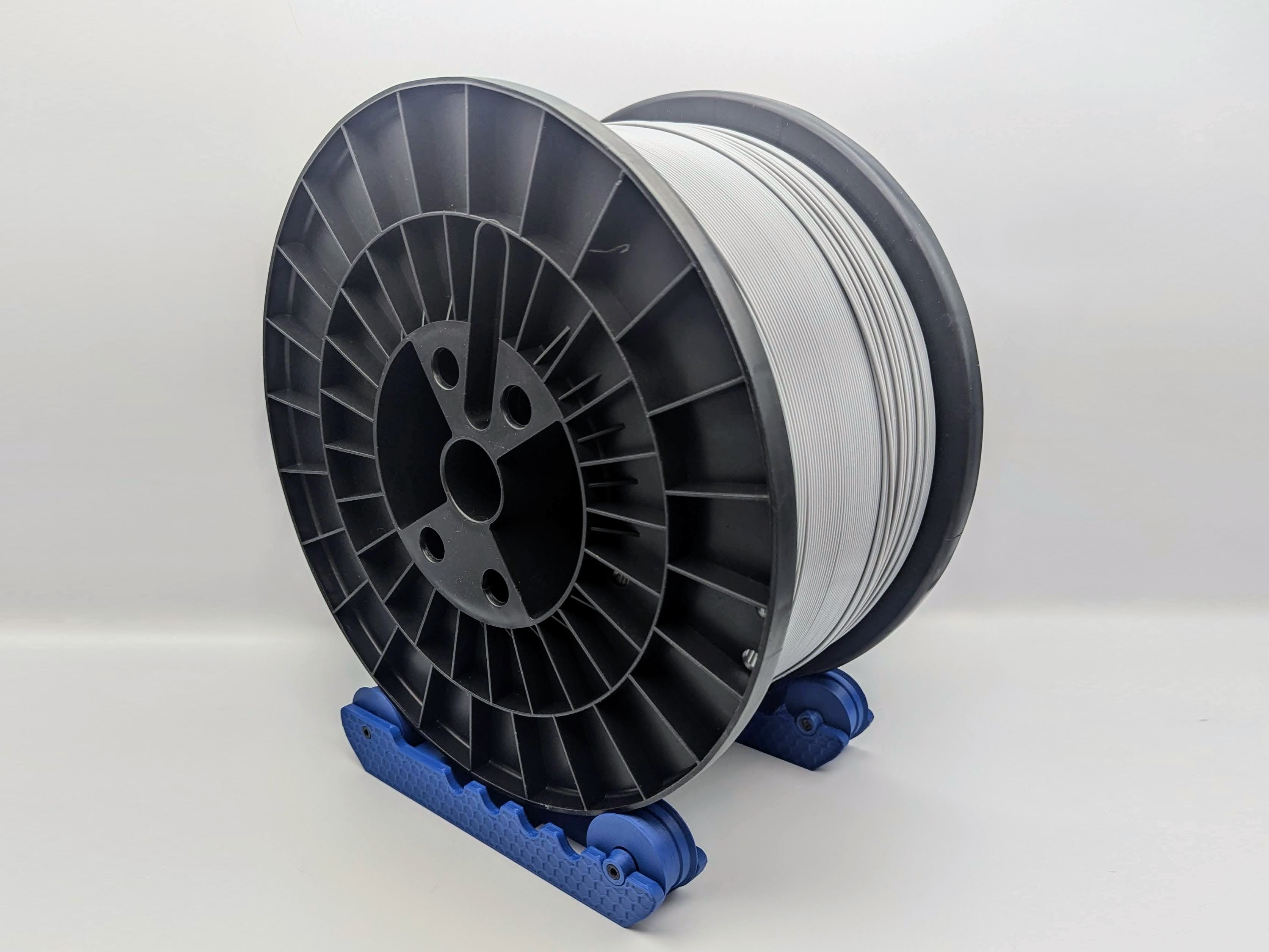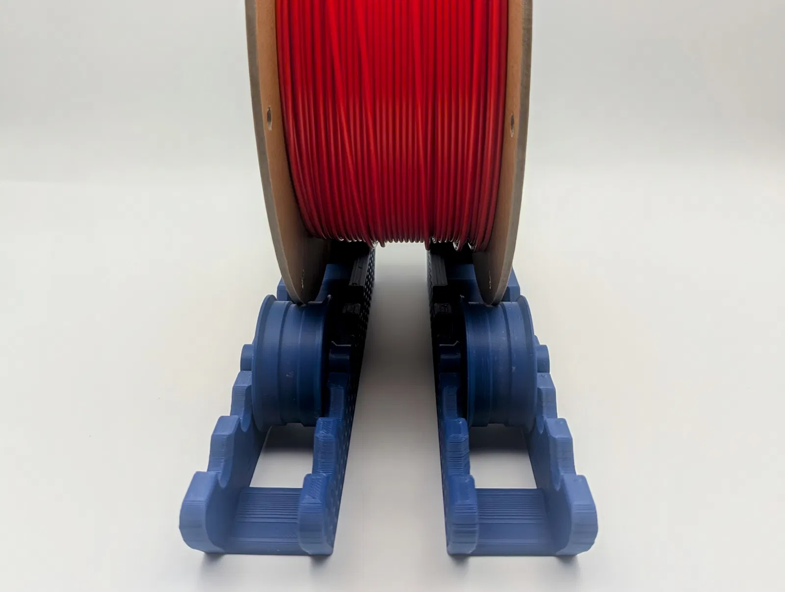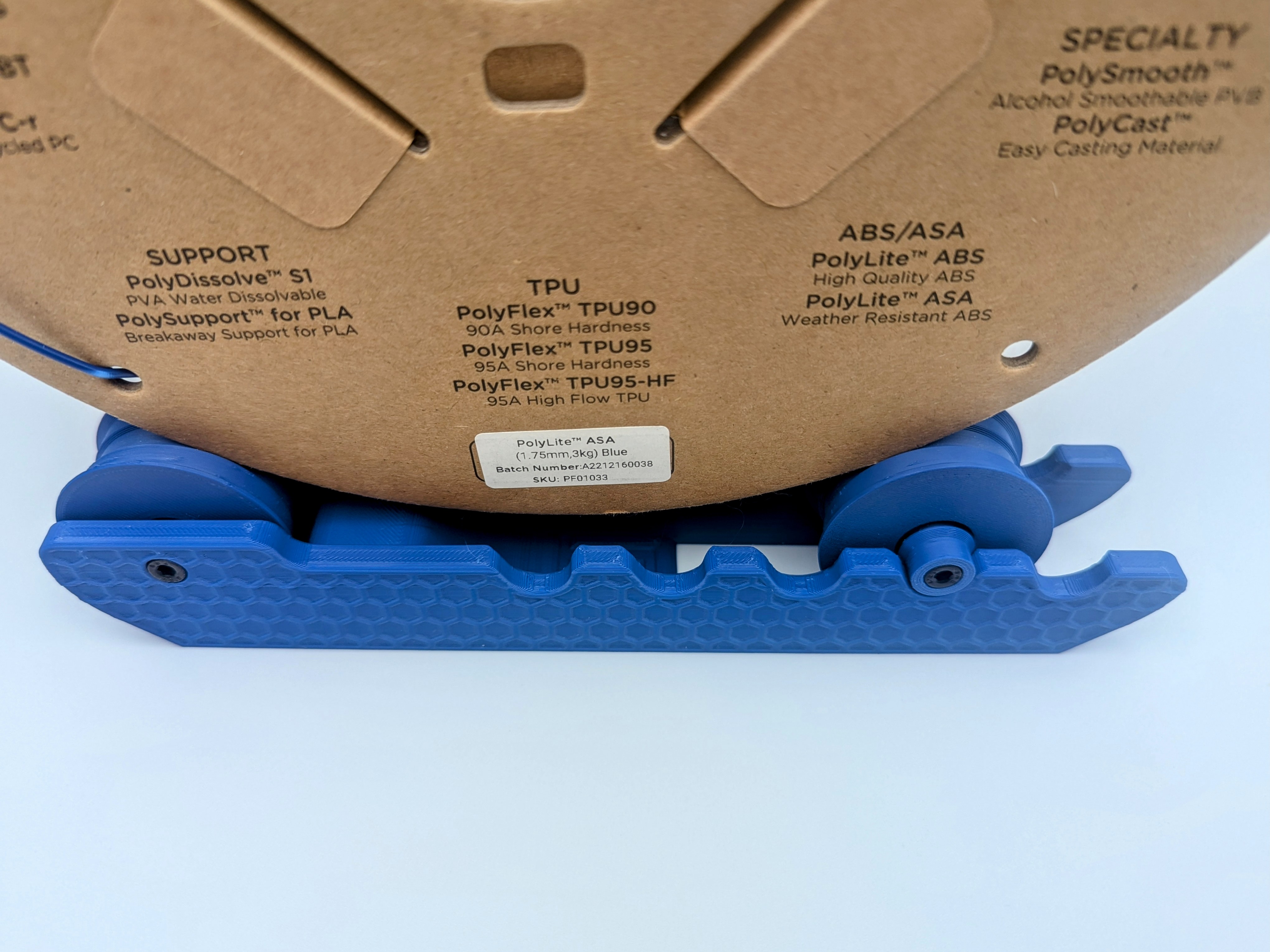 Nó dùng được với spool đường kính từ 100mm đến 300mm (spool 1kg thường khoảng 200mm). Mẫu này đã được test với spool PolyMaker 1kg, 3kg và 5kg, đồng thời đảm bảo cuộn luôn nằm ở góc tiếp tuyến (tangent angle) tốt với bánh xe, giúp spool không bị kéo tuột ra khỏi roller. In 2 roller riêng lẻ sẽ phù hợp nhiều bề ngang spool khác nhau, mà khi không dùng vẫn gọn, không chiếm chỗ.