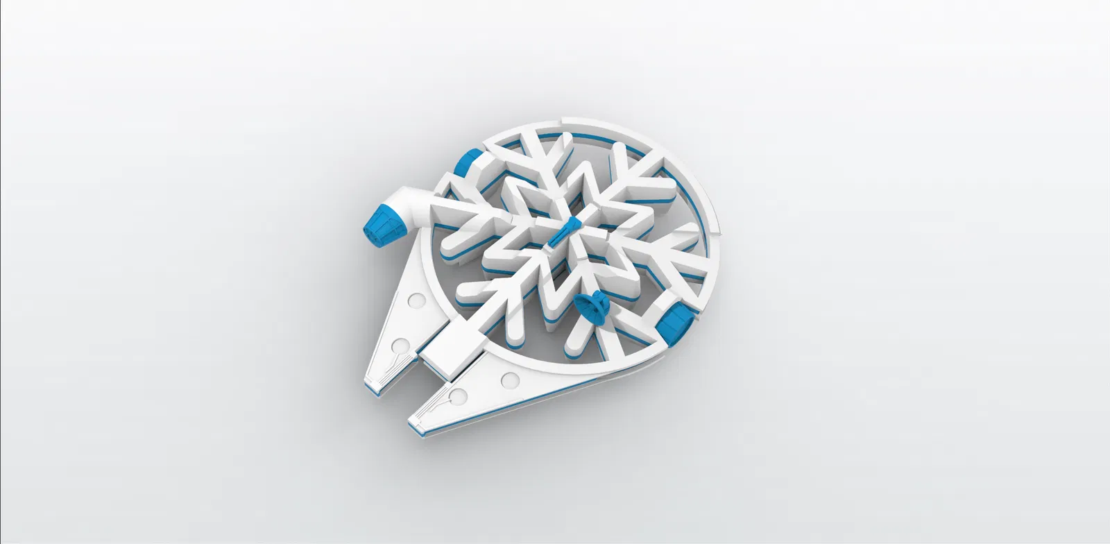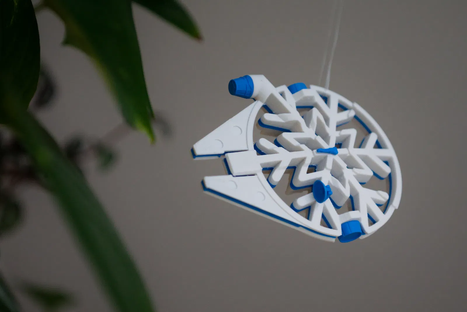 Ornament mùa đông phong cách Millennium Falcon (Star Wars) với chi tiết khoét bông tuyết. Thiết kế dài ~90 mm, bản tiêu chuẩn cần nozzle nhỏ cho các chi tiết gắn; có bản in được với nozzle 0.4 mm, khuyến nghị PLA 0.1 mm.