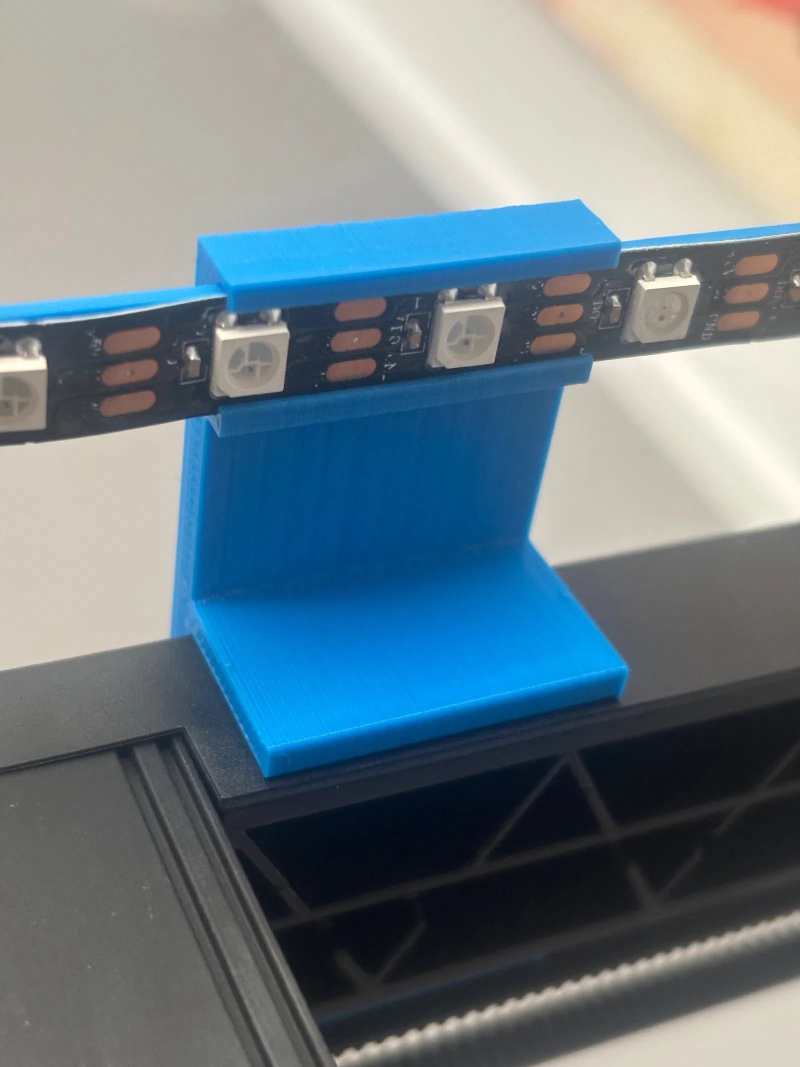 Giá đỡ giúp gắn dải LED rộng 10 mm lên phần trên khung máy in Ender 3 V3 SE/KE. Thiết kế gồm 2 móc, in layer 0.20 và không cần supports.