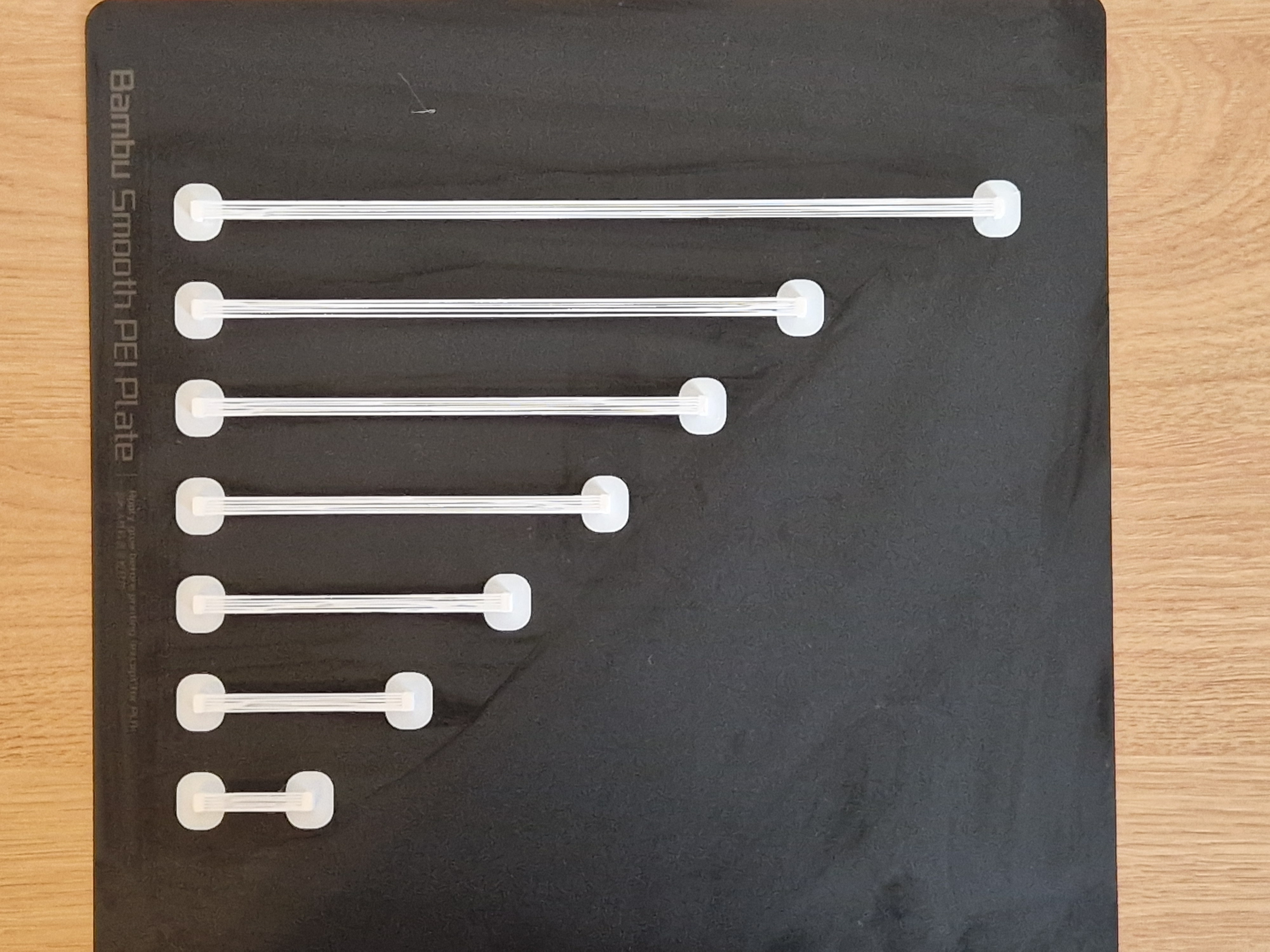 Mẫu test bridge đơn giản, in nhanh (~10 phút) và chỉ tốn khoảng 2g vật liệu. Tối ưu cho 0.2mm layer height và 0.4mm line width, có đủ bridge 25–200mm để fine-tune bridging. Khuyến nghị dùng brim.