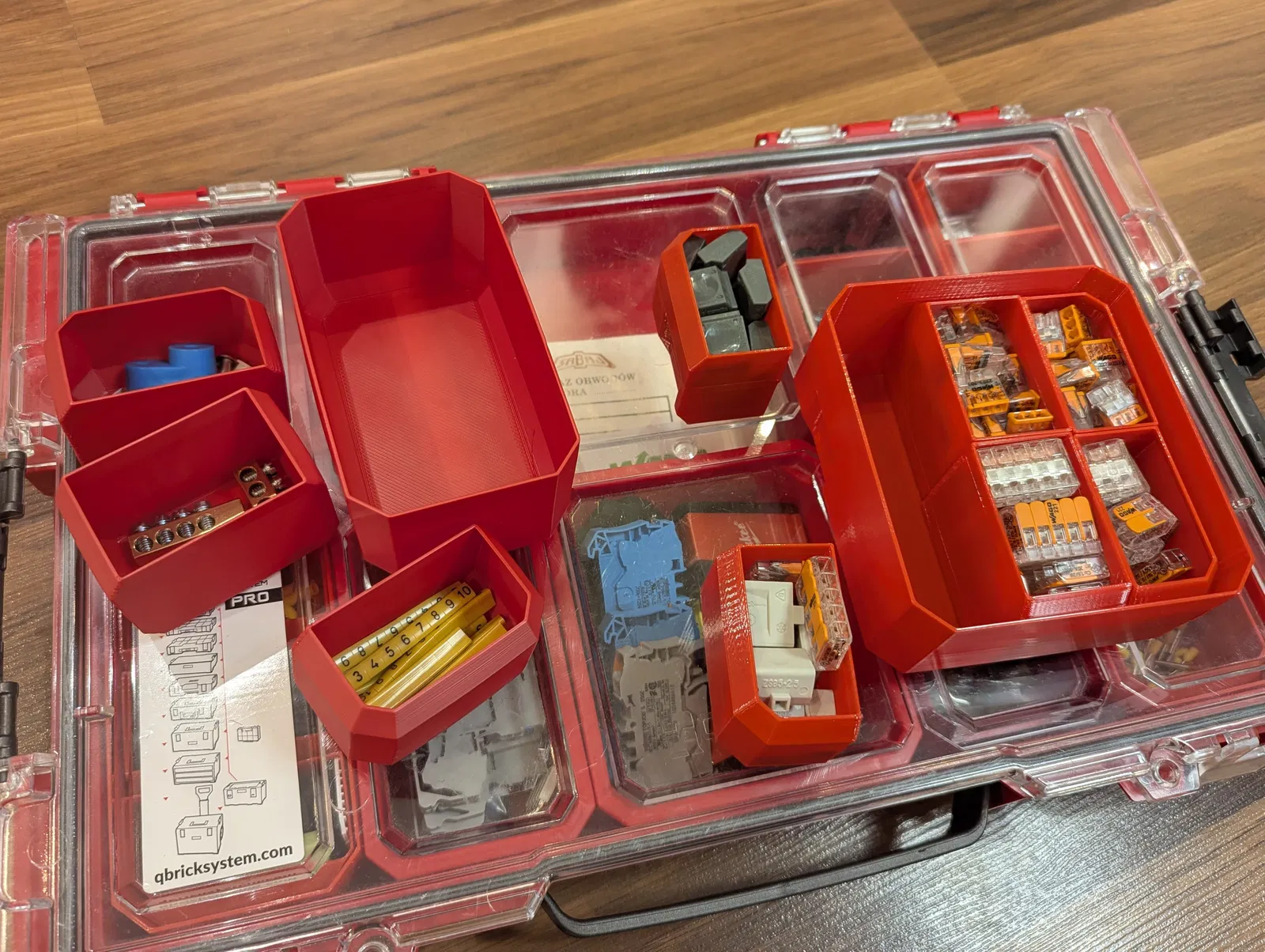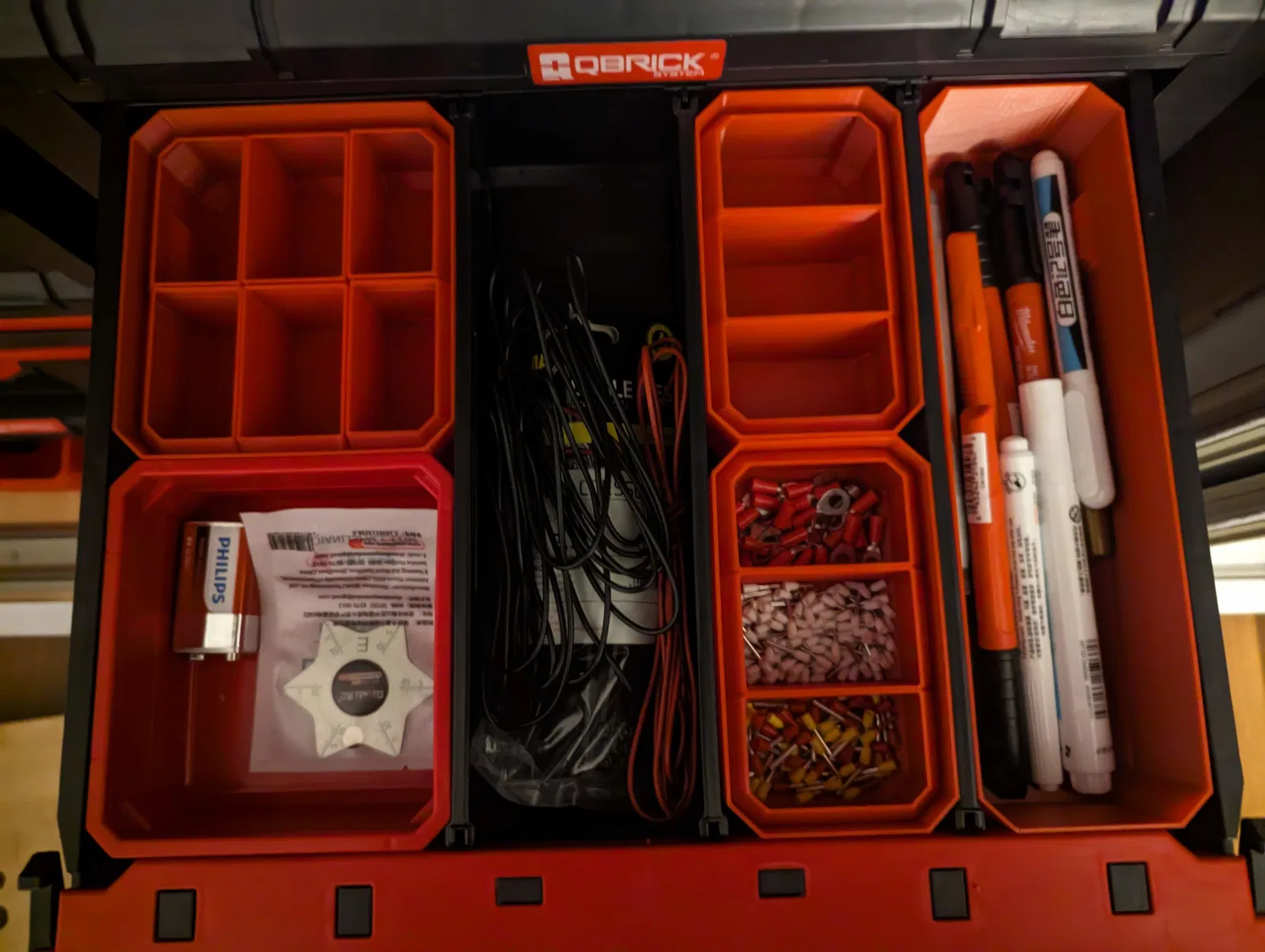 Mình dựng các bucket để tối đa hoá không gian bên trong các organizer và drawer của Qbrick. Dĩ nhiên, như vậy thì sẽ phải bỏ qua ý tưởng treo bucket lên tường. Tuy nhiên, chúng đã được tối ưu để khớp với các phần hõm trên nắp của organizer Qbrick, và phần miệng hở phía trên đã được bịt kín.