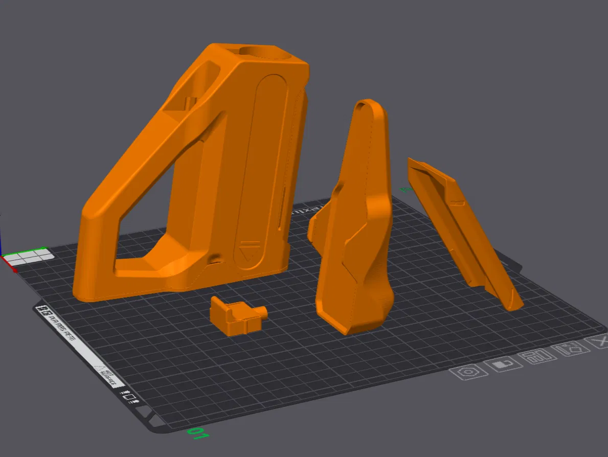 Mục tiêu của mình cho dự án này là giữ cho báng nhìn giống báng Torrent “zin” nhất có thể, đồng thời chỉnh kích thước cho hợp với buffer tube hơn. Và như mọi khi, mình muốn nó dễ in, dễ lắp, và rẻ nhất có thể. Báng gồm bốn chi tiết in và không cần phần cứng (no hardware) để lắp ráp. Phần thân chính của báng có support tích hợp sẵn ở phía sau bản in, cũng như ở vị trí lắp miếng khóa, nên không cần thêm support nào khác cho thân hoặc bất kỳ chi tiết nào còn lại của báng.
