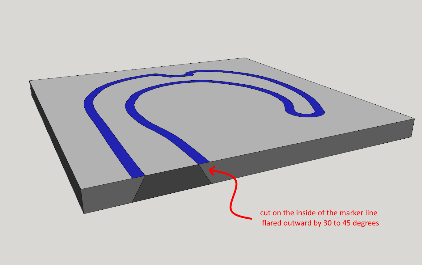 Dùng dao rọc giấy cắt mút neoprene ở phía trong đường marker, và vát mép cắt loe ra ngoài khoảng 30–45 độ