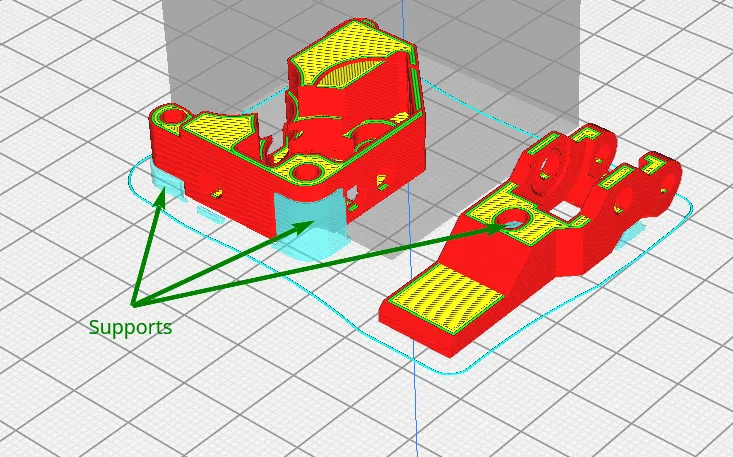 Thông số in khuyến nghị: nozzle 0.4mm, layer thickness 0.1mm, tốc độ in 40mm/s, in không cần support (trừ một số chi tiết — xem hình "supports").