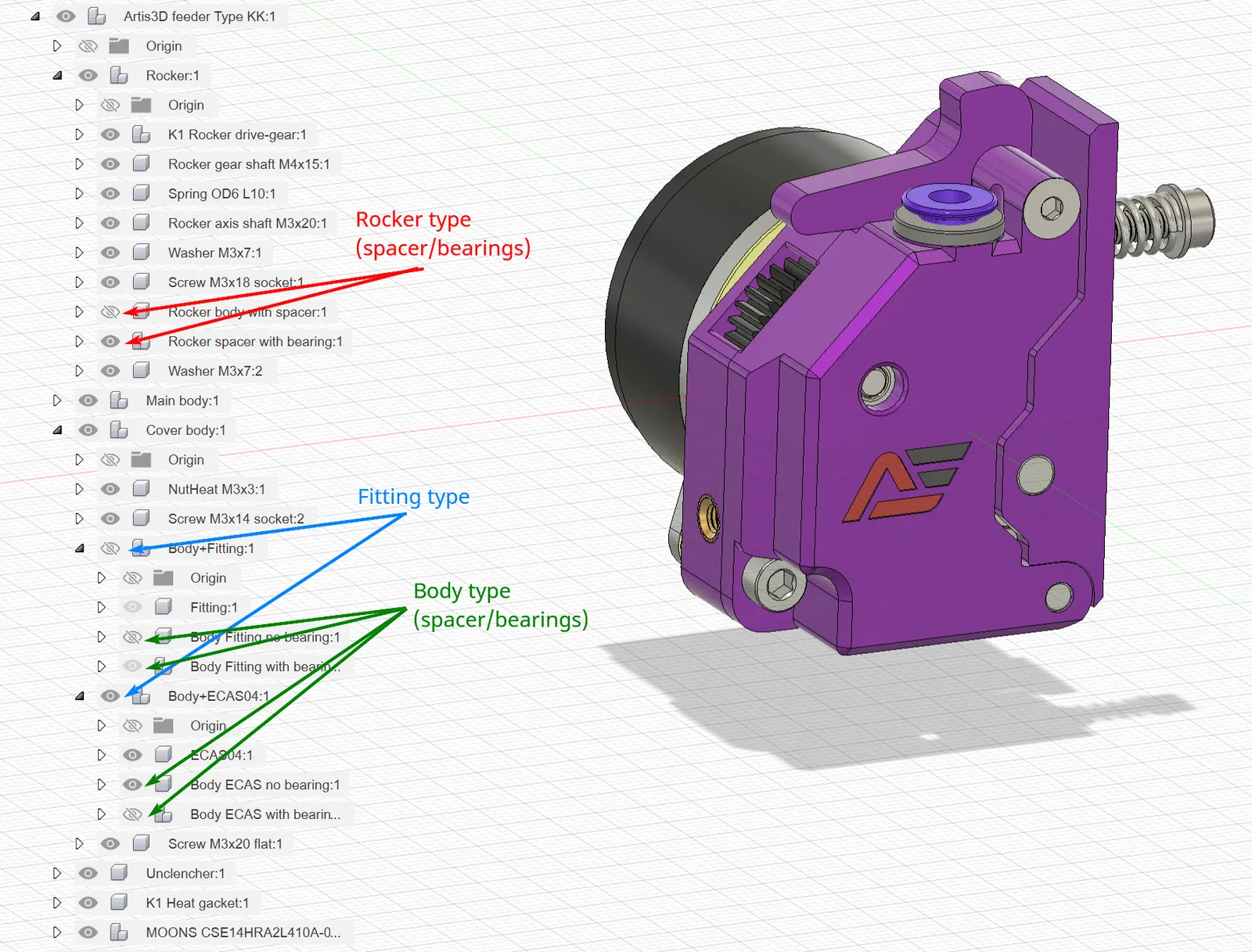 Feeder Artis3D Type KK dựa trên extruder zin Creality K1/K1MAX, giúp cải thiện lực kẹp và giảm tình trạng quá nhiệt. Có bản KKb dùng stock bracket và KKm body custom, hỗ trợ ECAS04/Fitting, tùy chọn có/không bearing.