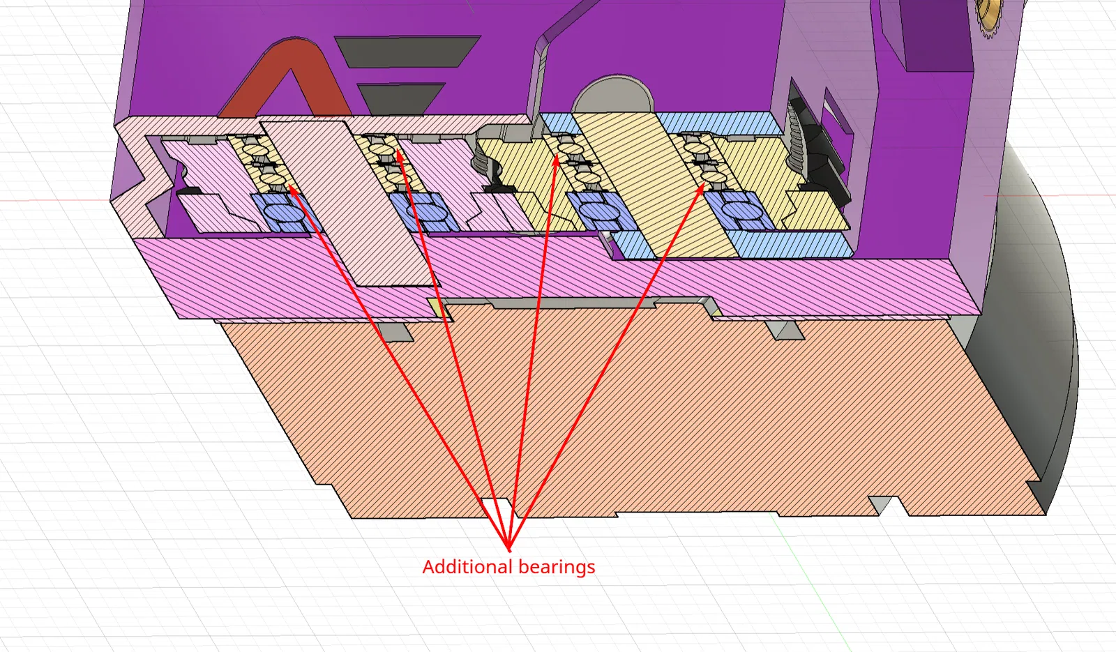 - Có thêm bearing. Giúp cơ cấu cứng cáp hơn. Cần 2-4 bearing MR84ZZ (xem hình "bearings").